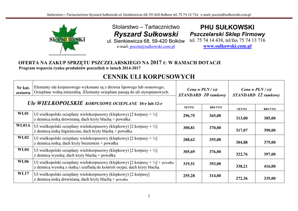 Stolarstwo—Tartacznictwo Ryszard Sułkowski ul. Sienkiewicza 68, 59-420 Bolkow tel. 75 74 13 716 e-mail: [email protected] PHU SUŁKOWSKI Stolarstwo – Tartacznictwo Ryszard Sułkowski Pszczelarski Sklep Firmowy ul. Sienkiewicza 68, 59-420 Bolków tel. 75 74 14 438, tel/fax 75 74 13 716 www.sulkowski.com.pl e-mail: [email protected] OFERTA NA ZAKUP SPRZĘTU PSZCZELARSKIEGO NA 2017 r. W RAMACH DOTACJI Program wsparcia rynku produktów pszczelich w latach 2014-2017 CENNIK ULI KORPUSOWYCH Nr kat. Elementy ula korpusowego wykonane są z drewna lipowego lub sosnowego; zestawu Ocieplane wełną mineralną. |Elementy ocieplane pasują do uli styropianowych. Ule WIELKOPOLSKIE WL01 Cena w PLN / szt STANDARD 10 ramkowy Cena w PLN / szt STANDARD 12 ramkowy KORPUSOWE OCIEPLANE 10-r lub 12-r Ul wielkopolski ocieplany wielokorpusowy (klepkowy) [2 korpusy + ½] z dennicą niską drewnianą; dach kryty blachą + powałka WL01A Ul wielkopolski ocieplany wielokorpusowy (klepkowy) [2 korpusy + ½] z dennicą niską higieniczna; dach kryty blachą + powałka WL02 Ul wielkopolski ocieplany wielokorpusowy (klepkowy) [2 korpusy + ½] z dennicą niską; dach kryty brezentem + powałka WL04 Ul wielkopolski ocieplany wielokorpusowy (klepkowy) [2 korpusy + ½] z dennicą wysoką; dach kryty blachą + powałka WL06 Ul wielkopolski ocieplany wielokorpusowy (klepkowy) [2 korpusy + ½] + powałka z dennicą wysoką z siatką i szufladą do kontroli osypu; dach kryty blachą WL17 Ul wielkopolski ocieplany wielokorpusowy (klepkowy) [2 korpusy] z dennicą niską drewnianą; dach kryty blachą + powałka 1 NETTO BRUTTO 296,75 365,00 300,81 370,00 288,62 355,00 305,69 376,00 319,51 393,00 255,28 314,00 NETTO BRUTTO 313,00 385,00 317,07 390,00 304,88 375,00 322,76 397,00 338,21 416,00 272,36 335,00 Stolarstwo—Tartacznictwo Ryszard Sułkowski ul. Sienkiewicza 68, 59-420 Bolkow tel. 75 74 13 716 e-mail: [email protected] WL17A Ul wielkopolski ocieplany wielokorpusowy (klepkowy) [2 korpusy] z dennicą niską higieniczna; dach kryty blachą + powałka WL18 Ul wielkopolski ocieplany wielokorpusowy (klepkowy) [2 korpusy] z dennicą wysoką; dach kryty blachą + powałka WL20 Ul wielkopolski ocieplany wielokorpusowy (klepkowy) [2 korpusy] + powałka z dennicą wysoką z siatką i szufladą do kontroli osypu; dach kryty blachą WL22 Ul wielkopolski ocieplany wielokorpusowy (klepkowy) [2 korpusy] z dennicą niską drewniana; dach kryty brezentem + powałka WL40 Ul wielkopolski ocieplany wielokorpusowy (klepkowy) [2 korpusy + 1/2] z dennicą niską drewniana; dach kryty blachą WL40A Ul wielkopolski ocieplany wielokorpusowy (klepkowy) [2 korpusy + 1/2] z dennicą niską higieniczna; dach kryty blachą WL41 Ul wielkopolski ocieplany wielokorpusowy (klepkowy) [2 korpusy + 1/2] z dennicą wysoką; dach kryty blachą WL43 Ul wielkopolski ocieplany wielokorpusowy (klepkowy) [2 korpusy ] z dennicą niską drewnianą; dach kryty blachą WL43A Ul wielkopolski ocieplany wielokorpusowy (klepkowy) [2 korpusy ] z dennicą niską higieniczną; dach kryty blachą WL44 Ul wielkopolski ocieplany wielokorpusowy (klepkowy) [2 korpusy ] z dennicą wysoką; dach kryty blachą WL45 Ul wielkopolski ocieplany wielokorpusowy (klepkowy) [2 korpusy ] z dennicą wysoką z siatką i szufladą do kontroli osypu; dach kryty blachą Ule WIELOKORPUSOWE typu wielkopolskieg OCIEPLANE WL07 259,35 319,00 268,29 330,00 284,55 350,00 264,23 325,00 276,42 340,00 280,49 345,00 285,37 351,00 234,15 288,00 238,21 293,00 243,09 299,00 256,91 316,00 STANDARD 10 ramkowy NETTO BRUTTO Ul wielokorpusowy wielkopolski ocieplany (klepkowy) [3 korpusy gn.] z dennicą niską drewnianą; dach kryty blachą + powałka 318,70 392,00 WL07A Ul wielokorpusowy wielkopolski ocieplany (klepkowy) [3 korpusy gn.] z dennicą niską higieniczną; dach kryty blachą + powałka 322,76 397,00 2 276,42 340,00 282,93 348,00 298,37 367,00 267,48 329,00 292,68 360,00 296,75 365,00 301,63 371,00 246,34 303,00 250,41 308,00 255,28 314,00 269,92 332,00 STANDARD 12 ramkowy NETTO BRUTTO 336,59 414,00 340,65 419,00 Stolarstwo—Tartacznictwo Ryszard Sułkowski ul. Sienkiewicza 68, 59-420 Bolkow tel. 75 74 13 716 e-mail: [email protected] WL08 WL10 Ul wielokorpusowy wielkopolski ocieplany (klepkowy) [3 korpusy gn.] z dennicą wysoką; dach kryty blachą + powałka 328,46 404,00 Ul wielokorpusowy wielkopolski ocieplany (klepkowy) [3 korpusy gn.] + powałka z dennicą wysoką z siatką i szufladą do kontroli osypu; dach kryty blachą 343,90 423,00 Ule WIELKOPOLSKIE WL24 WL25 WL27 KORPUSOWE JEDNOŚCIENNE (nieocieplane )(10-r) Ul wielkopolski jednościenny wielokorpusowy (10-r) [2 korpusy + ½] + powałka dennica niska z siatką i szufladą do kontroli osypu; dach blaszany Ul wielkopolski jednościenny wielokorpusowy (10-r) [2 korpusy + ½] + powałka dennica wysoka; dach blaszany Ul wielkopolski jednościenny wielokorpusowy (10-r) [2 korpusy + ½] + powałka dennica wysoką z siatką i szufladą do kontroli osypu; dach blaszany 345,53 425,00 361,79 445,00 STANDARD NETTO BRUTTO 276,43 340,00 287,80 301,63 354,00 371,00 ULE WYKONANE SĄ ZGODNIE Z WSZYSTKIMI OBOWIĄZUJĄCYMI STANDARDAMI. Nr kat. Elementy ula korpusowego wykonane są z drewna lipowego lub sosnowego; zestawu Ocieplane wełną mineralną. Elementy ocieplane pasują do uli styropianowych. Ule WIELOKORPUSOWE typu OSTROWSKIEJ OCIEPLANE (10-r) Ul Ostrowskiej ocieplany wielokorpusowy (3 korpusy) + powałka z dennicą niską drewnianą; dach kryty blachą WO1A Ul Ostrowskiej ocieplany wielokorpusowy (3 korpusy) + powałka z dennicą niską higieniczną; dach kryty blachą WO2 Ul Ostrowskiej ocieplany wielokorpusowy (3 korpusy) + powałka z dennicą niską drewnianą; dach kryty brezentem WO3 Ul Ostrowskiej ocieplany wielokorpusowy (3 korpusy) + powałka z dennicą wysoką; dach kryty blachą WO13 Ul Ostrowskiej ocieplany wielokorpusowy (3 korpusy) + powałka z dennicą wysoką z siatką i szufladą do kontroli osypu; dach kryty blachą WO40 Ul Ostrowskie