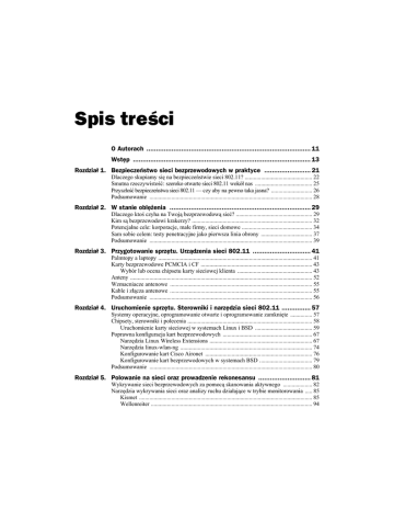 Spis treści O Autorach ..................................................................................... 11 Wstęp ............................................................................................ 13 Rozdział 1. Bezpieczeństwo sieci bezprzewodowych w praktyce ........................ 21 Dlaczego skupiamy się na bezpieczeństwie sieci 802.11? .............................................. 22 Smutna rzeczywistość: szeroko otwarte sieci 802.11 wokół nas ....................................... 25 Przyszłość bezpieczeństwa sieci 802.11 — czy aby na pewno taka jasna? ............................ 26 Podsumowanie ............................................................................................................... 28 Rozdział 2. W stanie oblężenia ......................................................................... 29 Dlaczego ktoś czyha na Twoją bezprzewodową sieć? .................................................... 29 Kim są bezprzewodowi krakerzy? .................................................................................. 32 Potencjalne cele: korporacje, małe firmy, sieci domowe ................................................ 34 Sam sobie celem: testy penetracyjne jako pierwsza linia obrony ................................... 37 Podsumowanie ............................................................................................................... 39 Rozdział 3. Przygotowanie sprzętu. Urządzenia sieci 802.11 .............................. 41 Palmtopy a laptopy ......................................................................................................... 41 Karty bezprzewodowe PCMCIA i CF ............................................................................ 43 Wybór lub ocena chipsetu karty sieciowej klienta ................................................... 43 Anteny ............................................................................................................................ 52 Wzmacniacze antenowe ................................................................................................. 55 Kable i złącza antenowe ................................................................................................. 55 Podsumowanie ............................................................................................................... 56 Rozdział 4. Uruchomienie sprzętu. Sterowniki i narzędzia sieci 802.11 ............... 57 Systemy operacyjne, oprogramowanie otwarte i oprogramowanie zamknięte ............... 57 Chipsety, sterowniki i polecenia ..................................................................................... 58 Uruchomienie karty sieciowej w systemach Linux i BSD ....................................... 59 Poprawna konfiguracja kart bezprzewodowych ............................................................. 67 Narzędzia Linux Wireless Extensions ...................................................................... 67 Narzędzia linux-wlan-ng .......................................................................................... 74 Konfigurowanie kart Cisco Aironet ......................................................................... 76 Konfigurowanie kart bezprzewodowych w systemach BSD .................................... 79 Podsumowanie ............................................................................................................... 80 Rozdział 5. Polowanie na sieci oraz prowadzenie rekonesansu ........................... 81 Wykrywanie sieci bezprzewodowych za pomocą skanowania aktywnego .................... 82 Narzędzia wykrywania sieci oraz analizy ruchu działające w trybie monitorowania ..... 85 Kismet ...................................................................................................................... 85 Wellenreiter .............................................................................................................. 94 4 Wi-Foo. Sekrety bezprzewodowych sieci komputerowych Airtraf ....................................................................................................................... 94 Gtkskan .................................................................................................................... 97 Airfart ....................................................................................................................... 97 Mognet ..................................................................................................................... 98 WifiScanner ............................................................................................................. 99 Inne programy i skrypty wiersza poleceń ............................................................... 101 Narzędzia wykrywania sieci oraz rejestrowania ruchu dla systemów BSD ........... 106 Narzędzia korzystające z programu iwlist z opcją scan ................................................ 109 Narzędzia mierzące natężenie sygnału radiowego ....................................................... 111 Podsumowanie ............................................................................................................. 113 Rozdział 6. Budowanie arsenału. Narzędzia specjalistyczne .............................. 115 Narzędzia służące do łamania szyfrów ......................................................................... 116 Narzędzia łamiące zabezpieczenie WEP ................................................................ 117 Narzędzia wykradające klucze WEP przechowywane w komputerach .................. 123 Narzędzia wprowadzające do sieci ruch umożliwiający szybsze złamanie zabezpieczenia WEP ............................................................................................ 124 Narzędzia atakujące systemy uwierzytelniania 802.1x .............................................. 125 Narzędzia służące do generowania ramek sieci bezprzewodowych ..
