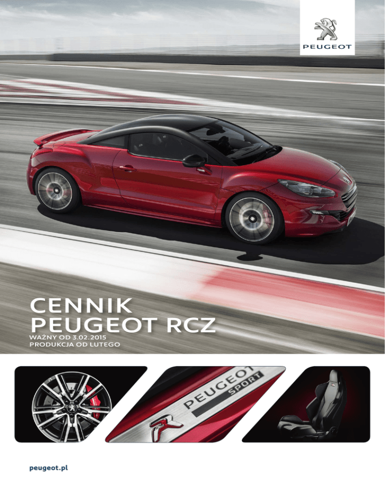 CENNIK PEUGEOT RCZ WAŻNY OD 3.02.2015 PRODUKCJA OD LUTEGO peugeot.pl CENY COUPÉ SKRZYNIA BIEGÓW RCZ RCZ R 1,6 THP 155 KM M6 104 000 zł – 1,6 THP 155 KM A6 108 500 zł – 1,6 THP 200 KM M6 113 000 zł – M6 – 153 000 zł 1,6 THP 270 KM M6 – manualna skrzynia biegów o 6 przełożeniach. A6 – automatyczna skrzynia biegów o 6 przełożeniach. WYPOSAŻENIE BEZPIECZEŃSTWO I ZABEZPIECZENIA ANTYKRADZIEŻOWE RCZ RCZ R ABS ze wspomaganiem hamowania awaryjnego (AFU) S S ESP – system stabilizacji toru jazdy S S ASR Perfo – system kontroli trakcji z funkcją Hill Assist S S REF – elektroniczny rozdzielacz siły hamowania oś przednia/tylna S S Torsen – mechanizm różnicowy o ograniczonym poślizgu – S Poduszki czołowe dla kierowcy i pasażera (pasażera z możliwością dezaktywacji) S S Poduszki boczne w pierwszym rzędzie foteli S S Poduszki kurtynowe w pierwszym rzędzie foteli (dla wersji R tylko z Pakietem Skórzanym Nappa) S P Przednie pasy bezpieczeństwa z napinaczami i ogranicznikami siły napięcia S S Pasy bezpieczeństwa w drugim rzędzie 2-punktowe z ogranicznikami siły napięcia S S Kontrolki niezapiętych pasów z przodu i z tyłu z funkcją ostrzegania o wypięciu pasów S S Mocowania fotelika dziecięcego Isofix (x 2) w drugim rzędzie siedzeń S S Reflektory przednie halogenowe S – Przednie światła LED do jazdy dziennej S S System tylnego oświetlenia z funkcją ostrzegania innych użytkowników drogi przy nagłym hamowaniu pojazdu S S Centralny zamek sterowany pilotem: – superzamek z selektywnym otwieraniem auta – dwa piloty zdalnego sterowania – blokowanie drzwi podczas ruszania S S Czujniki parkowania z tyłu Czujniki parkowania z przodu Immobiliser S S 1300 zł 1300 zł S S 1500 zł 1500 zł Wspomaganie kierownicy progresywne S S Regulacja kolumny kierownicy manualna w dwóch płaszczyznach S S Tempomat i ogranicznik prędkości ze sterowaniem z kolumny kierownicy S S Elektrycznie sterowane szyby boczne (sterowanie sekwencyjne z blokadą przycięcia) S S Lusterka boczne sterowane, podgrzewane i składane elektrycznie + zintegrowane migacze S S Schowki otwarte: – po stronie kierowcy w desce rozdzielczej – na desce rozdzielczej poniżej radia (brak przy wyborze nawigacji WIP Com 3D) – wnęka poniżej popielniczki – wnęka w tylnej części konsoli środkowej S S Schowek w desce rozdzielczej przed pasażerem, zamykany, podświetlany, klimatyzowany S S Zamykana i podświetlana popielniczka w konsoli centralnej + gniazdo 12 V w konsoli środkowej S S Uchwyt na napoje w konsoli środkowej S S Podłokietnik centralny z przodu z regulacją położenia + schowek S S Kieszenie w drzwiach bocznych S S Osłony przeciwsłoneczne z podświetlanymi lusterkami dla kierowcy i pasażera S S Alarm KOMFORT 2 OŚWIETLENIE WNĘTRZA RCZ RCZ R Oświetlenie wnętrza: – 1 lampka centralna + 2 lampki do czytania w konsoli sufitowej z przodu – oświetlenie progów z przodu – oświetlenie bagażnika (x 2) S S Oświetlenie ambiente: – 1 dioda LED w konsoli sufitowej z przodu – oświetlenie miejsca na nogi z przodu S S Klimatyzacja automatyczna dwustrefowa: – filtr przeciwpyłkowy z węglem aktywnym – klimatyzowany schowek w desce rozdzielczej przed pasażerem S S Tylna szyba ogrzewana S S Fotele przednie sportowe z zintegrowanymi zagłówkami (dla wersji R kubełkowe): – manualna regulacja wzdłużna foteli – manualna regulacja pochylenia oparć – manualna regulacja wysokości foteli S S Tylna kanapa z zintegrowanymi zagłówkami i składanym oparciem S S Uchwyty (x 4) do mocowania bagażu w bagażniku S S Siatka mocująca bagaże w bagażniku S S Schowek pod podłogą bagażnika S S OGRZEWANIE I KLIMATYZACJA SIEDZENIA BAGAŻNIK SYSTEMY AUDIO I KOMUNIKACJI Komputer pokładowy S S Monochromatyczny wyświetlacz graficzny C- na desce rozdzielczej (brak przy wyborze nawigacji) S – 1000 zł – S S WIP Nav 2: – nawigacja satelitarna z mapą Europy na dysku twardym – kolorowy wyświetlacz LCD 7" na desce rozdzielczej – powiększony monochromatyczny wyświetlacz graficzny na tablicy zegarów – gniazdo AUX w podłokietniku centralnym z przodu 3300 zł S System Hi-Fi JBL: – 6 głośników JBL: 4 przednie + 2 tylne – amplituner 240 W JBL 1900 zł 1900 zł S/– – Dźwignia zmiany biegów wykończona skórą (skrzynia manualna) lub chromem (skrzynia automatyczna) S S Aluminiowe nakładki na pedały S S Klamki wewnętrzne chromowane S S Podsufitka w kolorze czarnym S S Tablica zegarów: – cyferblaty z szaro-grafitowym tłem i białym podświetleniem – chromowane wykończenie zegarów – mały monochromatyczny wyświetlacz graficzny (niedostępny dla silnika 1,6 THP 200 KM) S S Deska rozdzielcza z konsolą w kolorze czarnym Nacre S S Tapicerka siedzeń tkaninowa S – Tapicerka siedzeń skóra Nappa / alcantara Storm – S Przednia szyba akustyczna S S Szyby przednia i boczne barwione S S System Peugeot Connect SOS & Assistance (niedostępny z WIP Com 3D) WIP Bluetooth: – radio CD z MP3 + 6 głośników (4 przednie + 2 tylne) – sterowanie z kolumny kierownicy – zestaw głośnomówiący Bluetooth – gniazdo USB w podłokietniku centralnym z przodu – funkcja przesyłania muzyki Streaming Audio STYL WEWNĘTRZNY Kierownica 3-ramienna skórzana sportowa z chromowanym wykończeniem (niedostępna dla silnika 1,6 THP 200 KM) STYL ZEWNĘTRZNY Tylna szyba przyciemniana Dach w kolorze czarnym [z wyjątkiem koloru nadwozia szary Haria – dach jest w kolorze nadwozia] S S S/– S/– 3 STYL ZEWNĘTRZNY RCZ RCZ R Dach pokryty karbonem w kolorze czarnym błyszczącym 3600 zł 3600 zł Dach pokryty karbonem w kolorze czarnym satynowym (wyklucza opcję – naklejka MyRCZ A) 3600 zł 3600 zł Klamki zewnętrzne w kolorze nadwozia S S Lusterka boczne w kolorze nadwozia S S 250 zł 250 zł Lusterka boczne w kolorze czarnym błyszczącym (z wyjątkiem koloru czarny Perla Nera) – (element Pakietu Black) Ozdobne listwy progowe S S 1000 zł – 