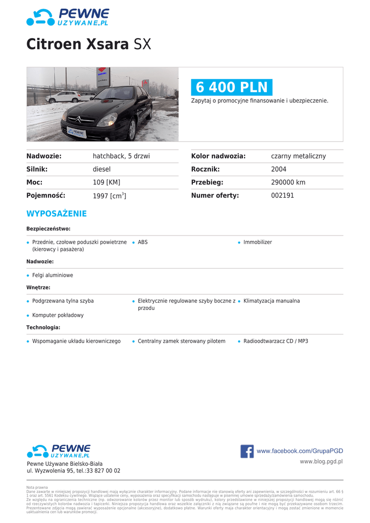 Citroen Xsara SX 6 400 PLN Zapytaj o promocyjne finansowanie i ubezpieczenie. Nadwozie: hatchback, 5 drzwi Kolor nadwozia: czarny metaliczny Silnik: diesel Rocznik: 2004 Moc: 109 [KM] Przebieg: 290000 km Pojemność: 1997 [cm ] Numer oferty: 002191 3 WYPOSAŻENIE Bezpieczeństwo: Przednie, czołowe poduszki powietrzne (kierowcy i pasażera) ABS Immobilizer Elektrycznie regulowane szyby boczne z przodu Klimatyzacja manualna Centralny zamek sterowany pilotem Radioodtwarzacz CD / MP3 Nadwozie: Felgi aluminiowe Wnętrze: Podgrzewana tylna szyba Komputer pokładowy Technologia: Wspomaganie układu kierowniczego Pewne Używane Bielsko-Biała ul. Wyzwolenia 95, tel.:33 827 00 02 www.blog.pgd.pl Nota prawna Dane zawarte w niniejszej propozycji handlowej mają wyłącznie charakter informacyjny. Podane informacje nie stanowią oferty ani zapewnienia, w szczególności w rozumieniu art. 66 § 1 oraz art. 5561 Kodeksu cywilnego. Wiążące ustalenie ceny, wyposażenia oraz specyfikacji samochodu następuje w pisemnej umowie sprzedaży/zamówienia samochodu. Ze względu na ograniczenia techniczne (np. odwzorowanie kolorów przez monitor lub sposób wydruku), kolory przedstawione w niniejszej propozycji handlowej mogą się różnić od rzeczywistych kolorów nadwozia i tapicerki. Niniejsza propozycja handlowa oraz wszelkie załączniki z nią związane są poufne i nie mogą być przekazywane osobom trzecim. Prezentowane zdjęcia mogą zawierać wyposażenie opcjonalne (akcesoryjne), dodatkowo płatne. Warunki oferty maja charakter orientacyjny i mogą zostać zmienione w momencie uaktualnienia cen lub warunków promocji.