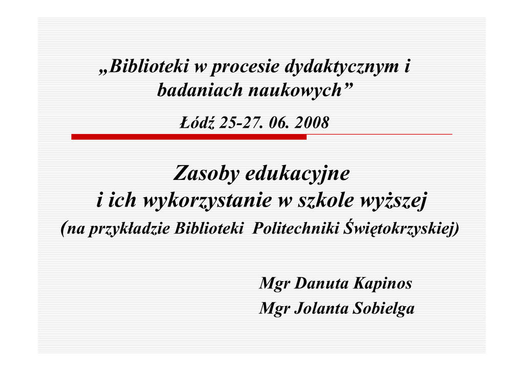 „Biblioteki w procesie dydaktycznym i badaniach naukowych” Łódź 25-27. 06. 2008 Zasoby edukacyjne i ich wykorzystanie w szkole wyŜszej (na przykładzie Biblioteki Politechniki Świętokrzyskiej) Mgr Danuta Kapinos Mgr Jolanta Sobielga Bibliotekarze Czy bibliotekarze posiadają dostateczną wiedzę i umiejętności w zakresie znajomości narzędzi i metod dostarczania informacji naukowej? Kształcenie bibliotekarzy Program kształcenia akademickiego bibliotekarzy i pracowników informacji naukowej w zakresie wyszukiwania źródeł informacji wg MNiSW obejmuje: Stosowanie heurystyki informacyjnej Posługiwanie się narzędziami do wyszukiwania informacji w sieci Rozpoznawanie informacji Selekcjonowanie i dobór źródeł Świadome konstruowanie efektywnych strategii wyszukiwania informacji Stosowanie metod, technik i wskaźników oceny rezultatów wyszukiwania Biblioteka Czy biblioteka posiada właściwe zaplecze do wykorzystywania zasobów i narzędzi informacyjnych? Budownictwo biblioteczne Infrastruktura informatyczna – Program Rozwoju Infrastruktury Informatycznej Nauki na lata 20072013. MNiSW 2007 Zasoby Zasób - 257 000 jed. inw. w wersji papierowej Bazy - Nukat, BazTech, Centralny Katalog Czasopism Zagranicznych, Lista AtoZ, SpringerLink, ScienceDirect, eIFL-EBSCO, e-wydawnictwa PŚk, e-ksiąŜki, BZCZ, Przewodnik Bibliograficzny, Lex-Omega, Katalog Norm Polskich, Dorobek Naukowy Pracowników PŚk, SYNABA, Espace Preces, Espace DE, Denarom, Espace AT, Espace Access Preces, Espace Access EP-B, Espace Bulletin, Globalpat Infrastruktura informatyczna i baza techniczna 6040 m² powierzchni uŜytkowej bez sztywnych podziałów na czytelnie, magazyny, wypoŜyczalnię, 16 kabin do pracy indywidualnej i zespołowej, oddzielne pomieszczenie do czytania prasy, wolny dostęp do 80% zasobów bibliotecznych 95 komputerów dla uŜytkowników pracujących w sieci, z pakietem biurowym Microsoft Office, z moŜliwością robienia wydruków i zapisywania dokumentów na dysku sieciowym, 2 SelfCheck’s, 6 kserografów w tym 1 do formatu „O”, 4 skanery, urządzenie doładowujące karty biblioteczne, wydzielone miejsca do wypoczynku, nowoczesne meble, duŜo zieleni, sala konferencyjna, sala dydaktyczna UŜytkownicy Czy odbiorcy informacji są przygotowani do: Efektywnego wyszukiwania informacji Krytycznej oceny informacji i ich źródeł Selekcji informacji Efektywnego wykorzystania informacji do osiągnięcia określonego celu. Działania BG na rzecz podnoszenia umiejętności informacyjnych uŜytkowników Lekcje z przysposobienia bibliotecznego Profesjonalna strona www.lib.tu.kielce.pl Instrukcje wyszukiwawcze Informatory Szkolenia specjalistyczne dla uŜytkowników i personelu bibliotecznego Wycieczki do biblioteki Wolny dostęp do zbiorów Przyjazny personel Ankieta dla studentów BG – metodyka badań Pytania 1-4 - obejmują zagadnienia związane ze sposobem pozyskiwania źródeł informacji oraz rodzajem i formą ich uŜytkowania Pytania 5-6 – dotyczą pomiaru efektywności procesu uŜytkowania zasobów edukacyjnych przez studentów Wykorzystanie współczynnika zmienności w celu zobrazowania stopnia zróŜnicowania badanych zagadnień w przekrojach: - według źródeł wyszukiwania potrzebnych informacji - według form uŜytkowania źródeł - według rodzaju uŜytkowanych źródeł - według miejsc uŜytkowania źródeł Syntetyczna charakterystyka studentów jako uŜytkowników informacji Analiza danych z ankiet Skąd czerpiesz informacje o potrzebnych źródłach Baza "Lektury" 10% Katalogi innych bibliotek 11% Inne 9% Nukat Caro 7% Wykładow cy 18% Internet 16% Koledzy 14% Katalog BG 15% Jaką formę źródeł wykorzystujesz najczęściej Czasopisma elektroniczne 16% Czasopisma drukow ane 22% Innne 14% Ksiązki drukow ane 25% KsiąŜki elektroniczne 23% Jaki rodzaj źródeł wykorzystujesz najchętniej Matriały konferncyjne 15% Inne ksiązki 21% Inne źródła 13% Skrypty i pdręczniki 29% Artykuły z czasopism 22% W którym z podanych miejsc najczęściej korzystasz z zasobów BG W kabinie 25% Poza biblioteką 33% W dow olnym miejscu biblioteki 42% Pyt.5 Jeśli przyjąć, Ŝe ilość źródeł informacji o których wiemy Ŝe są niezbędne do zaliczenia semestru wynosi 100 jednostek , to ile jednostek z tej ilości udało Ci się pozyskać w BG PŚk a z ilu pozyskanych jednostek rzeczywiście skorzystał/eś/aś/ w przygotowaniu do sesji? (Efektywność uŜytkowania informacji przez studentów) Zaznacz, który z poniŜszych typów zachowań w trakcie studiowania jest w Twoim przypadku przewaŜający (poziom motywacji studentów w procesie uŜytkowania informacji Muszę 45% Jestem zainteresow any' 55% Syntetyczna charakterystyka studentów jako uŜytkowników informacji Informację o potrzebnych źródłach czerpią najczęściej od wykładowców Preferują informacje zawarte w skryptach i podręcznikach, głównie w formie drukowanej Najchętniej korzystają z z pomieszczeń bibliotecznych Korzystanie ze źródeł informacji nie wynika z zainteresowań studiowanymi problemami, lecz z przymusu wynikającego z obowiązku zdawania egzaminów i uzyskiwania zaliczeń Z zasobów biblioteki pozyskują 57% potrzebnych źródeł informacji, a wykorzystują 45% Ankieta dla pracowników PŚk – metodyka badań Pytania 1-4 obejmują zagadnienia związane ze sposobem pozyskiwania źródeł informacji oraz rodzajem i formą ich uŜytkowania Pytania 5-9 – dotyczą sugestii na temat form współpracy z biblioteką w zakresie gromadzenia zbiorów, oceny przydatności zasobów do zajęć dydaktycznych, wpływu zbiorów na rozwój naukowy Syntetyczna charakterystyka pracowników naukowo dydaktycznych jako uŜytkowników informacji Syntetyczna charakterystyka pracowników naukowo-dydaktycznych jako uŜytkowników informacji Poszukują potrzebnych informacji głównie w Internecie Preferują źródła w formie drukowanej, najczęściej są to artykuły z czasopism i materiały konferencyjne,