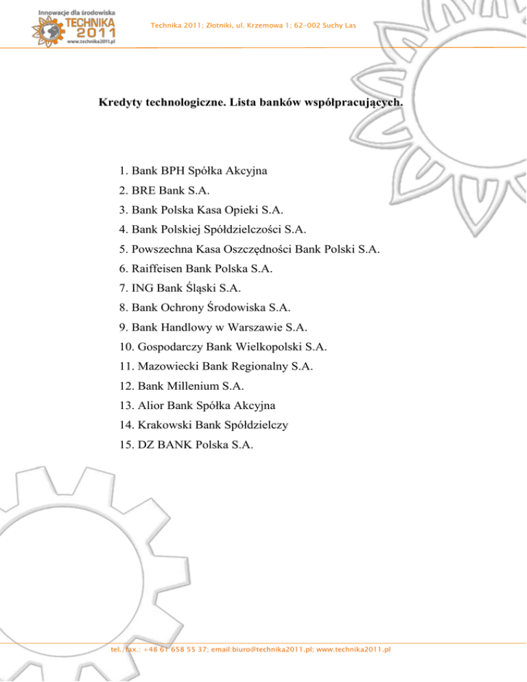 Technika 2011; Złotniki, ul. Krzemowa 1; 62-002 Suchy Las Kredyty technologiczne. Lista banków współpracujących. 1. Bank BPH Spółka Akcyjna 2. BRE Bank S.A. 3. Bank Polska Kasa Opieki S.A. 4. Bank Polskiej Spółdzielczości S.A. 5. Powszechna Kasa Oszczędności Bank Polski S.A. 6. Raiffeisen Bank Polska S.A. 7. ING Bank Śląski S.A. 8. Bank Ochrony Środowiska S.A. 9. Bank Handlowy w Warszawie S.A. 10. Gospodarczy Bank Wielkopolski S.A. 11. Mazowiecki Bank Regionalny S.A. 12. Bank Millenium S.A. 13. Alior Bank Spółka Akcyjna 14. Krakowski Bank Spółdzielczy 15. DZ BANK Polska S.A. tel./fax.: +48 61 658 55 37; email:[email protected]; www.technika2011.pl