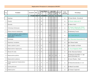 L.p. Przedmiot Specjalność Rok ECTS Bezpieczeństwo Wewnętrzne I st. niestacjonarne 2016/2017 sem. Zimowy ć w sem. Letni ćw w grupy ćw forma zaliczenia Prowadzący 2. STUDIA NIESTACJONARNE w jednostce macierzystej 1 Socjologia 1 2 10 zo dr Liana Hurska - Kowalczyk 2 Filozofia 1 2 10 zo dr Wacław Janikowski IF 3 Ekonomia 1 2 10 zo dr Janusz Jartyś 4 Technologia informacyjna 1 2 zo dr Tomasz Łukaszewski WNEiZ /ćw/; dr Jerzy Marcinkiewicz /ćw/ 5 Ochrona własności intelektualnej 1 1 zo dr Bartłomiej Toszek 6 Wykład monograficzny ogólnowydziałowy: Granice wpływu medycyny na społeczeństwo 1 2 zo prof. Marek Bulsa IS 7 Psychologia 1 3 zo prof. Sławomira Gruszewska UCE 8 Organizacja i zarządzanie 1 3 zo prof. Benon Szałek 9 Nauka o państwie i prawie 1 4 15 E prof. Joachim von Wedel 10 Bezpieczeństwo i higiena pracy 1 1 10 zo dr. Paweł Migdalski IHiSM 11 Historia XX wieku 1 4 15 zo dr hab. Marzenna Giedrojć 12 Bezpieczeństwo państwa 1 4 10 E dr Katarzyna Zawadzka /w/, mgr Sylwia Serwońska /ćw/ 13 Bezpieczeństwo społeczne 1 4 15 E dr Luiza Wojnicz - Smal 14 Polityka zagraniczna i bezpieczeństwa Polski 1 2 15 zo dr Dorota Kowalewska /w+ ćw/ 15 Systemy polityczne 1 4 15 E dr Marek Czerwiński 16 Podstawy prawa 1 2 15 zo dr Tomasz Czapiewski ć 15 2 8 15 10 15 ć 15 ć 10 2 2 Przedmiot 17 Problemy globalne współczesnego świata 18 Specjalność Rok ECTS L.p. sem. Zimowy ć w sem. Letni ćw w grupy ćw 2. STUDIA NIESTACJONARNE w jednostce macierzystej forma zaliczenia Prowadzący 1 3 15 zo dr Katarzyna Zawadzka Bezpieczeństwo narodowe i międzynarodowe 1 3 15 E prof. Janusz Piątek 19 Społeczeństwo obywatelskie 1 2 15 zo dr Katarzyna Zawadzka 20 Współczesne stosunki międzynarodowe 1 3 E prof. Janusz Ruszkowski 21 Współczesne konflikty międzynarodowe 1 3 E dr Marek Czerwiński /w+ćw/, mgr Robert Zawalski /ćw/ E prof. Andrzej Wojtaszak /w/ 1 gr mgr Arkadiusz Krawcewicz /1 gr ćw, gr. nr 1/; Małgorzata Tomczyk /1 gr ćw., gr. nr 2/ zo dr Marcin Orzechowski z e-lerning z e-lerning 15 15 22 Współczesne ruchy społeczne 1 2 15 23 Administracja publiczna 1 2 15 24 Szkolenie BHP 1 0 25 Szkolenie biblioteczne 1 0 Język angielski 2 27 Język niemiecki 2 28 Prawa człowieka 2 4 29 Kryminologia i kryminalistyka 2 5 30 Zwalczanie przestępczości 2 4 ć 15 15 2 2 4 2sem. zim; 4sem. let. 2sem. zim; 4sem. let. 26 ć l 15 l 15 2 zo mgr Jacek Witczak 1 gr ćw, mgr Iwona Niedzielska 1 gr ćw., ACKJ l 15 l 15 1 zo mgr Joanna Świątkowska ACKJ 10 zo dr Fuad Jomma 15 E dr Tomasz Czapiewski E dr Monika Potkańska 10 31 32 Przedmiot Bezpieczeństwo w komunikacji powszechnej i transporcie Bezpieczeństwo społeczności lokalnych i kształtowania bezpiecznych przestrzeni Specjalność Rok ECTS L.p. sem. Zimowy ć w sem. Letni ćw w grupy ćw 2. STUDIA NIESTACJONARNE w jednostce macierzystej 2 4 2 5 ć ć 10 10 forma zaliczenia Prowadzący 2 zo mgr Marek Rupental 2 E dr Szczepan Stempiński E dr hab. Dariusz Wybranowski zo dt Dorota Kowalewska 33 Zwalczanie terroryzmu 2 4 10 34 Polityka społeczna 2 3 35 Polityka UE wobec terroryzmu fakultet* 2 4 k 10 1 zo dr Luiza Wojnicz-Smal 36 Tożsamości kulturowe na Bliskim Wschodzie fakultet* 2 4 k 10 1 zo dr Fuad Jomma 37 Współczesne problemy Państw Europejskich fakultet* 2 2 k 10 1 zo dr Luiza Wojnicz-Smal 38 Specyfika polityki bezpoieczeństwa na obszarze Europy Wschodniej fakultet* 2 2 k 10 1 zo dr Marcin Orzechowski 39 Praktyka zawodowa 2 5 ć 120 40 Seminarium licencjackie 2 2 s 15 1 zo dr Szczepan Stempiński 41 Seminarium licencjackie 2 2 s 15 1 zo prof. Jarosław Piątek 42 Seminarium licencjackie 2 2 s 15 1 zo prof. Joachim von Wedel 43 Seminarium licencjackie 2 2 s 15 1 zo prof. Marek Żurek 44 Prawo karne materialne i prawo wykroczeń Bezp publ 2 4 2 E dr Bartłomiej Toszek /w/ mgr Marzena Lipniewicz /ćw/ 45 Prawo karne proceduralne Bezp publ 2 3 2 E dr Bartłomiej Toszek /w + ćw/ 46 Historia policji Bezp publ 2 1 10 zo dr Katarzyna Zawadzka 47 Podstawy ruchu drogowego Bezp publ 2 2 15 zo dr Cezary Guźniczak 48 Wykład monograficzny specjalnościowy : Polityka religii I Bezp publ 2 2 zo prof. Joachim von Wedel 10 15 ć 15 15 10 ć 15 zo Przedmiot Specjalność Rok ECTS L.p. sem. Zimowy ć w sem. Letni ćw w grupy ćw forma zaliczenia Prowadzący 2. STUDIA NIESTACJONARNE w jednostce macierzystej 49 Język angielski 3 4 l 15 1 E mgr Zdzisław Pawłowski ACKJ 50 Język niemiecki 3 4 l 15 1 E mgr Joanna Świątkowska ACKJ 51 Język rosyjski 3 4 l 15 1 E mgr Halina Stelmach ACKJ 52 Ergonomia 3 1 ć 10 2 zo dr Zofia Kuczyńska UCE 53 Bezpieczeństwo wewnętrzne w Unii Europejskiej 3 2 10 E dr Luiza Wojnicz - Smal 3 4 10 zo prof. Mirosław Rutkowski IF 3 4 ć 10 2 zo mgr Jacek Bruś ć 10 2 E Dr Mateusz Smolaga 2 zo mgr Sławomir Ozdyk 54 55 Etyka zawodowa funkcjonariuszy służb państwowych Ochrona danych osobowych i informacji niejawnych 56 Zarządzanie w sytuacjach kryzysowych 3 5 57 Ochrona osób, mienia, obiektów i obszarów 3 4 58 Profilaktyka zachowań ryzykowanych wśród nieletnich fakultet* 3 2 10 zo dr Monika Potkańska 59 Konflikt syryjski fakultet* 3 2 10 zo dr Fuad Jomma 60 Subkultury młodzieżowe fakultet* 3 2 10 zo dr Dorota Rdzanek 61 Podstawy języka arabskiego fakultet* 3 2 10 zo dr Fuad Jomma 3 2sem. zim; 4sem. let. s 15 s 15 1 zo prof. Marek Żurek 3 2sem. zim; 4sem. let. s 15 s 15 1 zo prof. Kaziemierz Kozłowski 62 63 Seminarium licencjackie Seminarium licencjackie ć 10 Przedmiot Specjalność Rok ECTS L.p. sem. Zimowy ć w sem. Letni ćw w grupy ćw forma zaliczenia Prowadzący 22. STUDIA NIESTACJONARNE w jednostce macierzystej sem. zim; 4sem. let. 2sem. zim; 4sem. let. 2sem. zim; 4sem. let. 2sem. zim; 4sem. let. s 15 s 15 1 zo prof. Małgorzata Kamola - Cieślik s 15 s 15 1 zo prof. Sławomira Gruszewska UCE s 15 s 15 1 zo prof. Janusz Ruszkowski s 15 s 15 1 zo prof. Andrzej Furier 10 zo dr Szczepan Stempiński 2 10 zo dr Katarzyna Zawadzka 3 2 10 Bezp publ 3 2 Bezp publ 3 4 64 Seminarium licen