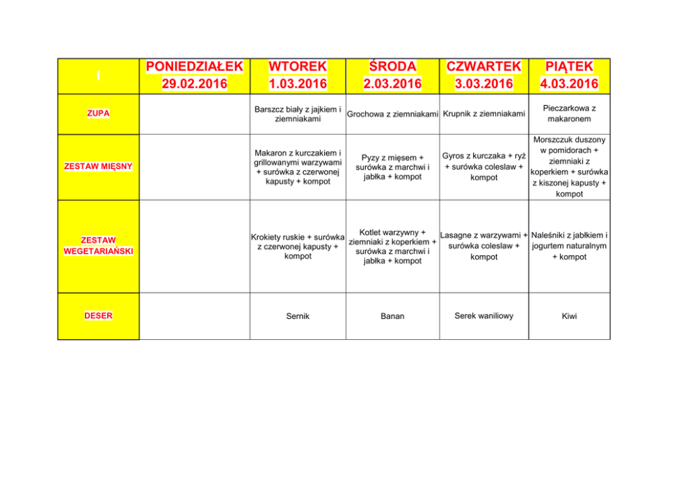 PONIEDZIAŁEK 29.02.2016 ZUPA ZESTAW MIĘSNY ZESTAW WEGETARIAŃSKI DESER WTOREK 1.03.2016 ŚRODA 2.03.2016 CZWARTEK 3.03.2016 Barszcz biały z jajkiem i Grochowa z ziemniakami Krupnik z ziemniakami ziemniakami Makaron z kurczakiem i grillowanymi warzywami + surówka z czerwonej kapusty + kompot Pyzy z mięsem + surówka z marchwi i jabłka + kompot PIĄTEK 4.03.2016 Pieczarkowa z makaronem Morszczuk duszony w pomidorach + Gyros z kurczaka + ryż ziemniaki z + surówka coleslaw + koperkiem + surówka kompot z kiszonej kapusty + kompot Kotlet warzywny + Lasagne z warzywami + Naleśniki z jabłkiem i Krokiety ruskie + surówka ziemniaki z koperkiem + surówka coleslaw + jogurtem naturalnym z czerwonej kapusty + surówka z marchwi i kompot kompot + kompot jabłka + kompot Sernik Banan Serek waniliowy Kiwi ZUPA PONIEDZIAŁEK 7.03.2016 WTOREK 8.03.2016 ŚRODA 9.03.2016 CZWARTEK 10.03.2016 PIĄTEK 11.03.2016 Zacierkowa z ziemniakami Krem z zielonego groszku z grzankami Jarzynowa z ziemniakami Żurek z kiełbaską i ziemniakami Pomidorowa z ryżem ZESTAW MIĘSNY Zraziki drobiowe w sosie pieczeniowym + kasza gryczana + buraczki zasmażane + kompot Filet z morszczuka Pulpeciki z indyka w Bitki wieprzowe w sosie panierowany + Kotlet schabowy + sosie koperkowym + własnym + kopytka + ziemniaki z ziemniaki z koperkiem + ziemniaki puree + kapusta zasmażana + surówka z czerwonej koperkiem + surówka surówka z selera, jabłka i kompot kapusty + kompot z kiszonej kapusty + marchewki + kompot kompot ZESTAW WEGETARIAŃSKI Spaghetti z sosem pomidorowym i ziołami + kompot Kotlet jajeczny+ Kotlet ziemniaczany z Placki z cukinii + ziemniaki z koperkiem + Racuchy z sosem pieczarkowym + surówka z selera, jabłka i surówka z białej kapusty surówka z czerwonej brzoskwinią + kompot marchewki + kompot + kompot kapusty + kompot DESER Budyń Keks Mandarynka Ciasto biszkoptowe Galaretka z owocami ZUPA PONIEDZIAŁEK 14.03.2016 WTOREK 15.03.2016 ŚRODA 16.03.2016 Ogórkowa z ziemniakami Ziemniaczana z warzywami Rosół z makaronem ZESTAW MIĘSNY Schab pieczony w sosie Paprykarz z kurczaka + własnym + kasza gryczana + ryż + surówka z białej buraczki zasmażane + kapusty + kompot kompot ZESTAW WEGETARIAŃSKI Gołąbki jarskie + ziemniaki z Leniwe z masłem i bułką koperkiem + buraczki tartą + kompot zasmażane + kompot DESER Sałatka owocowa Drożdżówka CZWARTEK 17.03.2016 PIĄTEK 18.03.2016 Z fasolki szparagowej z Krem z dyni z ziemniakami groszkiem ptysiowym Kotlet rybny + Gołąbki z mięsem w Filet z kurczaka ziemniaki z sosie pomidorowym + panierowany + koperkiem + surówka ziemniaki + surówka z ziemniaki z koperkiem + marchewki i jabłka + z kiszonej kapusty + bukiet warzyw + kompot kompot kompot Pizza z serem i ananasem + kompot Ratatouille z warzywami + ryż + surówka z ogórka kiszonego + kompot Naleśniki z serem i jogurtem naturalnym + kompot Gruszka Jogurt owocowy Kisiel z jabłkiem ZUPA PONIEDZIAŁEK 21.03.2016 WTOREK 22.03.2016 ŚRODA 23.03.2016 Pomidorowa z ryżem Szczawiowa z jajkiem i ziemniakami Fasolowa z ziemniakami ZESTAW MIĘSNY Paluszki z kurczaka + Klopsiki drobiowe w sosie Kurczak z warzywami + ziemniaki z koperkiem + koperkowym + ziemniaki ryż + surówka z białej marchewka baby na ciepło + + fasolka szparagowa na kapusty + kompot kompot ciepło + kompot ZESTAW WEGETARIAŃSKI Makaron z grillowanymi warzywami i tartym serem + surówka z marchwi i jabłka + kompot Placki ziemniaczane z sosem pieczarkowym + fasolka szparagowa na ciepło + kompot Pierogi z serem i jogurtem naturalnym + kompot DESER Winogrona Piernik z czekoladą Pomarańcza CZWARTEK 24.03.2016 PIĄTEK 25.03.2016 PONIEDZIAŁEK 28.03.2016 ŚRODA 30.03.2016 CZWARTEK 31.03.2016 ZUPA Kapuśniak z ziemniaki Kalafiorowa z ziemniakami ZESTAW MIĘSNY Pieczeń rzymska + ziemniaki z koperkiem + surówka z buraczków + kompot Farfalle z kurczakiem i warzywami w sosie śmietanowym + surówka z marchwi i jabłka + kompot ZESTAW WEGETARIAŃSKI Naleśniki kakaowe z serem, bananami i jogurtem naturalnym + kompot Pierożki pieczone z warzywami+ surówka z marchwi i jabłka + kompot DESER Kiwi Sernik WTOREK 29.03.2016