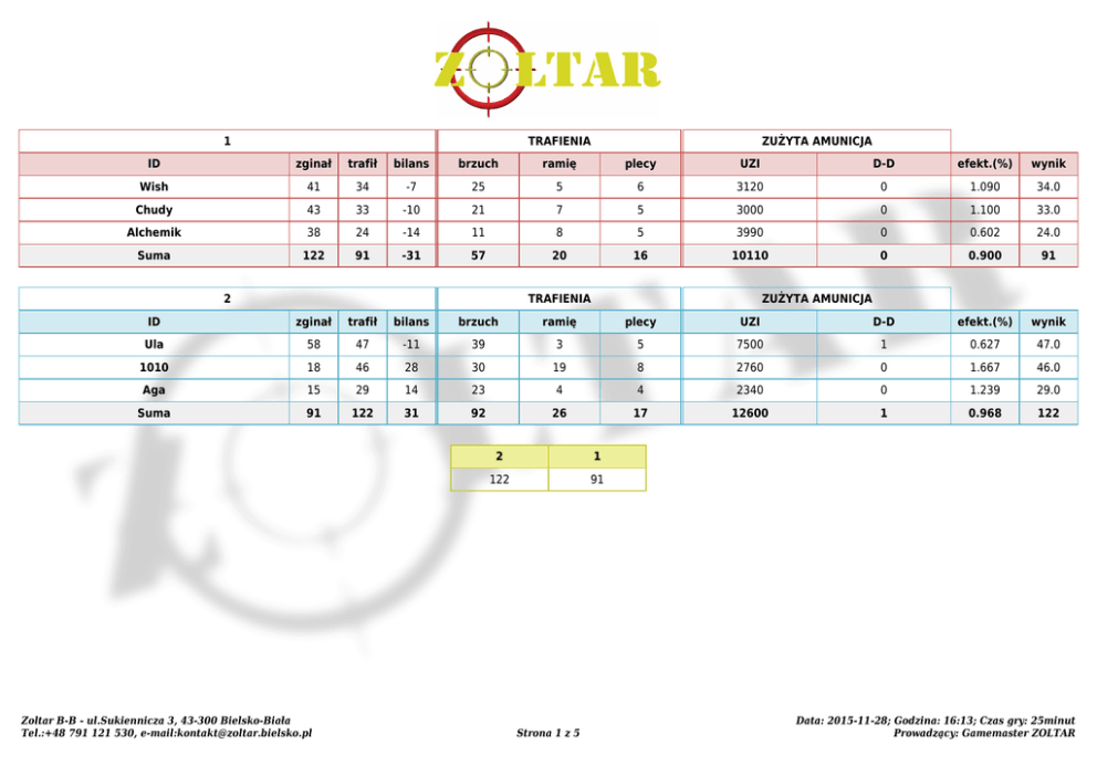 1 TRAFIENIA ZUŻYTA AMUNICJA ID zginał trafił bilans brzuch ramię plecy UZI D-D efekt.(%) wynik Wish 41 34 -7 25 5 6 3120 0 1.090 34.0 Chudy 43 33 -10 21 7 5 3000 0 1.100 33.0 Alchemik 38 24 -14 11 8 5 3990 0 0.602 24.0 Suma 122 91 -31 57 20 16 10110 0 0.900 91 2 TRAFIENIA ZUŻYTA AMUNICJA ID zginał trafił bilans brzuch ramię plecy UZI D-D efekt.(%) wynik Ula 58 47 -11 39 3 5 7500 1 0.627 47.0 1010 18 46 28 30 19 8 2760 0 1.667 46.0 Aga 15 29 14 23 4 4 2340 0 1.239 29.0 Suma 91 122 31 92 26 17 12600 1 0.968 122 Zoltar B-B - ul.Sukiennicza 3, 43-300 Bielsko-Biała Tel.:+48 791 121 530, e-mail:[email protected] 2 1 122 91 Strona 1 z 5 Data: 2015-11-28; Godzina: 16:13; Czas gry: 25minut Prowadzący: Gamemaster ZOLTAR 1 TRAFIENIA ZUŻYTA AMUNICJA ID zginał trafił bilans brzuch ramię plecy UZI D-D Mhgun Shg Snp Ula 41 61 20 50 5 6 2910 0 0 0 0 0 2.096 61.0 Chudy 33 29 -4 17 8 4 0 0 1410 15 57 1 1.955 29.0 Wish 33 28 -5 23 8 4 2340 37 0 0 0 0 1.178 28.0 Alchemik 44 26 -18 23 6 1 1890 44 60 12 0 0 1.296 26.0 1010 12 25 13 18 7 5 1560 10 0 0 0 0 1.592 25.0 Aga 25 19 -6 14 5 1 1530 3 0 0 0 0 1.239 19.0 Suma 188 188 0 145 39 21 10230 94 1470 27 57 1 1.583 188 Zoltar B-B - ul.Sukiennicza 3, 43-300 Bielsko-Biała Tel.:+48 791 121 530, e-mail:[email protected] Strona 2 z 5 ATank efekt.(%) wynik Data: 2015-11-28; Godzina: 15:41; Czas gry: 25minut Prowadzący: Gamemaster ZOLTAR Drużyny Miejsce Nazwa Zoltar B-B - ul.Sukiennicza 3, 43-300 Bielsko-Biała Tel.:+48 791 121 530, e-mail:[email protected] Rozgrywki 1 2 Suma 2 122 - 122 1 91 - 91 Strona 3 z 5 Data: 2015-11-28 Prowadzący: Gamemaster ZOLTAR Zestawienie wg wyniku Miejsce TRAFIENIA ZUŻYTA AMUNICJA ID zginał trafił bilans brzuch ramię plecy UZI D-D Mhgun Shg Snp aTank efekt.(%) wynik Ula 118.80 129.60 10.80 106.80 9.60 13.20 12492.00 1.20 0.00 0.00 0.00 0.00 1.037 129.60 0 36.00 85.20 49.20 57.60 31.20 15.60 5184.00 12.00 0.00 0.00 0.00 0.00 1.640 85.20 Wish 88.80 74.40 -14.40 57.60 15.60 12.00 6552.00 44.40 0.00 0.00 0.00 0.00 1.128 Chudy 91.20 74.40 -16.80 45.60 18.00 10.80 3600.00 0.00 1692.00 18.00 68.40 1.20 1.383 4 Alchemik 98.40 60.00 -38.40 40.80 16.80 7.20 7056.00 52.80 72.00 14.40 0.00 0.00 0.834 60.00 5 Aga 48.00 57.60 9.60 44.40 10.80 6.00 4644.00 3.60 0.00 0.00 0.00 0.00 1.239 57.60 Zestawienie wg bilansu Miejsce TRAFIENIA 74.40 ZUŻYTA AMUNICJA ID zginał trafił bilans brzuch ramię plecy UZI D-D Mhgun Shg Snp aTank efekt.(%) wynik 0 36.00 85.20 49.20 57.60 31.20 15.60 5184.00 12.00 0.00 0.00 0.00 0.00 1.640 85.20 Ula 118.80 129.60 10.80 106.80 9.60 13.20 12492.00 1.20 0.00 0.00 0.00 0.00 1.037 129.60 Aga 48.00 57.60 9.60 44.40 10.80 6.00 4644.00 3.60 0.00 0.00 0.00 0.00 1.239 57.60 4 Wish 88.80 74.40 -14.40 57.60 15.60 12.00 6552.00 44.40 0.00 0.00 0.00 0.00 1.128 74.40 5 Chudy 91.20 74.40 -16.80 45.60 18.00 10.80 3600.00 0.00 1692.00 18.00 68.40 1.20 1.383 74.40 6 Alchemik 98.40 60.00 -38.40 40.80 16.80 7.20 7056.00 52.80 72.00 14.40 0.00 0.00 0.834 60.00 Zoltar B-B - ul.Sukiennicza 3, 43-300 Bielsko-Biała Tel.:+48 791 121 530, e-mail:[email protected] Strona 4 z 5 Data: 2015-11-28 Prowadzący: Gamemaster ZOLTAR Zestawienie wg efektywności Miejsce TRAFIENIA ZUŻYTA AMUNICJA ID zginał trafił bilans brzuch ramię plecy UZI D-D Mhgun Shg Snp aTank efekt.(%) wynik 0 36.00 85.20 49.20 57.60 31.20 15.60 5184.00 12.00 0.00 0.00 0.00 0.00 1.640 85.20 Chudy 91.20 74.40 -16.80 45.60 18.00 10.80 3600.00 0.00 1692.00 18.00 68.40 1.20 1.383 74.40 Aga 48.00 57.60 9.60 44.40 10.80 6.00 4644.00 3.60 0.00 0.00 0.00 0.00 1.239 57.60 4 Wish 88.80 74.40 -14.40 57.60 15.60 12.00 6552.00 44.40 0.00 0.00 0.00 0.00 1.128 74.40 5 Ula 118.80 129.60 10.80 106.80 9.60 13.20 12492.00 1.20 0.00 0.00 0.00 0.00 1.037 129.60 6 Alchemik 98.40 60.00 -38.40 40.80 16.80 7.20 7056.00 52.80 72.00 14.40 0.00 0.00 0.834 60.00 Zoltar B-B - ul.Sukiennicza 3, 43-300 Bielsko-Biała Tel.:+48 791 121 530, e-mail:[email protected] Strona 5 z 5 Data: 2015-11-28 Prowadzący: Gamemaster ZOLTAR