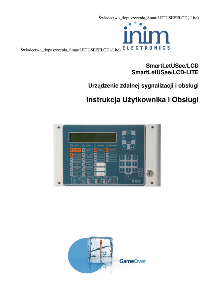 Świadectwo_dopuszczenia_SmartLETUSEEELCD(-Lite) Świadectwo_dopuszczenia_SmartLETUSEEELCD(-Lite) SmartLetUSee/LCD SmartLetUSee/LCD-LITE Urządzenie zdalnej sygnalizacji i obsługi Instrukcja Użytkownika i Obsługi 1 Informacje o importerze 50-265 Wrocław 01-797 Warszawa ul. BEMA 7/9 ul. POWĄZKOWSKA 15 tel.: +48 71 327 90 60 tel.: +48 22 562 30 11 fax.: +48 71 327 75 52 fax.: +48 22 562 30 30 e-mail: [email protected] e-mail: [email protected] 2 Model i typ urządzenia współpracuje z centralami sygnalizacji pożaru INIM: - model SmartLetUSee/LCD • SmartLoop, - model SmartLetUSee/LCD-Lite • SmartLight, 3 • SmartLight, • SmartLine. • SmartLine; Płyta czołowa - interfejs użytkownika Urządzenie podłączone do central ppoż INIM poprzez magistralę RS485 BUS. Rysunek 1 - Płyta czołowa urządzenia Urządzenie jest wyposażone w wyświetlacz LCD, diody sygnalizacyjne oraz klawiaturę z przyciskami wyświetlaczy, W połączeniu z centralną SmartLoop powiela wszystkie funkcje panelu przedniego, umożliwia także operacje programowania i testowania. W połączeniu z centralami SmartLight lub SmartLine wyświetla aktywnych zdarzenia i pozwala na realizację wybranych operacji dozwolonych z drugiego poziomu dostępu (reset, wyciszanie itp..). 2 4 Przyciski Alfanumeryczny wyświetlacz LCD, 40 znaków x 4 linie. Pokazuje stan systemu, poszczególne zdarzenia i alarmy oraz pozwala poruszać się po głównym menu systemu. ▲,▼,◄,► Przyciski nawigacji służące do poruszania się po menu oraz zmiany wartości w poszczególnych polach programowania. ESC Przycisk ESC pozwala na wyjście z danej operacji lub cofnięcie się na wyższy poziom menu. Przycisk zatwierdza operację i zamyka ekran lub umożliwia przejście do niższego poziomu menu. Klawiatura alfanumeryczna do wprowadzania danych. Przycisk 1 służy do wyświetlania szczegółowych informacji o zdarzeniach w pamięci. Kluczyk może być użyty zamiast kodu w celu wejścia do trybu uprawnionego użytkownika (poziom 2). EWAKUACJA Wciśnięcie tego przycisku w trakcie prealarmu (bez kluczyka lub kodu - poziom 1) spowoduje wywołanie pełnego alarmu. W trybie uprawnionego użytkownika (poziom 2, po użyciu kluczyka lub kodu) wciśnięcie tego przycisku również w stanie czuwania spowoduje wywołanie natychmiastowego pełnego alarmu. RESET Wciśnięcie tego przycisku (dostępny tylko na poziomie 2 - konieczny kluczyk lub kod) kasuje wszystkie aktywne zdarzenia i przywraca system do stanu czuwania. WYCISZ Wciśnięcie tego przycisku (dostępny tylko na poziomie 2 - konieczny kluczyk lub kod) wycisza (wyłącza) wszystkie aktywne wyjścia posiadające atrybut “wyciszalne”. Po wyciszeniu wyjścia te zostaną nieaktywne aż do wystąpienia kolejnego zdarzenia, które spowoduje ich ponowne włączenie. Przycisk WYCISZ działa w trybie bistabilnym wyłączone wyjścia mogą zostać ponownie aktywowane poprzez ponowne wciśnięcie przycisku. WERYFIKACJA Wciśnięcie tego przycisku (dostępny tylko na poziomie 2 - konieczny kluczyk lub kod) w trakcie prealarmu spowoduje wydłużenie upływającego czasu prealarmu o dodatkowy czas weryfikacji (można to zrobić tylko raz). BRZĘCZYK Wciśnięcie tego przycisku (poziom 1 - bez użycia kluczyka lub kodu) wycisza brzęczyk centrali. TEST Wciśnięcie tego przycisku (poziom 1 - bez użycia kluczyka lub kodu) spowoduje włączenie na chwilę wszystkich diod LED na płycie czołowej centrali w celu sprawdzenia ich działania. 1.5.2 Sygnalizacja diod LED Nazwa Świeci: WERYFIKACJA Sygnalizuje upływanie czasu na weryfikację alarmu. WYCISZ Sygnalizuje, że system został wyciszony. RESET W czasie prealarmu sygnalizuje, że nie można zresetować systemu. Reset będzie możliwy, kiedy wszystkie wyjścia zostaną wyłączone i dioda RESET zgaśnie. ALARM Sygnalizuje wystąpienie alarmu w punkcie (detektor, przycisk, moduł wejść, etc.), powodującego wywołanie pełnego alarmu przez centralę. PRE-ALARM Sygnalizuje stan prealarmu, czyli zaprogramowanego opóźnienia alarmu z punktu (detektor, przycisk, moduł wejść, etc.). BLOKADA Sygnalizuje, że jeden lub więcej elementów systemu (punkty, strefy lub wyjścia) zostało Miga: 3 zablokowanych TEST Sygnalizuje, że jeden lub więcej elementów systemu (punktów lub stref) jest w trakcie przeprowadzania testu TRYB NOCNY Sygnalizuje, że centrala pracuje w trybie nocnym. WŁ Sygnalizuje, że system jest włączony (pracuje). USTERKA Sygnalizuje występującą usterkę – wyświetlacz pokaże jej dokładny opis. Sygnalizuje ustąpienie usterki. Aby sprawdzić jaka usterka miała miejsce, należy przejrzeć pamięć zdarzeń poprzez menu główne (poziom 1). USTERKA CPU Sygnalizuje awarię procesora centrali - konieczny jest demontaż i odesłanie centrali do naprawy. Sygnalizuje restart procesora (po wyłączeniu zasilania lub usterce). Wskazane jest sprawdzenie poprawności działania systemu. AKUMULATOR Sygnalizuje rozładowanie lub usterkę akumulatora centrali, szczegółowe informacje można odczytać z wyświetlacza (akumulator rozładowany, odłączony, etc.). Sygnalizuje ustąpienie usterki/ naładowanie akumulatora, szczegółowe informacje można odczytać z wyświetlacza poprzez menu główne (poziom 1: wszyscy użytkownicy). UZIEMIENIE Sygnalizuje upływ prądu do ziemi. Sygnalizuje ustąpienie upływu prądu do ziemi, szczegółowe informacje można odczytać z wyświetlacza poprzez menu główne (poziom 1: wszyscy użytkownicy). BEZPIECZNIK Sygnalizuje wystąpienie zwarcia w systemie (na wyjściu AUX centrali lub w innym urządzeniu) należy niezwłocznie powiadomić obsługę serwisową. Sygnalizuje ustąpienie zwarcia w systemie, szczegółowe informacje można odczytać z wyświetlacza poprzez menu główne (poziom 1: wszyscy użytkownicy). ZASILANIE Sygnalizuje zanik zasilania sieciowego (230VAC). Sygnalizuje przywrócenie zasilania sieciowego, szczegółowe informacje można odczytać z wyświetlacza poprzez me