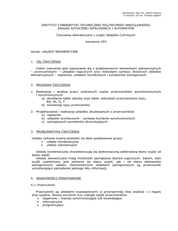 opracował: mgr inż. Antoni Sterna e-version: dr inż. Tomasz Kapłon INSTYTUT CYBERNETYKI TECHNICZNEJ POLITECHNIKI WROCŁAWSKIEJ ZAKŁAD SZTUCZNEJ INTELIGENCJI I AUTOMATÓW Ćwiczenia laboratoryjne z Logiki Układów Cyfrowych ćwiczenie 203 temat: UKŁADY SEKWENCYJNE 1. CEL ĆWICZENIA Celem ćwiczenia jest zapoznanie się z podstawowymi elementami sekwencyjnych – przerzutnikami – układów logicznych oraz metodami syntezy złożonych układów sekwencyjnych – rejestrów, układów licznikowych i sumatorów szeregowych. 2. PROGRAM ĆWICZENIA 1. Realizacja i analiza pracy wybranych typów przerzutników asynchronicznych i synchronicznych a) określenie tablic stanów oraz tablic wzbudzeń przerzutników typu: RS, JK, D, T b) konwersje typu przerzutnika 2. Projektowanie i realizacja układów zbudowanych z przerzutników a) rejestrów b) układów licznikowych – synteza liczników synchronicznych c) szeregowych sumatorów akumulujących 3. PROBLEMATYKA ĆWICZENIA Układy cyfrowe można podzielić na dwie podstawowe grupy: • układy kombinacyjne • układy sekwencyjne Układy kombinacyjne charakteryzują się jednoznaczną zależnością stanu wyjść od stanu wejść. Układy sekwencyjne mają możliwość pamiętania stanów logicznych. Zatem, stan wyjść uzależniony jest zarówno od stanu wejść, jak i od stanu elementów pamięciowych układu. Elementarnymi układami pamięciowymi są przerzutniki umożliwiające pamiętanie jednego bitu informacji. 4. WIADOMOŚCI PODSTAWOWE 4.1. Przerzutniki Przerzutniki są układami wyposażonymi w przynajmniej dwa wejścia i z reguły dwa wyjścia. Można wyróżnić trzy rodzaje wejść przerzutników: • zegarowe – inaczej synchronizujące lub wyzwalające • informacyjne • programujące opracował: mgr inż. Antoni Sterna e-version: dr inż. Tomasz Kapłon Przerzutniki z wejściem zegarowym (C) nazywane są przerzutnikami synchronicznymi, bez wejścia zegarowego asynchronicznymi. Wejścia programujące pozwalają ustawiać (Set, Preset) lub zerować (Reset, Clear) stan przerzutnika w sposób asynchroniczny. Działanie przerzutnika opisywane jest przez tablicę stanów przedstawiającą stany na wejściach informacyjnych i wyjściach przed wystąpieniem sygnału zegarowego (chwila t) oraz wynikający z nich (według funkcji układu) stan wyjść po wystąpieniu sygnału zegarowego (chwila t+1). Poniżej przedstawione zostaną podstawowe typy przerzutników wraz z tablicą stanów i równaniami logicznymi. Asynchroniczny przerzutnik RS S Q Q R Synchroniczny przerzutnik RS S Q C R Q Synchroniczny przerzutnik JK J Q C K Q R S Q(t) Q(t+1) 0 0 0 0 0 0 1 1 0 1 0 1 0 1 1 1 1 0 0 0 1 0 1 0 1 1 0 - 1 1 1 - Q(t+1) = S(t) + /R(t) Q(t) S(t) R(t) Q(t+1) 0 0 Q(t) 0 1 0 1 0 1 1 1 ? Q(t+1) = J(t) /Q(t) + /K(t) Q(t) J(t) K(t) Q(t+1) 0 0 Q(t) 0 1 0 1 0 1 1 1 Q(t) opracował: mgr inż. Antoni Sterna e-version: dr inż. Tomasz Kapłon Synchroniczny przerzutnik D D Q(t+1) = D(t) Q D(t) Q(t+1) C 0 0 1 1 Q Synchroniczny przerzutnik T T Q(t+1) = T(t) /Q(t) + /T(t) Q(t) Q T(t) Q(t+1) C 0 Q(t+1) 1 Q(t) Q Aby określić stan wejść przerzutnika, niezbędny do założonej zmiany stanu, korzysta się z tak zwanej tablicy wzbudzeń. Można ją uzyskać przez przejście od pełnej tablicy stanów do tablicy Karnaugh'a. Pokazane to zostanie na przykładzie przerzutnika JK. Q(t) J(t) K(t) Q(t+1) 0 0 0 0 0 0 1 0 0 1 0 1 0 1 1 1 1 0 0 1 1 0 1 0 1 1 0 1 0 0 1 1 1 0 1 1 Q(t) Q(t+1) J(t) K(t) Q(t) J(t) K(t) 00 0 1 0 0 0 X 0 1 1 X 10 11 0 1 1 1 0 X 1 0 0 1 1 1 X 0 Q(t+1) 4.2 Synteza układu sekwencyjnego Ponieważ synteza układu sekwencyjnego asynchronicznego wymaga uwzględnienia opóźnień we wszystkich drogach rozchodzenia się sygnałów wejściowych jest zadaniem pracochłonnym i trudnym, dlatego też nie zostanie tutaj umówiona. Przedstawiona zostanie synteza układu synchronicznego. opracował: mgr inż. Antoni Sterna e-version: dr inż. Tomasz Kapłon Stan logiczny układu synchronicznego jest określany przez zbiór stanów wszystkich przerzutników wchodzących w jego skład i synchronizowanych sygnałem zegarowym. Maksymalna liczba stanów układu zawierającego n przerzutników wynosi 2n. Sekwencję stanów można przedstawić w postaci grafu stanów lub tablicy stanów. Synteza synchronicznego układu sekwencyjnego polega na: • określeniu liczby i typu przerzutników wymaganych do jego realizacji, • przedstawieniu żądanej sekwencji stanów w postaci tablicy stanów, • sporządzeniu tablic Karnaugh'a dla wejść poszczególnych przerzutników, na podstawie tablicy stanów i tablicy wzbudzeń wybranego przerzutnika, • minimalizacji funkcji przełączających poszczególnych wejść przerzutników, • praktycznej realizacji układu, na podstawie powyższych funkcji, przy użyciu odpowiednich funktorów logicznych Poniżej przedstawione zostaną podstawowe układy konstruowane z przerzutników, mające szerokie zastosowanie praktyczne. 4.3 Układy rejestrowe Rejestry szeregowe mogą być przystosowane do przesuwania wprowadzanej informacji w jednym kierunku (rejestry jednokierunkowe) bądź w obu kierunkach (rejestry rewersyjne). Rejestry budowane są z przerzutników. Poniżej pokazano przykład 4-bitowego rejestru przesuwającego, zbudowanego z przerzutników typu D. wejście równoległe wpis wejście szeregowe D S C Q D S C R Q S D C R Q D S Q wyjście szeregowe C R R reset takt wyjście równoległe 4.4 Układy licznikowe Licznik jest sekwencyjnym układem cyfrowym zliczającym i pamiętającym liczbę impulsów podawanych na jego wejście zliczające. Stan początkowy jest zazwyczaj ustawiany osobnym wejściem. Licznik przechodzący cyklicznie przez N wyróżnionych stanów nazywany jest licznikiem modulo N. Jeżeli zaś przechodzi on przez te stany jednokrotnie i po osiągnięciu stanu końcowego musi być sprowadzony do stanu początkowego jest licznikiem do N. Licznik zawierający n przerzutników może mieć maksymalną pojemnoś