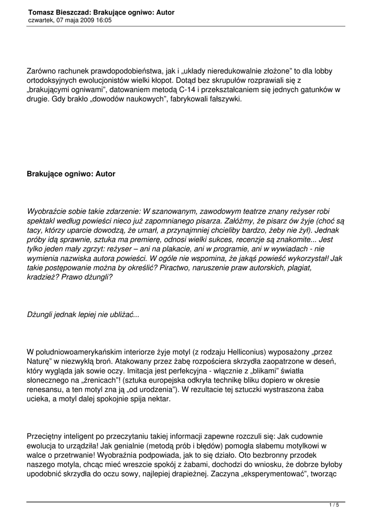 Tomasz Bieszczad: Brakujące ogniwo: Autor czwartek, 07 maja 2009 16:05 Zarówno rachunek prawdopodobieństwa, jak i „układy nieredukowalnie złożone” to dla lobby ortodoksyjnych ewolucjonistów wielki kłopot. Dotąd bez skrupułów rozprawiali się z „brakującymi ogniwami”, datowaniem metodą C-14 i przekształcaniem się jednych gatunków w drugie. Gdy brakło „dowodów naukowych”, fabrykowali fałszywki. Brakujące ogniwo: Autor Wyobraźcie sobie takie zdarzenie: W szanowanym, zawodowym teatrze znany reżyser robi spektakl według powieści nieco już zapomnianego pisarza. Załóżmy, że pisarz ów żyje (choć są tacy, którzy uparcie dowodzą, że umarł, a przynajmniej chcieliby bardzo, żeby nie żył). Jednak próby idą sprawnie, sztuka ma premierę, odnosi wielki sukces, recenzje są znakomite... Jest tylko jeden mały zgrzyt: reżyser – ani na plakacie, ani w programie, ani w wywiadach - nie wymienia nazwiska autora powieści. W ogóle nie wspomina, że jakąś powieść wykorzystał! Jak takie postępowanie można by określić? Piractwo, naruszenie praw autorskich, plagiat, kradzież? Prawo dżungli? Dżungli jednak lepiej nie ubliżać... W południowoamerykańskim interiorze żyje motyl (z rodzaju Helliconius) wyposażony „przez Naturę” w niezwykłą broń. Atakowany przez żabę rozpościera skrzydła zaopatrzone w deseń, który wygląda jak sowie oczy. Imitacja jest perfekcyjna - włącznie z „blikami” światła słonecznego na „źrenicach”! (sztuka europejska odkryła technikę bliku dopiero w okresie renesansu, a ten motyl zna ją „od urodzenia”). W rezultacie tej sztuczki wystraszona żaba ucieka, a motyl dalej spokojnie spija nektar. Przeciętny inteligent po przeczytaniu takiej informacji zapewne rozczuli się: Jak cudownie ewolucja to urządziła! Jak genialnie (metodą prób i błędów) pomogła słabemu motylkowi w walce o przetrwanie! Wyobraźnia podpowiada, jak to się działo. Oto bezbronny przodek naszego motyla, chcąc mieć wreszcie spokój z żabami, dochodzi do wniosku, że dobrze byłoby upodobnić skrzydła do oczu sowy, najlepiej drapieżnej. Zaczyna „eksperymentować”, tworząc 1/5 Tomasz Bieszczad: Brakujące ogniwo: Autor czwartek, 07 maja 2009 16:05 na swoich skrzydłach różne wzorki. Z początku idzie mu słabo. Przez długi czas żaby nie są w stanie utożsamić rezultatów jego prób z oczami sowy. Więc się ich nie boją. Motyl dowiaduje się o tym w najbardziej przykry sposób: ginąc w przewodzie pokarmowym płaza. Jednak sławetna metoda prób i błędów trwa: kolejni potomkowie motyla nieustannie poprawiają „oczy”. Skuteczność straszenia poprawia się, aż w końcu „późny wnuk” pierwszego motyla odkrywa europejską technikę bliku i gatunek Helliconius oddycha z ulgą. I tu przykra wiadomość: droga takich stopniowych ulepszeń jest niewykonalna. Z dwóch, co najmniej, powodów. Pierwszy: Rodzi się pytanie, w jaki sposób motyl sprawdza wygląd swych deseni i ich zgodność z modelem? Przecież nie może „wyjść z siebie” i polatać obok, by skorygować wzór. Drugi: Skuteczność obrony (czyli przetrwanie gatunku) może zapewnić tylko wzór identyczny z oryginałem. Badania innych gatunków motyli Helliconius dowodzą bowiem, że żaby nie boją się deseni „abstrakcyjnych”, a jedynie imitacji oczu sowy. I tu mamy clou całej tej historii: Sowa, której oczy odwzorowane są na skrzydłach motyla, naprawdę żyje w dżungli, żywiąc się owadami! Że ewolucja działa jak loteria, że potrzebuje setek milionów lat, aby – przynajmniej na kartach szkolnego podręcznika - przemienić gada w ptaka, o tym wie każde dziecko od czasów Darwina, Oparina i Stalina. Czy jednak ewolucja - ta „ślepa, nieruchawa łamaga” (jak nazwał ją amerykański pisarz Kurt Vonnegut na kartach powieści „Galapagos”) – czy ewolucja może posiadać inteligencję, talent malarza realisty i - dodatkowo - poczucie humoru? Weźmy inny przykład: znany w Europie i Azji pająk topik (argurometa aquatica) buduje podwodne gniazdo w formie dzwonu, który wypełnia powietrzem donoszonym w pęcherzykach „przylepionych” do ciała. W tym klasycznym kesonie samica składa jaja, tam też przychodzą na świat małe. To oczywiste, że zarówno budowy kesonu, jak i metody zaopatrywania go w tlen, pająk nie mógł się nauczyć „stopniowo”, etapami. System musiał od początku działać bez zarzutu. W przeciwnym razie pająk by się utopił, albo też udusiłyby się jego młode. Projekt tego urządzenia musiał zostać zapisany w pamięci genetycznej owada – od razu w całości, gotowy „od A do Z”. Ale kto go zapisał? Biologia w ostatnich latach odkryła tzw. „układy nieredukowalnie złożone”, w których każdy element jest konieczny, aby system mógł działać. Amerykański biochemik Michael Biehe przybliża ideę tych układów, opisując pułapkę na myszy: Jeśli usunąć z niej sprężynę, pułapka 2/5 Tomasz Bieszczad: Brakujące ogniwo: Autor czwartek, 07 maja 2009 16:05 nie będzie działać gorzej. Przestanie działać w ogóle, przestanie być pułapką na myszy! Bo każdy z jej elementów jest niezbędny, ale każdy osobno jest, z funkcjonalnego punktu widzenia, bezużyteczny. Pułapka zatem nie może powstać „ewolucyjnie”, metodą prób i błędów. Jej pomysł (idea pułapki) musiał zostać wymyślony w całości, „od A do Z”. Tak samo jest w biologii. Oczywiście: Nikt rozsądny nie neguje „metamorfoz”, gwałtownych lub powolnych zmian w przyrodzie. Na przestrzeni dziejów istoty żywe podlegają różnym, często dramatycznym przemianom w obrębie gatunków. Ale prawo wielkich liczb, dobór naturalny, „setki milionów lat prób i błędów” – to wystarczy, by wyhodować nową rasę psa, ale ciągle za mało, żeby topik nauczył się budować keson! A o ileż trudniej miały słynne oparinowskie „koacerwaty” w słynnym „pra-bulionie