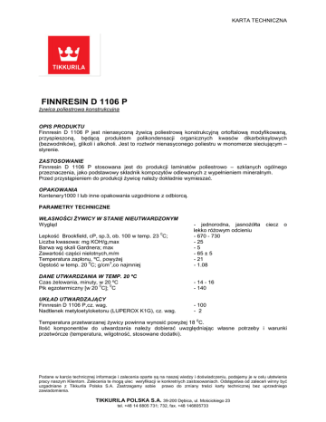 KARTA TECHNICZNA FINNRESIN D 1106 P żywica poliestrowa konstrukcyjna OPIS PRODUKTU Finnresin D 1106 P jest nienasyconą żywicą poliestrową konstrukcyjną ortoftalową modyfikowaną, przyspieszoną, będącą produktem polikondensacji organicznych kwasów dikarboksylowych (bezwodników), glikoli i alkoholi. Jest to roztwór nienasyconego poliestru w monomerze sieciującym – styrenie. ZASTOSOWANIE Finnresin D 1106 P stosowana jest do produkcji laminatów poliestrowo – szklanych ogólnego przeznaczenia, jako podstawowy składnik kompozytów odlewanych z wypełnieniem mineralnym. Przed przystąpieniem do produkcji żywicę należy dokładnie wymieszać. OPAKOWANIA Kontenery1000 l lub inne opakowania uzgodnione z odbiorcą. PARAMETRY TECHNICZNE WŁASNOŚCI ŻYWICY W STANIE NIEUTWARDZONYM Wygląd Lepkość Brookfield, cP, sp.3, ob. 100 w temp. 23 C; Liczba kwasowa: mg KOH/g,max Barwa wg skali Gardnera; max Zawartość części nielotnych,m/m Temperatura zapłonu, ºC, powyżej 0 3 Gęstość w temp. 20 C; g/cm ,co najmniej - jednorodna, jasnożółta lekko różowym odcieniu - 670 - 730 - 25 -5 - 65 ± 5 - 21 - 1.08 DANE UTWARDZANIA W TEMP. 20 ºC Czas żelowania, minuty, w 20 ºC 0 0 Pik egzotermiczny [w 20 C]; C - 14 - 16 - 140 UKŁAD UTWARDZAJĄCY Finnresin D 1106 P,cz. wag. Nadtlenek metyloetyloketonu (LUPEROX K1G), cz. wag. - 100 - 2 0 ciecz o 0 Temperatura przetwarzanej żywicy powinna wynosić powyżej 18 C. Ilość komponentów do utwardzania należy dobierać uwzględniając własne potrzeby i warunki przetwórcze (temperatura, wilgotność, stosowane dodatki). Podane w karcie technicznej informacje i zalecenia oparte są na naszej wiedzy i doświadczeniu, podajemy je w celu ułatwienia pracy naszym Klientom. Zalecenia te mogą ulec weryfikacji w konkretnych zastosowaniach. Odstępstwa od zaleceń winny być uzgadniane z Tikkurila Polska S.A. Zastrzegamy sobie prawo do zmiany treści karty technicznej bez uprzedniego zawiadomienia. TIKKURILA POLSKA S.A. 39-200 Dębica, ul. Mościckiego 23 tel. +48 14 6805 731; 732, fax. +48 146805733 KARTA TECHNICZNA WŁASNOŚCI ŻYWICY W STANIE UTWARDZONYM Temperatura ugięcia (metoda Martensa), ºC Udarność wg Charpy : kJ/m² Wytrzymałość na zginanie; MPa Moduł sprężystości przy zginaniu: GPa Wydłużenie względne przy zerwaniu; % Wytrzymałość na rozciąganie; MPa Moduł sprężystości Younga podczas rozciągania; GPa - 50 - 60 - 1,5 - 2,5 - 100 - 135 - 2,5 - 3,3 -4-7 - 40 - 55 -3-4 NORMA : ZN-WG-42:2012. OKRES TRWAŁOŚCI: 3 miesiące od daty produkcji. TRANSPORT I PRZECHOWYWANIE: Żywicę należy przechowywać w oryginalnych, zamkniętych opakowaniach w pomieszczeniach magazynowych suchych, przewiewnych i zacienionych w temperaturze od 0 5 C do 25ºC, przystosowanych do przechowywania materiałów łatwopalnych. W wyższych temperaturach okres gwarancji jest odpowiednio krótszy. Chronić przed słońcem. WARUNKI BHP I PPOŻ: Wyrób łatwopalny, stosować w pomieszczeniach zabezpieczonych przed ogniem lub innym źródłem zapłonu. Nie używać narzędzi powodujących iskrzenie. Unikać kontaktu ze skórą, oczami, nie wdychać oparów. Zabrania się palenia papierosów, jedzenia i picia w pomieszczeniach, w których przygotowywany jest produkt. Podane w karcie technicznej informacje i zalecenia oparte są na naszej wiedzy i doświadczeniu, podajemy je w celu ułatwienia pracy naszym Klientom. Zalecenia te mogą ulec weryfikacji w konkretnych zastosowaniach. Odstępstwa od zaleceń winny być uzgadniane z Tikkurila Polska S.A. Zastrzegamy sobie prawo do zmiany treści karty technicznej bez uprzedniego zawiadomienia. TIKKURILA POLSKA S.A. 39-200 Dębica, ul. Mościckiego 23 tel. +48 14 6805 731; 732, fax. +48 146805733