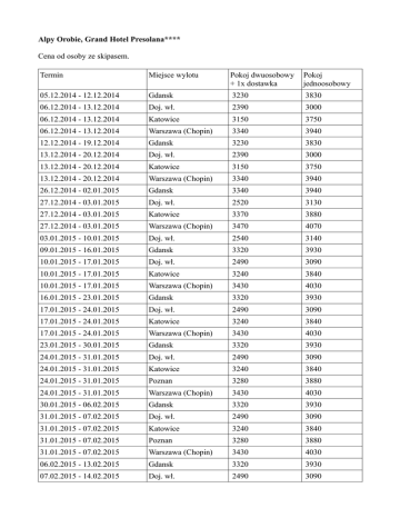 Alpy Orobie, Grand Hotel Presolana**** Cena od osoby ze skipasem. Termin Miejsce wylotu Pokoj dwuosobowy + 1x dostawka Pokoj jednoosobowy 05.12.2014 - 12.12.2014 Gdansk 3230 3830 06.12.2014 - 13.12.2014 Doj. wł. 2390 3000 06.12.2014 - 13.12.2014 Katowice 3150 3750 06.12.2014 - 13.12.2014 Warszawa (Chopin) 3340 3940 12.12.2014 - 19.12.2014 Gdansk 3230 3830 13.12.2014 - 20.12.2014 Doj. wł. 2390 3000 13.12.2014 - 20.12.2014 Katowice 3150 3750 13.12.2014 - 20.12.2014 Warszawa (Chopin) 3340 3940 26.12.2014 - 02.01.2015 Gdansk 3340 3940 27.12.2014 - 03.01.2015 Doj. wł. 2520 3130 27.12.2014 - 03.01.2015 Katowice 3370 3880 27.12.2014 - 03.01.2015 Warszawa (Chopin) 3470 4070 03.01.2015 - 10.01.2015 Doj. wł. 2540 3140 09.01.2015 - 16.01.2015 Gdansk 3320 3930 10.01.2015 - 17.01.2015 Doj. wł. 2490 3090 10.01.2015 - 17.01.2015 Katowice 3240 3840 10.01.2015 - 17.01.2015 Warszawa (Chopin) 3430 4030 16.01.2015 - 23.01.2015 Gdansk 3320 3930 17.01.2015 - 24.01.2015 Doj. wł. 2490 3090 17.01.2015 - 24.01.2015 Katowice 3240 3840 17.01.2015 - 24.01.2015 Warszawa (Chopin) 3430 4030 23.01.2015 - 30.01.2015 Gdansk 3320 3930 24.01.2015 - 31.01.2015 Doj. wł. 2490 3090 24.01.2015 - 31.01.2015 Katowice 3240 3840 24.01.2015 - 31.01.2015 Poznan 3280 3880 24.01.2015 - 31.01.2015 Warszawa (Chopin) 3430 4030 30.01.2015 - 06.02.2015 Gdansk 3320 3930 31.01.2015 - 07.02.2015 Doj. wł. 2490 3090 31.01.2015 - 07.02.2015 Katowice 3240 3840 31.01.2015 - 07.02.2015 Poznan 3280 3880 31.01.2015 - 07.02.2015 Warszawa (Chopin) 3430 4030 06.02.2015 - 13.02.2015 Gdansk 3320 3930 07.02.2015 - 14.02.2015 Doj. wł. 2490 3090 07.02.2015 - 14.02.2015 Katowice 3240 3840 07.02.2015 - 14.02.2015 Poznan 3280 3880 07.02.2015 - 14.02.2015 Warszawa (Chopin) 3430 4030 13.02.2015 - 20.02.2015 Gdansk 3320 3930 14.02.2015 - 21.02.2015 Doj. wł. 2490 3090 14.02.2015 - 21.02.2015 Katowice 3240 3840 14.02.2015 - 21.02.2015 Poznan 3280 3880 14.02.2015 - 21.02.2015 Warszawa (Chopin) 3430 4030 20.02.2015 - 27.02.2015 Gdansk 3320 3930 21.02.2015 - 28.02.2015 Doj. wł. 2490 3090 21.02.2015 - 28.02.2015 Katowice 3240 3840 21.02.2015 - 28.02.2015 Poznan 3280 3880 21.02.2015 - 28.02.2015 Warszawa (Chopin) 3430 4030 27.02.2015 - 06.03.2015 Gdansk 3320 3930 28.02.2015 - 07.03.2015 Doj. wł. 2490 3090 28.02.2015 - 07.03.2015 Katowice 3240 3840 28.02.2015 - 07.03.2015 Poznan 3280 3880 28.02.2015 - 07.03.2015 Warszawa (Chopin) 3430 4030 06.03.2015 - 13.03.2015 Gdansk 3320 3930 07.03.2015 - 14.03.2015 Doj. wł. 2490 3090 07.03.2015 - 14.03.2015 Katowice 3240 3840 07.03.2015 - 14.03.2015 Poznan 3280 3880 07.03.2015 - 14.03.2015 Warszawa (Chopin) 3430 4030 13.03.2015 - 20.03.2015 Gdansk 3320 3930 14.03.2015 - 21.03.2015 Doj. wł. 2490 3090 14.03.2015 - 21.03.2015 Katowice 3240 3840 14.03.2015 - 21.03.2015 Poznan 3280 3880 14.03.2015 - 21.03.2015 Warszawa (Chopin) 3430 4030 20.03.2015 - 27.03.2015 Gdansk 3320 3930 21.03.2015 - 28.03.2015 Doj. wł. 2490 3090 21.03.2015 - 28.03.2015 Katowice 3240 3840 21.03.2015 - 28.03.2015 Warszawa (Chopin) 3430 4030 27.03.2015 - 03.04.2015 Gdansk 3320 3930 28.03.2015 - 04.04.2015 Doj. wł. 2490 3090 28.03.2015 - 04.04.2015 Katowice 3240 3840 28.03.2015 - 04.04.2015 Warszawa (Chopin) 3430 4030