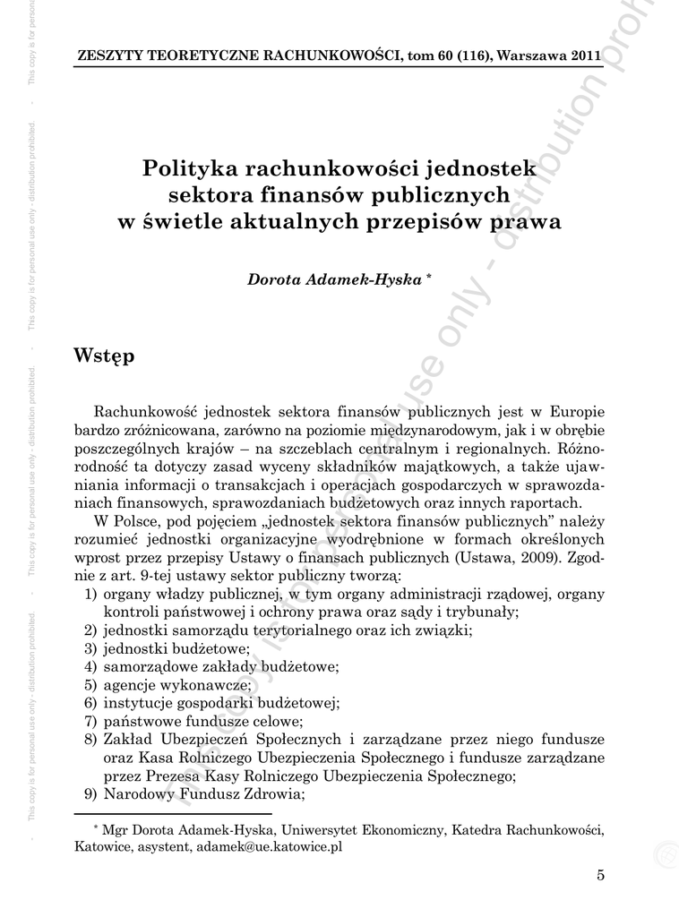 ibu tio np roh This copy is for person - on ly - dis tr Polityka rachunkowości jednostek sektora finansów publicznych w świetle aktualnych przepisów prawa Dorota Adamek-Hyska * lu se Wstęp is c op y is for pe rso na Rachunkowość jednostek sektora finansów publicznych jest w Europie bardzo zróżnicowana, zarówno na poziomie międzynarodowym, jak i w obrębie poszczególnych krajów – na szczeblach centralnym i regionalnych. Różnorodność ta dotyczy zasad wyceny składników majątkowych, a także ujawniania informacji o transakcjach i operacjach gospodarczych w sprawozdaniach finansowych, sprawozdaniach budżetowych oraz innych raportach. W Polsce, pod pojęciem „jednostek sektora finansów publicznych” należy rozumieć jednostki organizacyjne wyodrębnione w formach określonych wprost przez przepisy Ustawy o finansach publicznych (Ustawa, 2009). Zgodnie z art. 9-tej ustawy sektor publiczny tworzą: 1) organy władzy publicznej, w tym organy administracji rządowej, organy kontroli państwowej i ochrony prawa oraz sądy i trybunały; 2) jednostki samorządu terytorialnego oraz ich związki; 3) jednostki budżetowe; 4) samorządowe zakłady budżetowe; 5) agencje wykonawcze; 6) instytucje gospodarki budżetowej; 7) państwowe fundusze celowe; 8) Zakład Ubezpieczeń Społecznych i zarządzane przez niego fundusze oraz Kasa Rolniczego Ubezpieczenia Społecznego i fundusze zarządzane przez Prezesa Kasy Rolniczego Ubezpieczenia Społecznego; 9) Narodowy Fundusz Zdrowia; Th This copy is for personal use only - distribution prohibited. - This copy is for personal use only - distribution prohibited. - This copy is for personal use only - distribution prohibited. - ZESZYTY TEORETYCZNE RACHUNKOWOŚCI, tom 60 (116), Warszawa 2011 * Mgr Dorota Adamek-Hyska, Uniwersytet Ekonomiczny, Katedra Rachunkowości, Katowice, asystent, [email protected] 5 ibu tio np roh is c op y is for pe rso na lu se on ly - dis tr samodzielne publiczne zakłady opieki zdrowotnej; uczelnie publiczne; Polska Akademia Nauk i tworzone przez nią jednostki organizacyjne; państwowe i samorządowe instytucje kultury oraz państwowe instytucje filmowe; 14) inne państwowe lub samorządowe osoby prawne utworzone na podstawie odrębnych ustaw w celu wykonywania zadań publicznych, z wyłączeniem przedsiębiorstw, jednostek badawczo-rozwojowych, banków i spółek prawa handlowego. Sposób organizowania sektora finansów publicznych przesądza o wielu kwestiach, a w szczególności o regułach gospodarowania środkami publicznymi w toku prowadzonej działalności przez poszczególne podmioty tej sfery. Wszystkie podmioty zaliczane do sektora finansów publicznych są podmiotami rachunkowości w rozumieniu art. 2 Ustawy o rachunkowości (Ustawa, 1994 – Uor). Należy jednak podkreślić, że w stosunku do wybranych jednostek sektora finansów publicznych nie wszystkie przepisy krajowego prawa bilansowego mają zastosowanie. Chodzi tu o jednostki samorządu terytorialnego oraz ich związki, samorządowe i państwowe jednostki budżetowe, samorządowe zakłady budżetowe, a także państwowe fundusze celowe. Zgodnie z art. 80 Uor, podmioty te nie stosują przepisów rozdziału 5 „Sprawozdania finansowe”, rozdziału 6 „Skonsolidowane sprawozdania finansowe grupy kapitałowej” oraz rozdziału 7 „Badanie i ogłaszanie sprawozdań finansowych”. Szczególne zasady rachunkowości, w tym plany kont, sposób sporządzania i obiegu sprawozdań finansowych reguluje dla tych jednostek odrębne rozporządzenie wykonawcze do Ustawy, 2009 (Rozporządzenie, 2010 r., w sprawie szczególnych zasad rachunkowości oraz planów kont dla budżetu państwa, budżetów jednostek samorządu terytorialnego, jednostek budżetowych, samorządowych zakładów budżetowych, państwowych funduszy celowych oraz państwowych jednostek budżetowych mających siedzibę poza granicami Rzeczypospolitej Polskiej). Prawo finansów publicznych w zakresie rachunkowości tych podmiotów sfery publicznej uwzględnia ich specyfikę, a zwłaszcza szczególne zasady ich funkcjonowania i finansowania szeroko pojętej działalności. W wielu jednak zakresach częściowo lub całkowicie pomija ono nadrzędne zasady rachunkowości. Warto podkreślić, że nadal w zakresie ustalenia deficytu budżetu państwa, wyniku budżetu środków europejskich oraz wyniku wykonania budżetu jednostki samorządu terytorialnego następuje na odrębnych kontach księgowych w zakresie kasowo (faktycznie) zrealizowanych dochodów i wydatków budżetowych. Dualność i niejednolitość przepisów prawa w zakresie rachunkowości jednostek sektora finansów publicznych dotycząca zwłaszcza szczególnych zasad wyceny i ewidencji środków trwałych, obligatoryjnych planów kont, sztywnych wzorów i zasad sporządzania sprawozdań finansowych powodują, że służby finansowo księgowe borykają się na co dzień z licznymi problemami w tworzeniu i stosowaniu polityki rachunkowości. Th This copy is for person This copy is for personal use only - distribution prohibited. This copy is for personal use only - distribution prohibited. This copy is for personal use only - distribution prohibited. - 10) 11) 12) 13) 6 ibu tio np roh dis tr on ly - 1. Polityka rachunkowości wybranych jednostek sektora finansów publicznych w kontekście aktualnych zmian w przepisach prawa is c op y is for pe rso na lu se Międzynarodowe Standardy Rachunkowości (MSR) definiują politykę rachunkowości jako konkretne prawidła, metody, konwencje, reguły i praktyki przyjęte przez jednostkę gospodarczą przy sporządzaniu i prezentacji sprawozdań finansowych – (MSR nr 8, § 5, s. 493). Definicja polityki rachunkowości została także umiejscowiona w Uor, 2002, art. 10, ust. 1, określając wybrane i stosowane przez jednostkę, odpowiednie do jej działalności, rozwiązania dopuszczone przepisami ustawy i zapewniające wymaganą jakość sprawozdań finansowych. Dobrane przez kierownika j