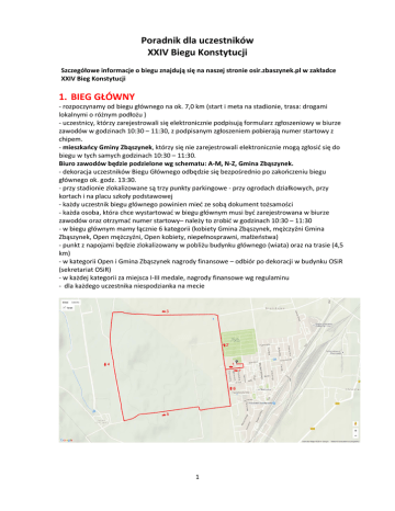 Poradnik dla uczestników XXIV Biegu Konstytucji Szczegółowe informacje o biegu znajdują się na naszej stronie osir.zbaszynek.pl w zakładce XXIV Bieg Konstytucji 1. BIEG GŁÓWNY - rozpoczynamy od biegu głównego na ok. 7,0 km (start i meta na stadionie, trasa: drogami lokalnymi o różnym podłożu ) - uczestnicy, którzy zarejestrowali się elektronicznie podpisują formularz zgłoszeniowy w biurze zawodów w godzinach 10:30 – 11:30, z podpisanym zgłoszeniem pobierają numer startowy z chipem. - mieszkańcy Gminy Zbąszynek, którzy się nie zarejestrowali elektronicznie mogą zgłosić się do biegu w tych samych godzinach 10:30 – 11:30. Biuro zawodów będzie podzielone wg schematu: A-M, N-Z, Gmina Zbąszynek. - dekoracja uczestników Biegu Głównego odbędzie się bezpośrednio po zakończeniu biegu głównego ok. godz. 13:30. - przy stadionie zlokalizowane są trzy punkty parkingowe - przy ogrodach działkowych, przy kortach i na placu szkoły podstawowej - każdy uczestnik biegu głównego powinien mieć ze sobą dokument tożsamości - każda osoba, która chce wystartować w biegu głównym musi być zarejestrowana w biurze zawodów oraz otrzymać numer startowy– należy to zrobić w godzinach 10:30 – 11:30 - w biegu głównym mamy łącznie 6 kategorii (kobiety Gmina Zbąszynek, mężczyźni Gmina Zbąszynek, Open mężczyźni, Open kobiety, niepełnosprawni, małżeństwa) - punkt z napojami będzie zlokalizowany w pobliżu budynku głównego (wiata) oraz na trasie (4,5 km) - w kategorii Open i Gmina Zbąszynek nagrody finansowe – odbiór po dekoracji w budynku OSiR (sekretariat OSiR) - w każdej kategorii za miejsca I-III medale, nagrody finansowe wg regulaminu - dla każdego uczestnika niespodzianka na mecie 1 2. BIEGI MŁODZIEŻY SZKOLNEJ - GIMNAZJUM - biegi gimnazjalne rozpoczynają się o godz. 13:45, dlatego trzeba być kilka minut wcześniej na linii startu - każda osoba przybiega na metę z kartką startową, na której znajdują się podstawowe informacje o uczestniku – imię/nazwisko, rok urodzenia i miejscowość – wypełniamy kartę dużymi drukowanymi literami, karty startowe można wydrukować sobie wcześniej z naszej strony internetowej lub pobrać w dniu zawodów - namiot „Lech” przy placu zabaw - chłopcy z gimnazjum startują na dystansie 750 metrów – park Plac Wolności (bieg wspólny z podziałem na roczniki) - dziewczęta z gimnazjum startują na dystansie 550 metrów na wysokości Gimnazjum (bieg wspólny z podziałem na roczniki) - biegi młodzieży gimnazjalnej dekorujemy po zakończeniu biegów dzieci ze szkół podstawowych - najlepsza trójka w każdym roczniku otrzymuje medale - dla każdego uczestnika niespodzianka na mecie 3. BIEGI MŁODZIEŻY ZE SZKÓŁ PODSTAWOWYCH - biegi młodzieży ze szkół podstawowych rozpoczynają się o godz. 14:00, dlatego należy być na linii startu kilka minut wcześniej - każda osoba przybiega na metę z kartką startową, na której znajdują się podstawowe informacje o uczestniku – imię/nazwisko, rok urodzenia i miejscowość – wypełniamy kartę dużymi drukowanymi literami, karty startowe można wydrukować sobie wcześniej z naszej strony internetowej lub pobrać w dniu zawodów - namiot „Lech” przy placu zabaw 2 Kolejność biegów BIEGAMY ROCZNIKAMI !!! 1. VI klasa Chłopcy na dystansie ok. 550 m Gimnazjum (rocznik 2003) 2.V klasa Chłopcy na dystansie ok. 550 m Gimnazjum (rocznik 2004) 3.VI klasa Dziewczęta na dystansie ok. 450 m Warszawska (rocznik 2003) 4.V klasa Dziewczęta na dystansie ok. 450 m Warszawska (rocznik 2004) 5.IV klasa Chłopcy na dystansie ok. 450 m Warszawska (rocznik 2005) 6.IV klasa Dziewczęta na dystansie ok. 450 m Warszawska (rocznik 2005) 7.III klasa Chłopcy na dystansie ok. 450 m Warszawska (rocznik 2006) 8.III klasa Dziewczęta na dystansie 450 m Warszawska (rocznik 2006) 9.II klasa Chłopcy na dystansie 300 m „Colosseum” (rocznik 2007) 10.I klasa Chłopcy na dystansie 300 m „Colosseum” (rocznik 2008) 11.II klasa Dziewczęta na dystansie 300 m „Colosseum” (rocznik 2007) 12.I klasa Dziewczęta na dystansie 300 m „Colosseum” (rocznik 2008) - każda osoba przybiega na metę z kartką startową, na której znajdują się podstawowe informacje o uczestniku – imię/nazwisko, rok urodzenia i miejscowość – wypełniamy kartę 3 dużymi drukowanymi literami, kart startowe można wydrukować sobie wcześniej z naszej strony internetowej lub pobrać w dniu zawodów - namiot „Lech” przy placu zabaw - biegi młodzieży ze szkół podstawowych dekorujemy po zakończeniu biegu przedszkolaków – około godziny 15:30 - najlepsza trójka w każdym roczniku otrzymuje medale - dla każdego uczestnika niespodzianka na mecie 4. BIEGI PRZEDSZKOLAKÓW – BIEGAMY ROCZNIKAMI !!! - biegi przedszkolaków rozpoczynają się o godz. 15:00 na płycie głównej. Każdy przedszkolak przybiega na metę z kartką startową, na której znajdują się podstawowe informacje o uczestniku – imię/nazwisko, rok urodzenia i miejscowość – wypełniamy kartę dużymi drukowanymi literami, karty startowe można wydrukować sobie wcześniej z naszej strony internetowej lub pobrać w dniu zawodów - namiot „Lech” przy placu zabaw - biegamy na dystansach około 80 metrów (kolejność biegów): - płyta boczna 1. rocznik 2009 2. rocznik 2010 3. rocznik 2011 4. rocznik 2012 5. rocznik 2013 i młodsi - biegi przedszkolaków dekorujemy po ich zakończeniu około godziny 15:30 - najlepsza trójka w każdym roczniku otrzymuje medale - dla każdego uczestnika niespodzianka na mecie 4