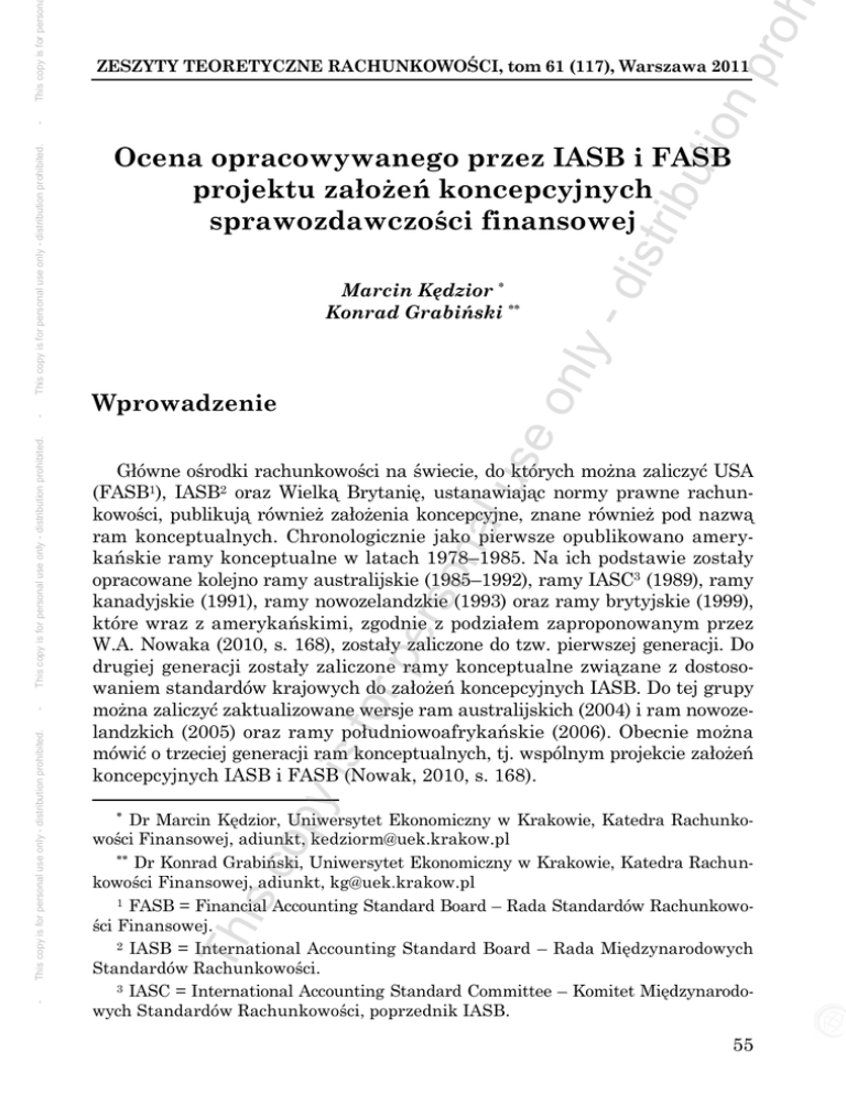 ibu tio np roh This copy is for person - se Wprowadzenie on ly - Marcin Kędzior Konrad Grabiński dis tr Ocena opracowywanego przez IASB i FASB projektu założeń koncepcyjnych sprawozdawczości finansowej y is for pe rso na lu Główne ośrodki rachunkowości na świecie, do których można zaliczyć USA (FASB1), IASB2 oraz Wielką Brytanię, ustanawiając normy prawne rachunkowości, publikują również założenia koncepcyjne, znane również pod nazwą ram konceptualnych. Chronologicznie jako pierwsze opublikowano amerykańskie ramy konceptualne w latach 1978–1985. Na ich podstawie zostały opracowane kolejno ramy australijskie (1985–1992), ramy IASC3 (1989), ramy kanadyjskie (1991), ramy nowozelandzkie (1993) oraz ramy brytyjskie (1999), które wraz z amerykańskimi, zgodnie z podziałem zaproponowanym przez W.A. Nowaka (2010, s. 168), zostały zaliczone do tzw. pierwszej generacji. Do drugiej generacji zostały zaliczone ramy konceptualne związane z dostosowaniem standardów krajowych do założeń koncepcyjnych IASB. Do tej grupy można zaliczyć zaktualizowane wersje ram australijskich (2004) i ram nowozelandzkich (2005) oraz ramy południowoafrykańskie (2006). Obecnie można mówić o trzeciej generacji ram konceptualnych, tj. wspólnym projekcie założeń koncepcyjnych IASB i FASB (Nowak, 2010, s. 168). is c op Dr Marcin Kędzior, Uniwersytet Ekonomiczny w Krakowie, Katedra Rachunkowości Finansowej, adiunkt, [email protected] Dr Konrad Grabiński, Uniwersytet Ekonomiczny w Krakowie, Katedra Rachunkowości Finansowej, adiunkt, [email protected] 1 FASB = Financial Accounting Standard Board – Rada Standardów Rachunkowości Finansowej. 2 IASB = International Accounting Standard Board – Rada Międzynarodowych Standardów Rachunkowości. 3 IASC = International Accounting Standard Committee – Komitet Międzynarodowych Standardów Rachunkowości, poprzednik IASB. Th This copy is for personal use only - distribution prohibited. - This copy is for personal use only - distribution prohibited. - This copy is for personal use only - distribution prohibited. - ZESZYTY TEORETYCZNE RACHUNKOWOŚCI, tom 61 (117), Warszawa 2011 55 ibu tio np roh dis tr on ly - se lu na rso pe for y is op is c Th This copy is for person This copy is for personal use only - distribution prohibited. This copy is for personal use only - distribution prohibited. This copy is for personal use only - distribution prohibited. - Założenia koncepcyjne standardów rachunkowości (sprawozdawczości finansowej) można zdefiniować jako wyraźne, jasno sprecyzowane podstawowe koncepcje, na których opierają się standardy (regulacje) rachunkowości. Koncepcje te są najczęściej ogólne, o szerokim zakresie, oraz stabilne w czasie (Pounder, 2010, s. 22). Inaczej ramy koncepcyjne definiuje J.R. Edwards (2006, s. 40) uznając: konstytucję, spójny system powiązanych ze sobą celów i podstaw, które przyczyniają się do powstania spójnych standardów i tworzą istotę, funkcje i ograniczenia rachunkowości finansowej oraz sprawozdań finansowych. Występuje obiektywna potrzeba tworzenia ram koncepcyjnych, a w dalszym etapie regulacji rachunkowości, ze względu na porażki rynku w dostarczaniu informacji dla różnorodnych użytkowników sprawozdań finansowych. Jest to podyktowane faktem, że osoby posiadające informacje nie są do końca zainteresowane oraz odpowiednio motywowane do ich przekazywania (Christensen, 2010, s. 297), tym bardziej, że rozwiązania dostarczane przez ramy konceptualne są wykorzystywane przez krajowe komitety standardów rachunkowości, jednostki sporządzające sprawozdania finansowe, biegłych rewidentów oraz użytkowników przy interpretacji informacji zawartych w sprawozdaniach finansowych (Jaruga, 2007, s. 527). Założenia koncepcyjne wpływając na standardy rachunkowości wywierają również pośredni wpływ na takie kluczowe kategorie, jak koszt kapitału, oraz na właściwą alokację zasobów. W opinii US SEC4, ogólny reżim prawny standardów corporate governance, standardów rachunkowości, auditingu i egzekucji prawnej zmniejsza koszt kapitału dla firm w gospodarce i powoduje zwiększenie inwestycji oraz wzrost gospodarczy. Wspólny efekt powyższych czynników jest prawdopodobnie istotniejszy dla obniżania kosztu kapitału niż indywidualna firma jest w stanie osiągnąć poprzez poprawę rachunkowości i zwiększenie zakresu ujawnień (Macve, 2010, s. 306). W opinii zaś przedstawicieli środowisk akademickich podstawowym celem standardów rachunkowości, o których kształcie decydują założenia koncepcyjne, jest efektywna alokacja zasobów kapitałowych w gospodarce (Kothari i in., 2010, s. 280). Celowe zatem wydaje się przygotowanie wysokiej jakości ram koncepcyjnych rachunkowości na poziomie światowym, zwłaszcza że globalizacja standardów spowodowała również potrzebę globalizacji założeń koncepcyjnych i stworzenia wspólnego w tym zakresie projektu IASB/FASB (Christensen, 2010, s. 298). Obecnie w sprawozdawczości finansowej mamy do czynienia z procesem konwergencji przepisów i regulacji na poziomie międzynarodowym. Podstawowym celem organów tworzących standardy rachunkowości (głównie IASB oraz FASB) jest wypracowanie wysokiej jakości, spójnych wewnętrznie standardów rachunkowości. Instytucjonalnie głównym elementem zmniejszania różnic w rachunkowości międzynarodowej jest współpraca IASB i FASB. De4 United States Securities and Exchange Commission – Amerykańska Komisja Papierów Wartościowych i Giełd. 56 ibu tio np roh dis tr on ly - se lu na rso pe for This copy is for person This copy is for personal use only - distribution prohibited. - op y is 1. Potrzeba zmian założeń koncepcyjnych sprawozdawczości finansowej is c R. Gore i D. Zimmerman (2007, s. 31), twierdzą, że istnieje obiektywna potrzeba zmiany aktualnych założeń koncepcyjnych sprawozdawczości finansowej nie tylko w Europie czy USA, ale i 