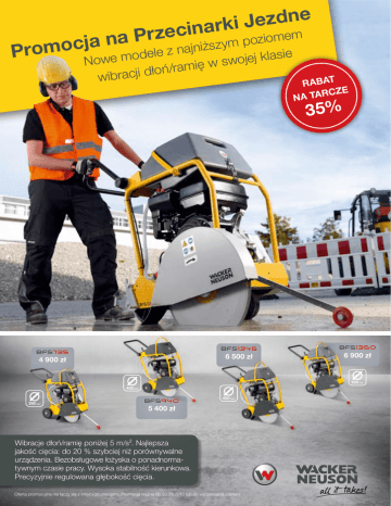 e n d z e J i k r a n i c e z r mem P o i z a o n p m a j c iższy o n j a m n o z r e l P de klasie j e j o w s Nowe mo wibracji dłoń/ramię w RABAT RCZE A T A N 35% BFS1345 BFS735 6 500 zł 4 900 zł BFS1350 6 900 zł 500 mm 400 mm 350 mm BFS940 450 mm 5 400 zł Wibracje dłoń/ramię poniżej 5 m/s². Najlepsza jakość cięcia: do 20 % szybciej niż porównywalne urządzenia. Bezobsługowe łożyska o ponadnormatywnym czasie pracy. Wysoka stabilność kierunkowa. Precyzyjnie regulowana głębokość cięcia. Oferta promocyjna nie łączy się z innymi promocjami. Promocja ważna do 30.09.2015 lub do wyczerpania zapasu. a n a j c o Prom S T B i k r a n i c e pr z 1 Filtr cyklonowy 2 Filtr wstępny 3 Filtr główny Wydajny, 3 stopniowy system filtracji powietrza. Optymalny system filtracji powietrza zapewnia długą żywotność silnika: Filtr cyklonowy [1] oraz 3 warstwowy piankowy filtr wstępny [2] doskonale oczyszczają powietrze z cząstek stałych. Dopiero oczyszone wstepnie powietrze trafia do filtra głównego powietrza [3]. ALNA SPECJ CENA * Wózek ze zbiornikiem na wodę w cenie specjalnej 1 200 zł Region 101 Sprzedaż Maszyn Tel. 604 91 85 53 Serwis, Wynajem Tel. 22 490 42 00 Region 102 Sprzedaż Maszyn Tel. 602 31 90 66 Serwis, Wynajem Tel. 22 490 42 00 Region 601 Sprzedaż Maszyn Tel. 606 94 02 22 Serwis, Wynajem Tel. 61 868 12 28 Region 401 Sprzedaż Maszyn Tel. 604 95 78 31 Serwis, Wynajem Tel. 32 781 00 01 Region 701 Sprzedaż Maszyn Tel. 666 02 45 00 Serwis, Wynajem Tel. 91 462 73 53 Region 402 Sprzedaż Maszyn Tel. 604 45 29 52 Serwis, Wynajem Tel. 12 378 40 04 Region 801 Sprzedaż Maszyn Tel. 602 57 95 16 Serwis, Wynajem Tel. 58 309 11 02 Region 403 Sprzedaż Maszyn Tel. 602 14 78 85 Serwis, Wynajem Tel. 12 378 40 04 Region 802 Sprzedaż Maszyn Tel. 604 12 87 28 Serwis, Wynajem Tel. 56 657 20 03 Region 501 Sprzedaż Maszyn Tel. 604 44 80 22 Serwis, Wynajem Tel. 71 399 18 88 Region 901 Sprzedaż Maszyn Tel. 604 58 31 09 Serwis, Wynajem Tel. 42 278 73 20 Aby uzyskać więcej informacji prosimy o kontakt: Wacker Neuson Sp. z o.o. Sprzedaż, Serwis, Wynajem: Tel. 608 920 930 Dział Sprzedaży Części: Tel. 608 921 930 Centrala: Tel. 22 490 35 00 www.wackerneuson.pl [email protected] 2 80 0 Z Ł