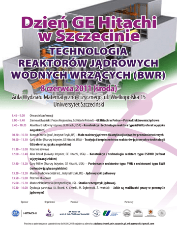 Dzień GE Hitachi w Szczecinie TECHNOLOGIA REAKTORÓW JĄDROWYCH WODNYCH WRZĄCYCH (BWR) 8 czerwca 2011 (środa) Aula Wydziału Matematyczno-Fizycznego, ul. Wielkopolska 15 Uniwersytet Szczeciński 8.45 – 9.00 Otwarcie konferencji 9.00 – 9.40 Ziemowit Iwański (Prezes Regionalny, GE Hitachi Poland) – GE Hitachi w Polsce – Polska Elektrownia Jądrowa 9.40 – 10.20 Alan Beard (Główny Inżynier, GE Hitachi, USA) – Konstrukcja i technologia reaktora typu ABWR (referat w języku angielskim) 10.20 – 10.50 Konrad Czerski (prof., Instytut Fizyki, US) – Małe reaktory jądrowe dla utylizacji odpadów promieniotwórczych 10.50 – 11.30 Gary Miller (Starszy Inżynier, GE Hitachi, USA) – Tradycja i bezpieczeństwo reaktorów jądrowych w technologii GE (referat w języku angielskim) 11.30 – 12.00 Przerwa kawowa 12.00 – 12.40 Alan Beard (Główny Inżynier, GE Hitachi, USA) – Konstrukcja i technologia reaktora typu ESBWR (referat w języku angielskim) 12.40 – 13.20 Gary Miller (Starszy Inżynier, GE Hitachi, USA) – Porównanie reaktorów typu PWR z reaktorami typu BWR (referat w języku angielskim) 13.20 – 13.50 Marcin Buchowiecki (dr inż., Instytut Fizyki, US) – Jądrowy cykl paliwowy 13.50 – 15.00 Przerwa obiadowa 15.00 – 15.30 Mariusz P. Dąbrowski (Instytut Fizyki, US) – Studia z energetyki jądrowej. 15.30 – 16.00 Dyskusja panelowa (A. Beard, K. Czerski, M. Dąbrowski, Z. Iwański) – Jakie są możliwości pracy w przemyśle jądrowym? Sponsor Organizator Patronat Partnerzy JM Rektor US prof. dr hab. Waldemar Tarczyński Prosimy o potwierdzenie uczestnictwa do 06.06.2011 na jeden z adresów: [email protected], [email protected]