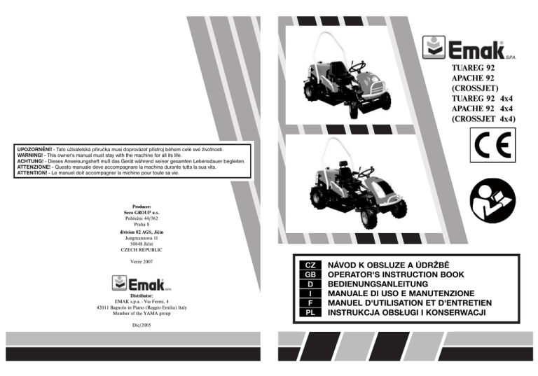 TUAREG 92 APACHE 92 (CROSSJET) TUAREG 92 4x4 APACHE 92 4x4 (CROSSJET 4x4) UPOZORNĚNÍ! - Tato uživatelská příručka musí doprovázet přístroj během celé své životnosti. WARNING! - This owner’s manual must stay with the machine for all its life. ACHTUNG! - Dieses Anweisungsheft muß das Gerät während seiner gesamten Lebensdauer begleiten. ATTENZIONE! - Questo manuale deve accompagnare la machina durante tutta la sua vita. ATTENTION! - Le manuel doit accompagner la michine pour toute sa vie. Producer: Seco GROUP a.s. Pobřežní 44/362 Praha 8 division 02 AGS, Jičín Jungmannova 11 50648 Jičín CZECH REPUBLIC Verze 2007 Distributor: EMAK s.p.a. - Via Fermi, 4 42011 Bagnolo in Piano (Reggio Emilia) Italy Member of the YAMA group Dic/2005 CZ GB D I F PL NÁVOD K OBSLUZE A ÚDRŽBĚ OPERATOR'S INSTRUCTION BOOK BEDIENUNGSANLEITUNG MANUALE DI USO E MANUTENZIONE MANUEL D'UTILISATION ET D'ENTRETIEN INSTRUKCJA OBSŁUGI I KONSERWACJI SPIS TREŚCI OŚWIADCZENIE ZGODNOŚCI Z PRZEPISAMI UE 138 WSTĘP 1 BEZPIECZEŃSTWO PRACY I OCHRONA ZDROWIA PRZY PRACY 1.1 WSKAZÓWKI BEZPIECZEŃSTWA 1.1.1 PRACA NA ZBOCZU 1.1.2 ZABRANIA SIĘ 1.1.3 BEZPIECZEŃSTWO DZIECI 1.1.4 BEZPIECZEŃSTWO PRZECIWPOŻAROWE 139 140 140 142 142 143 143 2 2.1 2.2 2.3 ZASTOSOWANIE I OPIS TECHNICZNY ZASTOSOWANIE MASZYNY OPIS TECHNICZNY OZNACZENIE 144 144 144 145 3. PARAMETRY TECHNICZNE 146 4. 4.1 4.1.1 4.2 4.2.1 4.2.2 4.2.3 4.2.4 4.2.5 4.2.6 WYPAKOWANIE MASZYNY KONTROLA PO WYPAKOWANIU UTYLIZACJA OPAKOWANIA PRZYGOTOWANIE DO EKSPLOATACJI MONTAŻ KIEROWNICY USTAWIENIE WYSOKOŚCI KIEROWNICY MONTAŻ SIEDZENIA USTAWIENIE POZYCJI SIEDZENIA MONTAŻ RAMY OCHRONNEJ PODŁĄCZENIE AKUMULATORA 147 147 147 147 147 147 147 147 147 147 5. 5.1 5.2 5.3 5.4 5.5 5.6 URUCHOMIENIE URZĄDZENIA BY-PASS KONTROLA POZIOMU OLEJU W SILNIKU KONTROLA AKUMULATORA NAPEŁNIENIE ZBIORNIKA BENZYNĄ KONTROLA POZIOMU OLEJU W UKŁADZIE HYDRAULICZNYM KONTROLA SZCZELNOŚCI INSTAL. HYDRAULICZNEJ 148 148 148 148 148 148 148 6. 6.1 6.1.1 6.1.2 6.1.3 6.1.4 6.1.5 6.1.6 6.1.7 6.1.8 6.1.9 6.1.10 6.1.11 6.1.12 6.2 6.2.1 6.2.2 6.2.3 6.2.4 6.3 6.4 6.5 STEROWANIE MASZYNY OPIS ORAZ DZIAŁANIE ELEMENTÓW STEROWANIA WŁĄCZNIK MECHANIZMU TNĄCEGO SKRZYNKA ŁĄCZNIKOWA DŹWIGNIA GAZU SSANIE DŹWIGNIA JAZDY WŁĄCZNIK ŚWIATEŁ ZEGAR PRACY SILNIKA DŹWIGNIA PODNOSZENIA MECHANIZMU TNĄCEGO DŹWIGNIA BY-PASS PEDAŁ HAMULCA PEDAŁ HAMULCA POSTOJOWEGO BLOKADA MECHANIZMU RÓŻNICOWEGO EKSPLOATACJA I OBSŁUGA URUCHOMIENIE WYŁĄCZENIE SILNIKA WŁĄCZENIE I WYŁĄCZENIE MECHANIZMU TNĄCEGO USTAWIENIE WYSOKOŚCI MECHANIZMU TNĄCEGO JAZDA PRĘDKOŚĆ JAZDY JAZDA NA ZBOCZU 149 149 149 149 149 149 149 149 150 150 150 150 150 150 151 151 151 151 152 152 152 152 136 7. 7.1 7.2 7.3 7.4 7.4.1 7.4.2 7.4.3 7.4.4 7.4.5 7.5 7.6 7.7 7.8 7.9 7.9.1 7.9.2 7.10 7.10.1 7.10.2 7.11 7.12 7.13 7.14 KONSERWACJA MASZYNY WYKAZ KONTROLI I REMONTÓW KONTROLA CIŚNIENIA W OPONACH KONSERWACJA AKUMULATORA KONSERWACJA SILNIKA WYMIANA OLEJU WYMIANA FILTRA POWIETRZA KONSERWACJA ŚWIECY ZAPŁONU WYMIANA FILTRA PALIWA KONSERWACJA CHŁODZENIA SILNIKA KONSERWACJA PRZEKŁADNI HYDROSTATYCZNYCH WYMIANA BEZPIECZNIKA WYMIANA ŻARÓWKI REGULACJA DŹWIGNI RUCHU KONSERWACJA NAPĘDU PASY KLINOWE NAPĘDU KONTROLA KOŁA PASOWEGO MECHANIZMU TNĄCEGO KONSERWACJA I KONTROLA PRZYRZĄDU TNĄCEGO STAN OSTRZA PRZYRZĄDU TNĄCEGO WYMIANA PRZYRZĄDU TNĄCEGO CZYSZCZENIE KOSIARKI CZYSZCZENIE MECHANIZMU TNĄCEGO SMAROWANIE WYMIANA KOŁA 153 153 154 154 154 154 154 154 154 154 155 155 155 155 155 155 156 156 156 156 157 157 157 157 8. 8.1 8.2 8.3 USUWANIE USTEREK I DEFEKTÓW SERWIS ZAMAWIANIE CZĘŚCI ZAMIENNYCH GWARANCJA 159 160 160 160 9. KONSERWACJA POSEZONOWA, POSTÓJ ZIMOWY 161 10. UTYLIZACJA MASZYNY 162 137 DEKLARACJA ZGODNOŚCI EU według: A. B. Dyrektywy nr 98/37/EC (Rozporządzenie Rządu NV 24/2003 Dz.) Dyrektywy Rady nr 89/336/EEC (Rozporządzenie Rządu NV 18/2003 Dz.) Dyrektywy Rady nr 2000/14/EC (Rozporządzenie Rządu NV 9/2002 Dz.) My: Seco GROUP a.s., Šaldova 408/30, Praga 8 filia 02 AGS Jičín, Jungmannova 11 REGON: 60193450 hereby issues this following declaration: Maszyna nazwa: Kosiarka samojezdna typ: AC 92 Opis: AC 92 jest czterokołową samojezdną kosiarką z silnikiem Briggs & Stratton 18HP lub 20HP, 23HP. Napęd z silnika jest przenoszony przy pomocy pasa klinowego do bezstopniowej przekładni napędu oraz przez sprzęgło elektromagnetyczne do napędu mechanizmu tnącego. Mechanizm tnący wyposażony jest w jeden rotor o pionowej osi rotacji z szerokością roboczą 92 cm; jest wyposażony w dwa noże obrotowe na jednym nośniku. Koszona masa jest rozrzucana na ziemię C. Przepisy według, których wykonano ocenę zgodności: EN 836+A1;2;3, EN ISO 3767-1;3, ISO 11684, EN ISO 11201, EN ISO 12100-2 Dyrektywa Rady nr 97/68/EC (2002/88/EC D. Ocena zgodności była wykonana zgodnie z postępowaniem określonym w: Dyrektywa Rady nr 98/37/EC, artykuł 8, ustęp 2 a), (rów. §3, ustęp 1 a), RRz nr 24/2003 Dz.) Dyrektywa Rady nr 89/336/EEC, artykuł 10, ustęp 1, (rów. §4, ustęp 1, RRZ nr 18/2003 Dz:) Dyrektywa Rady nr 2000/14/EC, Załącznik VIII ,( rów. Załącznik 7 ,RRz nr 9/2002 Dz. ) z nadzorem autoryzowanej jednostki Numer rejestracji LRQA 0088 Hiramford Middlemarch Office Village Siskin Drive Coventry CV3 4FJ, United Kingdom E. Potwierdzamy, że: urządzenie maszynowe określone na podstawie podanych danych, spełnia wymogi powyżej podanych przepisów technicznych i w warunkach ogólnego zastosowania jest urządzeniem b e z p i e c z e n y m. - dla wszystkich produktów wprowadzonych na rynek przyjęto środki gwarantujące zgodność parametrów produktów z dokumentacją techniczną i wymogami przepisów technicznych. - gwarantowany poziom mocy akustycznej wynosi 100 dB(A). Zmierzone średnie wartości mocy akustycznej dla poszczególnych silników: Silnik Briggs & Stratton 18 HP VANGUARD Briggs & Stratton 20 HP VANGUARD Briggs & Stratton 23 HP VANGUARD Obroty (min-1) 3000±100 3000±100 3000±100 Zmierz