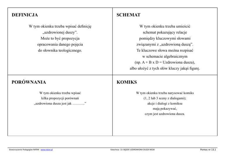 DEFINICJA W tym okienku trzeba wpisać definicję „uzdrowionej duszy”. Może to być propozycja opracowania danego pojęcia do słownika teologicznego. PORÓWNANIA W tym okienku trzeba wpisać kilka propozycji porównań „uzdrowiona dusza jest jak ………..” Stowarzyszenie Pedagogów NATAN www.natan.pl SCHEMAT W tym okienku trzeba umieścić schemat pokazujący relacje pomiędzy kluczowymi słowami związanymi z „uzdrowioną duszą”. Te kluczowe słowa można rozpisać w schemacie algebraicznym (np. A + B x D = Uzdrowiona dusza), albo ułożyć z tych słów kluczy jakąś figurę. KOMIKS W tym okienku trzeba narysować komiks (1, 2 lub 3 sceny z dialogami); akcje i dialogi z komiksu mają pokazywać, czym jest uzdrowiona dusza. Katecheza 13: BĘDZIE UZDROWIONA DUSZA MOJA Pomoc nr 13.1