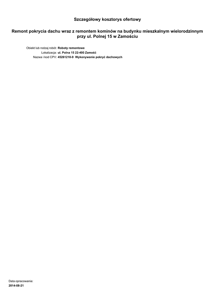 Szczegółowy kosztorys ofertowy Remont pokrycia dachu wraz z remontem kominów na budynku mieszkalnym wielorodzinnym przy ul. Polnej 15 w Zamościu Obiekt lub rodzaj robót: Roboty remontowe Lokalizacja: ul. Polna 15 22-400 Zamość Nazwa i kod CPV: 45261210-9 Wykonywanie pokryć dachowych Data opracowania: 2014-08-21 Wymiana pokrycia dachu- Polna 15 Szczegółowy kosztorys ofertowy ZUZIA11 (C) Datacomp 1994-2014 (lic. 000545A0) strona nr: 2 Przedmiar robót <-NR-> <-PODST-> Nr 1 1.1 Podstawa Kosztorys <-OPIS-> <-JEDN-> Opis robót Jm 1.3 1.4 1.5 1.6 1.7 1.8 1.9 2 2.1 Ilość Remont pokrycia dachu wraz z remontem kominów na budynku mieszkalnym wielorodzinnym przy ul. Polnej 15 w Zamościu Element Remont dachu KNR 401/519/6 Rozbiórka pokrycia z papy, dach betonowy, 1 warstwa Wyliczenie ilości robót: Pokrycie z papy 10,20*(20*3,60) Kominy -11*(0,65*1,75) Obróbki papowe: mury osłonowe ((2*10,2+2*28,4)*2+(2*10,2+2*14,4))*0,8 Obróbki papowe: kominy 11* ((0,65*2+1,75*2)*0,6) RAZEM: 1.2 <-ILOSC-> 734,400000 -12,512500 162,880000 31,680000 916,447500 m2 916,45 KNR 401/519/7 Rozbiórka pokrycia z papy, dach betonowy, warstwa następna Krotność=3 Wyliczenie ilości robót: Pokrycie z papy 10,20*(20*3,60) Kominy -11*(0,65*1,75) 734,400000 -12,512500 RAZEM: 721,887500 m2 KNR 401/203/9 Uzupełnienie elementów konstrukcyjnych z betonu monolitycznego, konstrukcje dachu m3 KNR 401/535/8 Rozebranie obróbek blacharskich: murów ogniowych, okapów kołnierzy, gzymsów itp. z blachy nie nadającej się do użytku Wyliczenie ilości robót: Rozebranie obróbek blacharskich 6*11,1*0,40+20*3,6*0,40 55,440000 RAZEM: 55,440000 m2 KNRW Pokrycie dachów papą termozgrzewalną, 2-warstwowe 202/504/2 Wyliczenie ilości robót: Pokrycie z papy 10,20*(20*3,60) 734,400000 Kominy -11*(0,65*1,75) -12,512500 RAZEM: 721,887500 m2 KNRW Pokrycie dachów papą termozgrzewalną, obróbki z papy nawierzchniowej 202/504/3 Wyliczenie ilości robót: Obróbki papowe: mury osłonowe ((2*10,2+2*28,4)*2+(2*10,2+2*14,4))*0,95 193,420000 Obróbki papowe: kominy 11* ((0,65*2+1,75*2)*0,6) 31,680000 RAZEM: 225,100000 m2 KNKRB 2/503/2 Obróbki i elementy z blachy ocynkowanej obróbki przy szer. w rozwinięciu pow. 25 cm (1) Wyliczenie ilości robót: Rozebranie obróbek blacharskich - murki 6*11,1*0,42+20*3,6*0,42 ogniowe 58,212000 RAZEM: 58,212000 m2 KNR 508/226/4 Montaż listew dociskowych na ścianach, mocowanie za pomocą kołków rozporowych na papę (analogia) Wyliczenie ilości robót: Listwy aluminiowe na kominach 8*(0,62*2+1,30*2)+2*(0,4*2+0,6*2)+(0,8*2+0,6*2) 37,520000 Listwa przy ściance brzeżnej 11,1 11,100000 RAZEM: 48,620000 mb Kalkulacja Utylizacja papy indywidualna Wyliczenie ilości robót: Utylizacja papy 1,08*(923,42+4*717,34)*0,0052 21,300252 RAZEM: 21,300252 t Element Remont kominów KNR 401/1301/6 Naprawa różnych elementów metalowych (wymiana lub uzupełnienie), nakrywy kominów (1) Wyliczenie ilości robót: Komin 1-8, przyjęto 30% powierzchni ((0,8*1,52+0,48*1,38*2+0,55*0,62*2)*8)*0,3 7,734720 Komin 9-10, przyjęto 30% powierzchni ((0,45*0,6*2+0,45*0,4*2+0,78*0,56)*2)*0,3 0,802080 Komin 11, przyjęto 30% powierzchni (0,45*0,8*2+0,45*0,6*2+0,95*0,76)*0,3 0,594600 RAZEM: 9,131400 m2 721,89 3 55,44 721,89 225,10 58,21 48,62 21,30 9,13 Remont pokrycia dachu wraz z remontem kominów na budynku mieszkalnym wielorodzinnym przy ul. Polnej 15 w Zamościu Wymiana pokrycia dachu- Polna 15 Szczegółowy kosztorys ofertowy <-NR-> <-PODST-> ZUZIA11 (C) Datacomp 1994-2014 (lic. 000545A0) strona nr: 3 <-OPIS-> <-JEDN-> Nr Podstawa Opis robót 2.2 KNR 202/1510/3 Malowanie 2-krotne farbą olejną elementów pełnych o powierzchni do 0.50˙m2, bez szpachlowania (1) Wyliczenie ilości robót: Komin 1-8 (0,8*1,52+0,48*1,38*2+0,55*0,62*2)*8 25,782400 Komin 9-10 (0,45*0,6*2+0,45*0,4*2+0,78*0,56)*2 2,673600 Komin 11 0,45*0,8*2+0,45*0,6*2+0,95*0,76 1,982000 RAZEM: 30,438000 2.3 KNR 401/1204/4 Malowanie farbami emulsyjnymi starych tynków, 2-krotne, elewacje - beton (kominy) Wyliczenie ilości robót: Komin 1-8 (0,4*1,38*2+0,4*0,62*2)*8 12,800000 Komin 9-10 (0,4*0,6*2+0,4*0,4*2)*2 1,600000 Komin 11 0,4*0,8*2+0,4*0,6*2 1,120000 RAZEM: 15,520000 2.4 KNKRB 2/503/6 Obróbki i elementy z blachy ocynkowanej obróbki wyłazów dachowych Wyliczenie ilości robót: Wyłazy dachoqwe 2 2,000000 RAZEM: 2,000000 2.5 KNR 202/506/6 Rury wentylacyjne z blachy ocynkowanej - czapki na rurach wywiewnych kanalizacyjnych (2) 2.6 KNKRB 4/112/9 Elementy instalacji kanalizacyjnych osadniki deszczowe stalowe Fi 150 mm (1) Wyliczenie ilości robót: Wpusty deszczowe 5 5,000000 RAZEM: 5,000000 3 Element Naprawa instalacji odgromowej 3.1 KNRW Wymiana przewodów instalacji odgromowej na naprężanej poziomej i pionowej z pręta o średnicy do 10˙mm 403/708/1 na uprzednio zainstalowanych wspornikach, zwód poziomy, dach płaski Wyliczenie ilości robót: 7,5*3 22,500000 RAZEM: 22,500000 3.2 KNR 506/1112/2 Wymiana naciągów metalowych przy masztach azardowych ciągiem R = 0,955 M = 1,000 S = 1,000 Jm <-ILOSC-> Ilość szt 30,44 m2 15,52 szt 2,00 szt 11,00 szt 5,00 m 22,50 szt 9,00 Remont pokrycia dachu wraz z remontem kominów na budynku mieszkalnym wielorodzinnym przy ul. Polnej 15 w Zamościu Wymiana pokrycia dachu- Polna 15 Szczegółowy kosztorys ofertowy ZUZIA11 (C) Datacomp 1994-2014 (lic. 000545A0) strona nr: 4 Kosztorys <-NR-> <-PODST-> Nr Podstawa Kosztorys 1 1.1 Element KNR 401/519/6 1.2 KNR 401/519/7 1.3 1.4 1.5 1.6 1.7 KNR 401/203/9 KNR 401/535/8 KNRW 202/504/2 <-OPIS-> <-JEDN-> Opis robót <-NORMA-> Jm <-ILOSC-> Norma <-CENA-> Ilość <-WARTOSC-> Cena jedn. Wartość Remont pokrycia dachu wraz z remontem kominów na budynku mieszkalnym wielorodzinnym przy ul. Polnej 15 w Zamościu Remont dachu Rozbiórka pokrycia z papy, dach betonowy, 1 warstwa Robocizna Robotnicy Rozbiórka pokrycia z papy, dach betonowy, warstwa następna Krotność=3 Robocizna Robotnicy Uzupełnienie elementów konstrukcyjnych z betonu monolitycznego, konstrukcje dachu