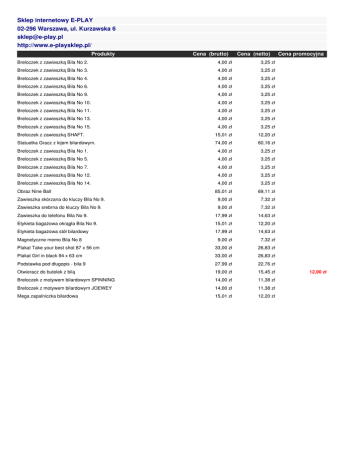 Sklep internetowy E-PLAY 02-296 Warszawa, ul. Kurzawska 6 [email protected] http://www.e-playsklep.pl/ Produkty Cena (brutto) Cena (netto) Breloczek z zawieszką Bila No 2. 4,00 zł 3,25 zł Breloczek z zawieszką Bila No 3. 4,00 zł 3,25 zł Breloczek z zawieszką Bila No 4. 4,00 zł 3,25 zł Breloczek z zawieszką Bila No 6. 4,00 zł 3,25 zł Breloczek z zawieszką Bila No 9. 4,00 zł 3,25 zł Breloczek z zawieszką Bila No 10. 4,00 zł 3,25 zł Breloczek z zawieszką Bila No 11. 4,00 zł 3,25 zł Breloczek z zawieszką Bila No 13. 4,00 zł 3,25 zł Breloczek z zawieszką Bila No 15. 4,00 zł 3,25 zł Breloczek z zawieszką SHAFT. 15,01 zł 12,20 zł Statuetka Gracz z kijem bilardowym. 74,00 zł 60,16 zł Breloczek z zawieszką Bila No 1. 4,00 zł 3,25 zł Breloczek z zawieszką Bila No 5. 4,00 zł 3,25 zł Breloczek z zawieszką Bila No 7. 4,00 zł 3,25 zł Breloczek z zawieszką Bila No 12. 4,00 zł 3,25 zł Breloczek z zawieszką Bila No 14. 4,00 zł 3,25 zł Obraz Nine Ball 85,01 zł 69,11 zł Zawieszka skórzana do kluczy Bila No 9. 9,00 zł 7,32 zł Zawieszka srebrna do kluczy Bila No 9. 9,00 zł 7,32 zł Zawieszka do telefonu Bila No 9. 17,99 zł 14,63 zł Etykieta bagażowa okrągła Bila No 9. 15,01 zł 12,20 zł Etykieta bagażowa stół bilardowy 17,99 zł 14,63 zł 9,00 zł 7,32 zł Plakat Take your best shot 87 x 56 cm 33,00 zł 26,83 zł Plakat Girl in black 94 x 63 cm 33,00 zł 26,83 zł Podstawka pod długopis - bila 9 27,99 zł 22,76 zł Otwieracz do butelek z bilą 19,00 zł 15,45 zł Breloczek z motywem bilardowym SPINNING 14,00 zł 11,38 zł Breloczek z motywem bilardowym JOEWEY 14,00 zł 11,38 zł Mega zapalniczka bilardowa 15,01 zł 12,20 zł Magnetyczne memo Bila No 8 Cena promocyjna 12,00 zł