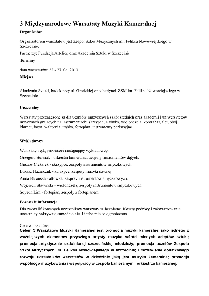 3 Międzynarodowe Warsztaty Muzyki Kameralnej Organizator Organizatorem warsztatów jest Zespół Szkół Muzycznych im. Feliksa Nowowiejskiego w Szczecinie. Partnerzy: Fundacja Artelier, oraz Akademia Sztuki w Szczecinie Terminy data warsztatów: 22 - 27. 06. 2013 Miejsce Akademia Sztuki, budek przy ul. Grodzkiej oraz budynek ZSM im. Feliksa Nowowiejskiego w Szczecinie Uczestnicy Warsztaty przeznaczone są dla uczniów muzycznych szkół średnich oraz akademii i uniwersytetów mzycznych grających na instrumentach: skrzypce, altówka, wiolonczela, kontrabas, flet, obój, klarnet, fagot, waltornia, trąbka, fortepian, instrumenty perkusyjne. Wykładowcy Warsztaty będą prowadzić następujący wykładowcy: Grzegorz Berniak - orkiestra kameralna, zespoły instrumentów dętych. Gustaw Ciężarek - skrzypce, zespoły instrumentów smyczkowych. Łukasz Nazarczuk - skrzypce, zespoły muzyki dawnej. Anna Barańska - altówka, zespoły instrumentów smyczkowych. Wojciech Sławiński - wiolonczela, zespoły instrumentów smyczkowych. Soyeon Lim - fortepian, zespoły z fortepianem. Pozostałe informacje Dla zakwalifikowanych uczestników warsztaty są bezpłatne. Koszty podróży i zakwaterowania uczestnicy pokrywają samodzielnie. Liczba miejsc ograniczona. Cele warsztatów: Celem 3 Warsztatów Muzyki Kameralnej jest promocja muzyki kameralnej jako jednego z ważniejszych elementów przyszłego artysty muzyka wśród młodych adeptów sztuki; promocja artystycznie uzdolnionej szczecińskiej młodzieży; promocja uczniów Zespołu Szkół Muzycznych im. Feliksa Nowowiejskiego w szczecinie; umożliwienie dodatkowego rozwoju uczestników warsztatów w dziedzinie jaką jest muzyka kameralna; promocja wspólnego muzykowania i współpracy w zespole kameralnym i orkiestrze kameralnej. Odbiorcy warsztatów: młodzież ucząca się w szkołach muzycznych, uczniowie Zespołu Szkół Muzycznych im. F. Nowowiejskiego w Szczecinie oraz studenci Akademii Sztuki w Szczecinie, publiczność koncertu finałowego (melomani szczecińscy).