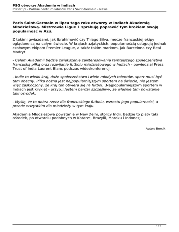 PSG otworzy Akademię w Indiach PSGFC.pl - Polskie centrum kibiców Paris Saint-Germain - News Paris Saint-Germain w lipcu tego roku otworzy w Indiach Akademię Młodzieżową. Mistrzowie Ligue 1 spróbują poprawić tym krokiem swoją popularność w Azji. Z takimi gwiazdami, jak Ibrahimović czy Thiago Silva, mecze francuskiej ekipy oglądane są na całym świecie. W krajach azjatyckich, popularnością ustępują jednak czołowym ekipom Premier League, a także takim markom, jak Barcelona czy Real Madryt. - Celem Akademii będzie zwiększenie zainteresowania tamtejszego społeczeństwa francuską piłką oraz rozwijanie futbolu młodzieżowego w Indiach - powiedział Press Trust of India Laurent Blanc podczas wideokonferencji. - Indie to wielki kraj, duże społeczeństwo i wiele młodych talentów, sport musi być tam obecny. Piłka nożna jest najpopularniejszym sportem na świecie, nie jestem więc zaskoczony, że kraj ten otwiera się na futbol. [Najpopularniejszym sportem w Indiach jest krykiet - przyp.] Jestem bardzo szczęśliwy, że właśnie tam powstanie taki ośrodek. - Myślę, że to dobra rzecz dla francuskiego futbolu, wzrostu jego popularności, a przede wszystkim dla młodzieży w tym kraju. Akademia Młodzieżowa powstanie w New Delhi, stolicy Indii. Będzie to piąty taki ośrodek, po otwarciu podobnych w Katarze, Brazylii, Maroku i Indonezji. Autor: Bercik 1/1 Powered by TCPDF (www.tcpdf.org)