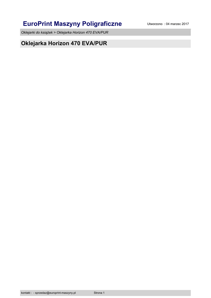 EuroPrint Maszyny Poligraficzne Oklejarki do książek > Oklejarka Horizon 470 EVA/PUR Oklejarka Horizon 470 EVA/PUR kontakt : - [email protected] Strona 1 Utworzono : 04 marzec 2017 EuroPrint Maszyny Poligraficzne Utworzono : 04 marzec 2017 Oklejarki do książek > Oklejarka Horizon 470 EVA/PUR Oklejarka Horizon 470 EVA/PUR Model : Oklejarka Horizon 470 EVA/PUR Producent : Charakterystyczną cechą oklejarki Horizon BQ 470 jest zastosowanie wymiennych klejowników pozwalających oklejać książki w technologii klejenia gorącym klejem (EVA) i w technologii klejenia klejem poliuretanowym (PUR). W urządzeniu zastosowano nieszkodliwą dla zdrowia technologię mikro emisji kleju PUR. Oklejarka doskonale nadaje się do klejenia książek z najtrudniejszych materiałów, książek o podwyższonej wytrzymałości, do klejenia małych nakładów i klejenia książek wykonywanych w technologii druku cyfrowego. Oklejarka została wyposażona w dotykowy panel sterowania w technologii Touch & Work i kolorowy wyświetlacz. Te elementy wyposażenia pozwalają na w pełni automatyczny narząd oklejarki i szybki czas narządu. Stacja podawania okładki jest wyposażona w bęben zasysający podający okładki, co umożliwia płynną i bezawaryjną pracę oklejarki. Urządzenie może pracować w systemie CIP4 pozwalającym sterować produkcją za pomocą plików JDF. W tym celu należy wyposażyć je w system i2i Horizon. � � zespół szybkoobrotowych frezów i�zespół nacinaków, � sztywną konstrukcję szczęki trzymającą równo wkład podczas frezowania i�nakładania kleju, � klejownik z�dwoma wałkami nakładającymi klej na grzbiet (wymienny dla EVA i PUR), � osobny klejownik z�talerzykami do nakładania kleju dla bocznego klejenia, � ustawiany automatycznie zespół bigujący, � pompę ssącą powietrza, � wyciąg oparów kleju, � wyciąg pyłu powstającego przy frezowaniu grzbietów. Zaletami oklejarki są:� � wysoka precyzja i�dokładność oklejania, � możliwość stosowania technologii EVA i�technologii PUR za pomocą jednego urządzenia, � trwała i�stabilna wydajność w�przypadku klejenia najtrudniejszych materiałów, � krótki czas przygotowania maszyny do pracy dzięki zastosowaniu pełnej automatyzacji narządu, � możliwość zastosowania do małych i�średnich nakładów, � możliwość klejenia grzbietów o�grubości od 1 do 65 mm (grubość może być ograniczona ze względu na jakość, rodzaj materiału oraz sposób przygotowania wkładów). Parametry techniczne:� � ilość szczęk -�4, � format oprawy minimalny 145 x�105 mm; format oprawy maksymalny 320 x�320 mm, � grubość oprawy od 1 do 65 mm (EVA), od 1�do 40 mm (PUR), � format okładki minimalny 135 x�225 mm; format okładki maksymalny 320 x�660 mm (ze względu na możliwości ustawienia bigów 310 mm od strony przedniej okładki i�350 mm od strony tylnej okładki), � gramatura okładki 80 do 300 g/m; 100 do 350 g/m -�papier powlekany, � wysokość stosu okładek 150 mm, kontakt : - [email protected] Strona 2 EuroPrint Maszyny Poligraficzne Oklejarki do książek > Oklejarka Horizon 470 EVA/PUR Oklejarka Horizon 470 EVA/PUR � głębokość frezowania do 4�mm, � wydajność katalogowa do 1.350 cykli/h (EVA), � zasilanie 3�x�400 V, � wymiary 3630 x�2240 x�2000 mm � waga 2100 kg. � Cena : 0,00 zł Brutto ( 0,00 zł Netto) Dostępność: Produkt dostępny w naszym sklepie od 25 styczeń 2014 kontakt : - [email protected] Strona 3 Utworzono : 04 marzec 2017