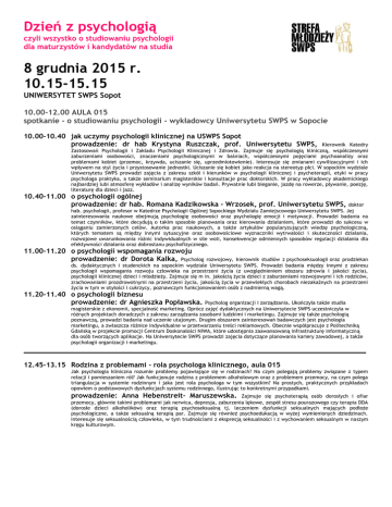 Dzień z psychologią czyli wszystko o studiowaniu psychologii dla maturzystów i kandydatów na studia 8 grudnia 2015 r. 10.15-15.15 UNIWERSYTET SWPS Sopot 10.00-12.00 AULA 015 spotkanie - o studiowaniu psychologii - wykładowcy Uniwersytetu SWPS w Sopocie 10.00-10.40 jak uczymy psychologii klinicznej na USWPS Sopot prowadzenie: dr hab Krystyna Ruszczak, prof. Uniwersytetu SWPS, Kierownik Katedry Zastosowań Psychologii i Zakładu Psychologii Klinicznej i Zdrowia. Zajmuje się psychologią kliniczną, współczesnymi zaburzeniami osobowości, znaczeniami psychologicznymi w baśniach, współczesnymi pojęciami psychoanalizy oraz problemami kobiet (przemoc, krzywda, uciszanie się, uprzedmiotowienie). Interesuje się zmianami cywilizacyjnymi i ich wpływem na styl życia i przystosowanie jednostki. Uciszanie się kobiet jako reakcja na stereotyp płci. W sopockim wydziale Uniwersytetu SWPS prowadzi zajęcia z zakresu szkół i kierunków w psychologii klinicznej i psychoterapii, etyki w pracy psychologa praktyka, a także seminarium magisterskie i konsultacje prac doktorskich. W pracy wykładowcy akademickiego najbardziej lubi atmosferę wykładów i analizę wyników badań. Prywatnie lubi bieganie, jazdę na rowerze, pływanie, poezję, literaturę dla dzieci i jazz. 10.40-11.00 o psychologii ogólnej prowadzenie: dr hab. Romana Kadzikowska - Wrzosek, prof. Uniwersytetu SWPS, doktor hab. psychologii, profesor w Katedrze Psychologii Ogólnej Sopockiego Wydziału Zamiejscowego Uniwersytetu SWPS. Jej zainteresowania naukowe obejmują psychologię osobowości oraz psychologię emocji i motywacji. Prowadzi badania na temat czynników, które decydują o takim sposobie planowania oraz kierowania działaniem, które prowadzi do sukcesu w osiąganiu zamierzonych celów. Autorka prac naukowych, a także artykułów popularyzujących wiedzę psychologiczną, których tematem są między innymi sytuacyjne oraz osobowościowe wyznaczniki wytrwałości i skuteczności działania, rozwojowe uwarunkowania różnic indywidualnych w sile woli, konsekwencje odmiennych sposobów regulacji działania dla efektywności działania oraz dobrostanu psychofizycznego. 11.00-11.20 o psychologii wspomagania rozwoju prowadzenie: dr Dorota Kalka, Psycholog rozwojowy, kierownik studiów z psychoseksuologii oraz prodziekan ds. dydaktycznych i studenckich na sopockim wydziale Uniwersytetu SWPS. Prowadzi badania między innymi z zakresu psychologii wspomagania rozwoju człowieka na przestrzeni życia (z uwzględnieniem obszaru zdrowia i jakości życia), psychologii klinicznej dzieci i młodzieży. Zajmuje się m in. jakością życia dzieci z zaburzeniami rozwojowymi i ich rodziców, zrachowaniami prozdrowotnymi na przestrzeni życia, jakością życia w przewlekłych chorobach niezakaźnych na przestrzeni życia w tym w otyłości i cukrzycy, poznawczym funkcjonowaniem osób z nadmierną wagą. 11.20-11.40 o psychologii biznesu prowadzenie: dr Agnieszka Popławska. Psycholog organizacji i zarządzania. Ukończyła także studia magisterskie z ekonomii, specjalność marketing. Oprócz zajęć dydaktycznych na Uniwersytecie SWPS uczestniczyła w różnych projektach doradczych z zakresu zarządzania zasobami ludzkimi i marketingu. Zajmuje się także psychologią poznawczą, prowadzi badania nad uczenie utajonym. Drugim obszarem zainteresowań badawczych jest psychologia marketingu, a zwłaszcza różnice indywidualne w przetwarzaniu treści reklamowych. Obecnie współpracuje z Politechniką Gdańską w projekcie promocji Centrum Doskonałości NIWA, które udostępnia zaawansowaną infrastrukturę informatyczną dla osób tworzących aplikacje. Na Uniwersytecie SWPS prowadzi zajęcia dotyczące planowania kariery zawodowej, a także psychologii organizacji i marketingu. __________________________________________________________________________ 12.45-13.15 Rodzina z problemami - rola psychologa klinicznego, aula 015 Jak psychologia kliniczna rozumie problemy pojawiające się w rodzinach? Na czym polegają problemy związane z typem relacji i pomieszaniem ról? Jak funkcjonuje rodzina z problemem alkoholowym oraz z problemem przemocy, na czym polega triangulacja w systemie rodzinnym i jaka jest rola psychologa w tym wszystkim? Na prostych, praktycznych przykładach opowiem o podstawowych dysfunkcjach systemu rodzinnego, ilustrując to konkretnymi przypadkami. prowadzenie: Anna Hebenstreit- Maruszewska. Zajmuje się psychoterapią osób dorosłych i ofiar przemocy, głównie takimi problemami jak nerwica, depresja, zaburzenia lękowe, zespół stresu pourazowego czy terapia DDA (dorosłe dzieci alkoholików) oraz terapią psychoseksualną tj. leczeniem dysfunkcji seksualnych mających podłoże psychologiczne, a także seksualną terapią par. Zajmuje się również psychoedukacją w wyżej wymienionych dziedzinach. Interesuje się seksualnością człowieka, w tym trudnościami z ekspresją seksualności i z wychowaniem seksualnym w naszym kręgu kulturowym. 12.00-13.00 gra edukacyjna - MORDERSTWO W BIBLIOTECE Gra adresowana jest do uczniów szkół średnich, kandydatów na studia psychologiczne, może być także wykorzystana do integracji studentów pierwszego roku kierunku Psychologia. Maksymalnie w jednej turze gry może uczestniczyć 25 osób. Uczestnicy są dzieleni na 5 grup. Celem zabawy jest zapoznanie graczy z uczelnią, rozkładem jej pomieszczeń i funkcjonowaniem biur. Zadanie uczestników polega na wykryciu kto zamordował bibliotekarkę, a także na skompletowaniu wszystkich elementów portretu pamięciowego mordercy. Gra składa się z 10 punktów zatrzymań (etapów). Na każdym z etapów na graczy czeka jakieś zadanie. Za poprawne jego zrealizowanie otrzymują fragment zdjęcia mordercy. Wszystkie etapy zabawy i kolejność ich wykonywania zaznaczone są na komplecie 3 mapek, które dostaje na początku gry każda z drużyn. Każda mapka odpowiada jednemu piętru budynku. Wygrywa drużyna, która 