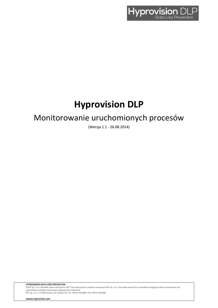 Hyprovision DLP Monitorowanie uruchomionych procesów (Wersja 1.1 - 26.08.2014) HYPROVISION DATA LOSS PREVENTION © BTC Sp. z o.o. Wszelkie prawa zastrzeżone. BTC® jest zastrzeżonym znakiem towarowym BTC Sp. z o.o. Pozostałe nazwy firm i produktów mogą być znakami towarowymi lub zastrzeżonymi znakami towarowymi odpowiednich właścicieli. BTC Sp. z o.o. |71-064 Szczecin, Al. Piastów 30 | tel. +48 91 4331880 | fax +48 91 4331890 wwww.hyprovision.com Rozpoczęcie monitorowania uruchomionych procesów przez system Hyprovision DLP wymaga wykonania poniższych 5 kroków: 1) 2) 3) 4) 5) Stworzenie zbioru masek procesów definiującego które procesy mają być monitorowane. Stworzenie i zdefiniowanie polityki PROCESS. Stworzenie grupy obiektów (komputerów) na których ma działać reguła bezpieczeństwa. Stworzenie reguły bezpieczeństwa. Uruchomienie (instalacja) polityk na agentach. Poszczególne kroki opisane są szczegółowo w dalszej części tego dokumentu. HYPROVISION DATA LOSS PREVENTION © BTC Sp. z o.o. Wszelkie prawa zastrzeżone. BTC® jest zastrzeżonym znakiem towarowym BTC Sp. z o.o. Pozostałe nazwy firm i produktów mogą być znakami towarowymi lub zastrzeżonymi znakami towarowymi odpowiednich właścicieli. BTC Sp. z o.o. |71-064 Szczecin, Al. Piastów 30 | tel. +48 91 4331880 | fax +48 91 4331890 wwww.hyprovision.com KROK 1: W celu utworzenia zbioru masek procesów należy: 1) 2) 3) 4) 5) 6) 7) W menu górnym kliknąć „Repozytorium”. W menu „Repozytorium” kliknąć „Maski procesów”. W widoku „Repozytorium >> Maski procesów” kliknąć „Dodaj”. W oknie „Nowy rekord” wprowadzić nazwę zbioru masek procesów. W oknie „Nowy rekord” wprowadzić opis zestawu masek procesów. W oknie „Nowy rekord” wprowadzić maski procesów. W oknie „Nowy rekord” kliknąć „OK”. HYPROVISION DATA LOSS PREVENTION © BTC Sp. z o.o. Wszelkie prawa zastrzeżone. BTC® jest zastrzeżonym znakiem towarowym BTC Sp. z o.o. Pozostałe nazwy firm i produktów mogą być znakami towarowymi lub zastrzeżonymi znakami towarowymi odpowiednich właścicieli. BTC Sp. z o.o. |71-064 Szczecin, Al. Piastów 30 | tel. +48 91 4331880 | fax +48 91 4331890 wwww.hyprovision.com KROK 2: W celu utworzenia i zdefiniowania polityki PROCESS należy: 1) 2) 3) 4) 5) 6) 7) 8) 9) 10) 11) 12) W menu lewym kliknąć „Ochrona danych [DLP]”. W menu „Ochrona danych [DLP]” kliknąć „PROCESS”. W widoku „Ochrona danych [DLP] >> Polityka PROCESS” kliknąć „Dodaj”. W oknie „Nowa polityka” wprowadzić nazwę nowej polityki. W oknie „Nowa polityka” wprowadzić opis nowej polityki. W oknie „Nowa polityka” kliknąć „OK”. W widoku „Polityka PROCESS” wskazać wykorzystywany zbiór masek procesów. W widoku „Polityka PROCESS” wskazać czy logować naruszenie polityki oraz z jakim komunikatem. W widoku „Polityka PROCESS” wskazać czy proces ma być automatycznie zamykany. W widoku „Polityka PROCESS” wskazać czy użytkownik ma zostać poinformowany o naruszeniu. W widoku „Polityka PROCESS” kliknąć „OK”. W oknie z komunikatem „Zapisane” kliknąć „Zamknij”. HYPROVISION DATA LOSS PREVENTION © BTC Sp. z o.o. Wszelkie prawa zastrzeżone. BTC® jest zastrzeżonym znakiem towarowym BTC Sp. z o.o. Pozostałe nazwy firm i produktów mogą być znakami towarowymi lub zastrzeżonymi znakami towarowymi odpowiednich właścicieli. BTC Sp. z o.o. |71-064 Szczecin, Al. Piastów 30 | tel. +48 91 4331880 | fax +48 91 4331890 wwww.hyprovision.com KROK 3: W celu utworzenia grupy obiektów (komputerów) należy: 1) 2) 3) 4) 5) 6) 7) 8) W menu lewym kliknąć „Ochrona danych [DLP]”. W menu „Ochrona danych [DLP]” kliknąć „Reguły i logi”. W widoku „Reguły i logi” kliknąć „Dodaj regułę”. W oknie „Nowy rekord” kliknąć „Dodaj/Modyfikuj” (ikona ołówka). W oknie „Nowa grupa urządzeń” wprowadzić nazwę grupy urządzeń. W oknie „Nowa grupa urządzeń” wybrać komputery za pomocą dostępnych filtrów. W oknie „Nowa grupa urządzeń” kliknąć „OK”. W oknie „Nowy rekord” kliknąć „Anuluj”. HYPROVISION DATA LOSS PREVENTION © BTC Sp. z o.o. Wszelkie prawa zastrzeżone. BTC® jest zastrzeżonym znakiem towarowym BTC Sp. z o.o. Pozostałe nazwy firm i produktów mogą być znakami towarowymi lub zastrzeżonymi znakami towarowymi odpowiednich właścicieli. BTC Sp. z o.o. |71-064 Szczecin, Al. Piastów 30 | tel. +48 91 4331880 | fax +48 91 4331890 wwww.hyprovision.com KROK 4: W celu utworzenia reguły bezpieczeństwa należy: 1) 2) 3) 4) 5) 6) 7) 8) 9) 10) W menu lewym kliknąć „Ochrona danych [DLP]”. W menu „Ochrona danych [DLP]” kliknąć „Reguły i logi”. W widoku „Reguły i logi” kliknąć „Dodaj regułę”. W oknie „Nowy rekord” określić czy reguła ma być włączona. W oknie „Nowy rekord” określić z jakiej polityki ma dana reguła korzystać. W oknie „Nowy rekord” określić na jakiej grupie obiektów ma dana reguła obowiązywać. W oknie „Nowy rekord” wprowadzić użytkowników których reguła ma dotyczyć („*” - wszyscy). W oknie „Nowy rekord” określić czy reguła posiada termin po którym wygasa. W oknie „Nowy rekord” wprowadzić opis danej reguły bezpieczeństwa. W oknie „Nowy rekord” kliknąć „OK”. HYPROVISION DATA LOSS PREVENTION © BTC Sp. z o.o. Wszelkie prawa zastrzeżone. BTC® jest zastrzeżonym znakiem towarowym BTC Sp. z o.o. Pozostałe nazwy firm i produktów mogą być znakami towarowymi lub zastrzeżonymi znakami towarowymi odpowiednich właścicieli. BTC Sp. z o.o. |71-064 Szczecin, Al. Piastów 30 | tel. +48 91 4331880 | fax +48 91 4331890 wwww.hyprovision.com KROK 5: W celu uruchomienia (zainstalowania) polityki na agentach należy: 1) W menu lewym kliknąć „Ochrona danych [DLP]”. 2) W menu „Ochrona danych [DLP]” kliknąć „Reguły i logi”. 3) W widoku „Ochrona danych [DLP]” k
