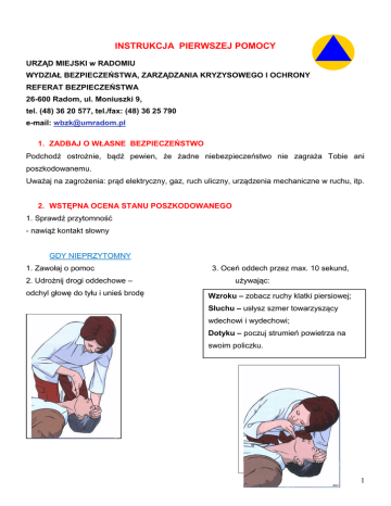 INSTRUKCJA PIERWSZEJ POMOCY URZĄD MIEJSKI w RADOMIU WYDZIAŁ BEZPIECZEŃSTWA, ZARZĄDZANIA KRYZYSOWEGO I OCHRONY REFERAT BEZPIECZEŃSTWA 26-600 Radom, ul. Moniuszki 9, tel. (48) 36 20 577, tel./fax: (48) 36 25 790 e-mail: [email protected] 1. ZADBAJ O WŁASNE BEZPIECZEŃSTWO Podchodź ostrożnie, bądź pewien, że żadne niebezpieczeństwo nie zagraża Tobie ani poszkodowanemu. Uważaj na zagrożenia: prąd elektryczny, gaz, ruch uliczny, urządzenia mechaniczne w ruchu, itp. 2. WSTĘPNA OCENA STANU POSZKODOWANEGO 1. Sprawdź przytomność - nawiąż kontakt słowny GDY NIEPRZYTOMNY 1. Zawołaj o pomoc 2. Udrożnij drogi oddechowe – odchyl głowę do tyłu i unieś brodę 3. Oceń oddech przez max. 10 sekund, używając: Wzroku – zobacz ruchy klatki piersiowej; Słuchu – usłysz szmer towarzyszący wdechowi i wydechowi; Dotyku – poczuj strumień powietrza na swoim policzku. 1 3. PODSTAWOWE PODTRZYMYWANIE ŻYCIA (resuscytacja krążeniowo-oddechowa RKO) Nieprzytomny bez prawidłowego oddechu: - wezwij pomoc (999, 112) - wykonuj na przemian: 30 ucisków mostka – 2 wdmuchnięcia Odchyl głowę poszkodowanego Zatkaj nos poszkodowanego Szczelnie obejmij swoimi wargami usta poszkodowanego Wykonuj spokojny wdech (1s) Obserwuj unoszenie się klatki piersiowej poszkodowanego W przypadku dziecka masaż serca wykonujemy jedną ręką, a u niemowlaka – dwoma palcami. Na podstawie Wytycznych ERC 2010 Nieprzytomny z prawidłowym oddechem a przeprowadź badanie wstępne b wezwij Pogotowie (tel. 999) c połóż poszkodowanego w pozycji bezpiecznej 2 POZYCJA BEZPIECZNA ściągnij poszkodowanemu okulary klęknij obok poszkodowanego, upewnij się, że ma obie nogi wyprostowane umieść ramię bliższe Ciebie pod kątem prostym do tułowia, zegnij w łokciu, tak aby dłoń była skierowana ku górze drugie ramię przełóż przez klatkę piersiową i przyciśnij grzbiet dłoni poszkodowanego do jego policzka po swojej stronie. drugą ręką chwyć dalszą nogę poszkodowanego tuż powyżej kolana i zegnij ją utrzymując stopę na podłożu. trzymając przyciśniętą dłoń do policzka, pociągnij za zgiętą nogę obracając poszkodowanego na swoją stronę. ustaw leżącą nogę tak, aby zarówno biodro, jak i kolano były zgięte pod kątem prostym. odchyl głowę upewniając się, że drogi oddechowe pozostają drożne. wsuń dłoń pod policzek, jeśli to konieczne, tak aby utrzymywała odgięcie głowy. sprawdzaj regularnie oddech. SCHEMAT POSTĘPOWANIA Oceń bezpieczeństwo Oceń przytomność 30 uciśnięć Wezwij pomoc Udrożnij drogi oddechowe Oceń oddech Zadzwoń 999, 112 2 oddechy ratownicze 3 Gdy brak oddechu: Dorosły od okresu pokwitania Dziecko 1 rok życia - do okresu pokwitania Niemowlę 0-1 rok życia Sztuczne oddychanie 12 wdechów/min. 20 wdechów /min. 30 wdechów/min. Gdy brak krążenia: Rozpoczęcie od 30 ucisków 5 wdechów, a następnie 30 ucisków 5 wdechów, a następnie 30 ucisków Miejsce ucisku Środek klatki piersiowej 1 palec powyżej dołu mostka 1 palec poniżej linii sutkowej Głębokość ucisku 5 cm ok. 5 cm ok. 4 cm Częstotliwość ucisku 100 uciśnięć/minutę 100 uciśnięć/minutę 100 uciśnięć/minutę Oddech:ucisk 30:2 30:2 30:2 Opracowała Iwona Wnuk – inspektor WB,ZKiO UM w Radomiu 4