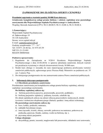 Znak sprawy: ZP/2503/14/2014 Andrychów, dnia 23.10.2014r. ZAPROSZENIE DO ZŁOŻENIA OFERTY CENOWEJ Przedmiot zapytania o wartości poniżej 30 000 Euro dotyczy: świadczenie kompleksowej usługi prania bielizny i odzieży szpitalnej oraz pozostałego asortymentu dla Wojewódzkiego Szpitala Psychiatrycznego w Andrychowie. Wspólny Słownik Zamówień (CPV): 98.31.00.00-9, 98.31.10.00–6, 98.31.50.00-4. 1.Zamawiający: Wojewódzki Szpital Psychiatryczny ul. Dąbrowskiego 19 34-120 Andrychów Strona: www.szpital.info.pl E-mail: [email protected] Godziny urzędowania: 7 00 – 14 35 Tel: 33/875 -24-46 fax. 33/ 875-45-59 NIP 551-21-23-091 REGON 000805666 Podstawa opracowania: 1. Regulamin do Zarządzenia nr 9/2014 Dyrektora Wojewódzkiego Szpitala Psychiatrycznego z dnia 22.04.2014r. w sprawie udzielania zamówień, których wartość nie przekracza wyrażonej w złotych równowartości kwoty 30 000 euro. 2. Średni kurs złotego w stosunku do euro stanowiącego podstawę przeliczania wartości zamówień publicznych, ogłoszonego przez Prezesa Rady Ministrów na podstawie art. 35 ust. 3 ustawy Pzp. 3. Do niniejszego postępowania nie ma zastosowania ustawa Prawo zamówień publicznych. I. Informacje dotyczące postępowania 1.1 Określenie przedmiotu zamówienia: Przedmiotem zamówienia jest kompleksowa usługa prania bielizny szpitalnej, odzieży szpitalnej i pozostałego asortymentu. Do bielizny szpitalnej zalicza się: a) bieliznę pościelową (poszwy, prześcieradła, poszewki, podkłady), b) bieliznę pacjentów szpitala tj.: pidżamy, koszule, szlafroki itp. Do ubrań szpitalnych zalicza się odzież roboczą pracowników medycznych, działu żywienia i techniczno-eksploatacyjnego (fartuch, spodnie i inną odzież ochronną), Do pozostałego asortymentu zalicza się: a) koce, kołdry, poduszki, materace, b) nakładki bawełniane (mop), c) inne (ręczniki, ścierki, obrusy, serwetki, pokrowce na materace, pokrowce na poduszkę, parawan, firanki, zasłony, worki na bieliznę, itp. ), d) prywatną odzież pacjentów. Usługa obejmuje: a) dezynfekcję, pranie, suszenie, maglowanie lub prasowanie, składanie oraz sortowanie, 1 Znak sprawy: ZP/2503/14/2014 Andrychów, dnia 23.10.2014r. b) krochmalenie asortymentu uzgodnionego przez Zamawiającego tj. obrusy, bieżniki/serwetki, c) czyszczenie chemiczne, naprawy szwalnicze (szycie, reperacja itd.), d) odbiór asortymentu brudnego przez Wykonawcę, załadunek i transport, rozładunek czystego asortymentu do magazynu bielizny czystej Zamawiającego na koszt Wykonawcy. 1.2 Wielkość i struktura zamówienia: a) Szacunkowa ilość bielizny i odzieży szpitalnej oraz pozostałego asortymentu przeznaczonego do prania w skali 12 miesięcy określona jest w formularzu cenowym stanowiącym załącznik nr 1a. b) Wykonawcy, z którym zamawiający podpisze umowę nie przysługuje roszczenie o realizację usługi w wielkości podanej w formularzu cenowym. Usługi dokonywane w trakcie realizacji umowy mogą różnić się ilościowo od wartości podanej w formularzu cenowym, jednak łączna wartość usług nie przekroczy całkowitej wartości oferty wybranego wykonawcy. 1.3 Wymagania Zamawiającego: a) Jakość wypranej bielizny pod względem czystości mikrobiologicznej ma być poparta badaniami mikrobiologicznymi wykonanymi przez pracownie mikrobiologiczne raz na 3 miesiące lub doraźnie w dochodzeniu epidemiologicznym , na koszt Wykonawcy z partii bielizny wskazanej przez Zamawiającego, b) Wykonawca zobowiązuje się do wykonania usługi prania asortymentu i jego dostarczenia w ciągu 48 godzin własnym transportem. Usługa ma być wykonana przez trzy dni w tygodniu: w poniedziałki, środy, piątki, c) Wykonawca odbierze asortyment brudny z magazynu bielizny brudnej Zamawiającego od godziny 1000 do 1100 w każdy dzień świadczonej usługi, d) Wykonawca dostarczy czysty asortyment do magazynu bielizny czystej w każdy dzień świadczonej usługi raz dziennie od 900 do 1000, e) w okresie kumulacji dni wolnych od pracy przypadających w dni wykonywania usługi, usługa będzie wykonywana w najbliższy dzień poprzedzający i następujący, f) każdorazowe przekazanie brudnej bielizny/czystej bielizny musi być potwierdzone pisemnie przez upoważnionych przedstawicieli stron na druku, protokół zdawczoodbiorczy, zawierającym specyfikację asortymentowo-ilościową, g) stosowanie oddzielnych środków transportu na brudny i czysty asortyment. W przypadkach kiedy transport odbywa się jednym samochodem, najpierw dowożona jest czysta bielizna, następnie zabierana brudna lub samochodem posiadającym podzieloną komorę załadunkową zabezpieczającą przed kontaktem bielizny brudnej i czystej, h) Wykonawca zobowiązany jest do przetransportowania asortymentu z magazynu brudnej i czystej bielizny do samochodu, i) Wykonawca odpowiada za przyjęty ładunek bielizny szpitalnej z chwilą jego pobrania i załadunku, j) Wykonawca jest zobowiązany zabezpieczyć ładunek bielizny szpitalnej przed uszkodzeniem, dostępem osób trzecich, wpływem czynników zewnętrznych oraz wpływem ładunku na otoczenie, 2 Znak sprawy: ZP/2503/14/2014 Andrychów, dnia 23.10.2014r. k) Maglowanie i prasowanie bielizny należy prowadzić w sposób ograniczający jej kontakt z innymi powierzchniami i czynnikami, które mogłyby spowodować jej zakażenie lub zabrudzenie, l) Wykonawca powinien oddzielić rzeczy uszkodzone i naprawić je tzn. przeszyć na maszynie szwem ciągłym, naprawić szwy boczne, zszyć rozdarte części bielizny, wszyć suwak, gumki uzupełnić troki, napy, guziki itp. ponosząc koszty potrzebnych użytych materiałów, m) W przypadku kiedy odebrana przez Zamawiającego bielizna szpitalna nie spełnia jego wymagań (np. pranie brudne, mokre, wilgotne itp.), Zamawiający odnotowuje ten fakt w dokumencie zdawczo-odbiorczym bielizny odebranej, co będzie równoznaczne z wypełnieniem kwitu reklamacyjnego – wg wzoru stanowiącego załącznik do umowy, n) 