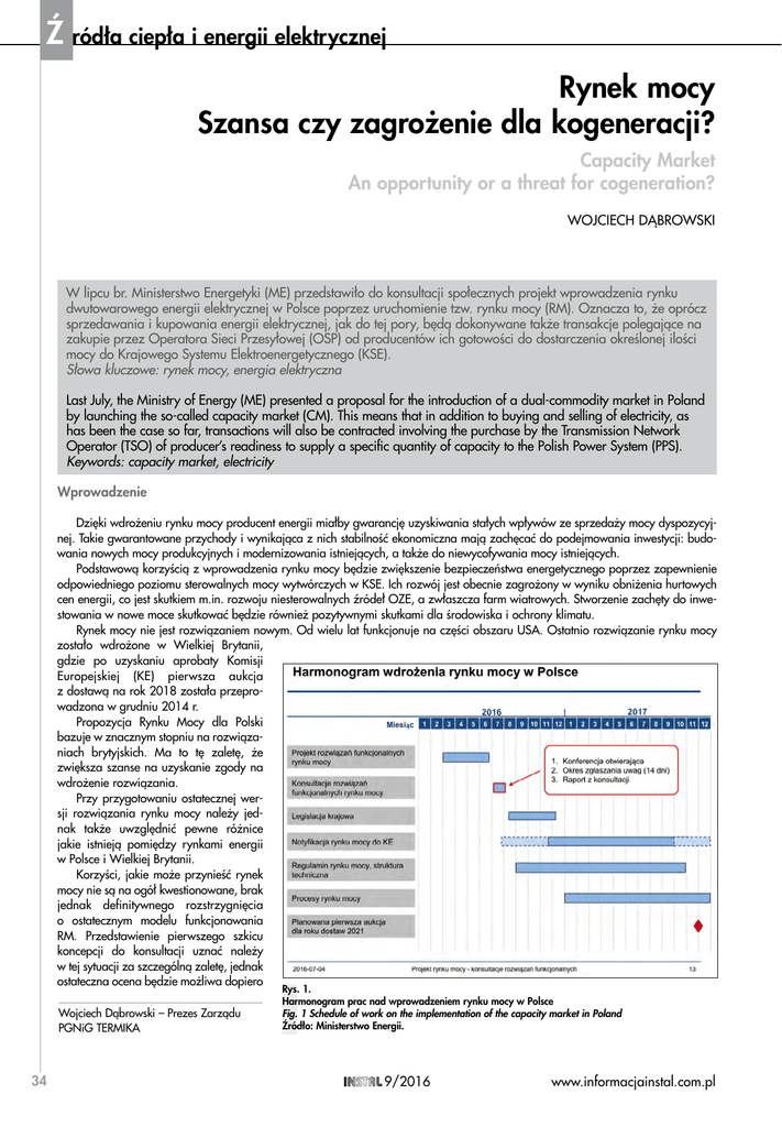 Ź ródła ciepła i energii elektrycznej Rynek mocy Szansa czy zagrożenie dla kogeneracji? Capacity Market An opportunity or a threat for cogeneration? WOJCIECH DĄBROWSKI W lipcu br. Ministerstwo Energetyki (ME) przedstawiło do konsultacji społecznych projekt wprowadzenia rynku dwutowarowego energii elektrycznej w Polsce poprzez uruchomienie tzw. rynku mocy (RM). Oznacza to, że oprócz sprzedawania i kupowania energii elektrycznej, jak do tej pory, będą dokonywane także transakcje polegające na zakupie przez Operatora Sieci Przesyłowej (OSP) od producentów ich gotowości do dostarczenia określonej ilości mocy do Krajowego Systemu Elektroenergetycznego (KSE). Słowa kluczowe: rynek mocy, energia elektryczna Last July, the Ministry of Energy (ME) presented a proposal for the introduction of a dual-commodity market in Poland by launching the so-called capacity market (CM). This means that in addition to buying and selling of electricity, as has been the case so far, transactions will also be contracted involving the purchase by the Transmission Network Operator (TSO) of producer’s readiness to supply a specific quantity of capacity to the Polish Power System (PPS). Keywords: capacity market, electricity Wprowadzenie Dzięki wdrożeniu rynku mocy producent energii miałby gwarancję uzyskiwania stałych wpływów ze sprzedaży mocy dyspozycyjnej. Takie gwarantowane przychody i wynikająca z nich stabilność ekonomiczna mają zachęcać do podejmowania inwestycji: budowania nowych mocy produkcyjnych i modernizowania istniejących, a także do niewycofywania mocy istniejących. Podstawową korzyścią z wprowadzenia rynku mocy będzie zwiększenie bezpieczeństwa energetycznego poprzez zapewnienie odpowiedniego poziomu sterowalnych mocy wytwórczych w KSE. Ich rozwój jest obecnie zagrożony w wyniku obniżenia hurtowych cen energii, co jest skutkiem m.in. rozwoju niesterowalnych źródeł OZE, a zwłaszcza farm wiatrowych. Stworzenie zachęty do inwestowania w nowe moce skutkować będzie również pozytywnymi skutkami dla środowiska i ochrony klimatu. Rynek mocy nie jest rozwiązaniem nowym. Od wielu lat funkcjonuje na części obszaru USA. Ostatnio rozwiązanie rynku mocy zostało wdrożone w Wielkiej Brytanii, gdzie po uzyskaniu aprobaty Komisji Europejskiej (KE) pierwsza aukcja z dostawą na rok 2018 została przeprowadzona w grudniu 2014 r. Propozycja Rynku Mocy dla Polski bazuje w znacznym stopniu na rozwiązaniach brytyjskich. Ma to tę zaletę, że zwiększa szanse na uzyskanie zgody na wdrożenie rozwiązania. Przy przygotowaniu ostatecznej wersji rozwiązania rynku mocy należy jednak także uwzględnić pewne różnice jakie istnieją pomiędzy rynkami energii w Polsce i Wielkiej Brytanii. Korzyści, jakie może przynieść rynek mocy nie są na ogół kwestionowane, brak jednak definitywnego rozstrzygnięcia o ostatecznym modelu funkcjonowania RM. Przedstawienie pierwszego szkicu koncepcji do konsultacji uznać należy w tej sytuacji za szczególną zaletę, jednak ostateczna ocena będzie możliwa dopiero Wojciech Dąbrowski – Prezes Zarządu PGNiG TERMIKA 34 Rys. 1. Harmonogram prac nad wprowadzeniem rynku mocy w Polsce Fig. 1 Schedule of work on the implementation of the capacity market in Poland Źródło: Ministerstwo Energii. 9/2016 www.informacjainstal.com.pl www.informacjainstal.com.pl Źródła ciepła i energii elektrycznej po przedstawieniu szczegółów. Tym bardziej, że możliwych wariantów rozwiązań jest wiele. Propozycja ME zakłada wprowadzenie tzw. „obowiązku mocowego”. określanego w MWe netto/rok, to jest wielkości mocy jaką dana jednostka wytwórcza będzie zobowiązana dostarczyć do KSE w tzw. „okresach zagrożenia”, po cenie wyznaczonej w wyniku akcji (element modelu cenowego). Przewiduje się uruchomienie dwóch typów aukcji: aukcji głównej i aukcji dodatkowej. Kwestią nierozstrzygniętą jest wzajemna koegzystencja, systemu wsparcia dla kogeneracji z mechanizmami rynku mocy. Brak jasnej deklaracji, że wdrożenie rynku mocy zostanie wsparte przez nowy system wsparcia dla kogeneracji po roku 2018. Dla branży byłoby niekorzystne, gdyby nowy system wsparcia kogeneracji nie został wdrożony. Gdyby jednak tak się stało, konieczne byłoby zaprojektowanie rozwiązań rynku mocy, które pozwoliłyby na wykorzystanie jednego z bogactw polskiej energetyki – potencjału rozwoju wysokosprawnej kogeneracji. Rys. 2 Oszczędność paliwa jednostki kogeneracyjnej w porównaniu z produkcją w układzie rozdzielonym Fig. 2 Cogeneration unit fuel savings compared with separate generation Źródło: Zeszyt Naukowo-Techniczny PGNiG TERMIKA nr 1/ 2014 Rys.3. Mechanizmy wsparcia w wybranych krajach Europejskich Fig. 3 Support mechanisms in selected European countries Źródło: Zeszyt Naukowo-Techniczny PGNiG TERMIKA nr 1/ 2014 9/2016 35 Ź Wszystkie kwestie i wątpliwości muszą zostać rozstrzygnięte podczas, przewidywanych na najbliższe miesiące konsultacji. Specyfika kogeneracji Kogeneracja to jednoczesne wytwarzanie energii elektrycznej oraz ciepła z jednego strumienia wytworzonej pary wodnej. Taka technologia daje oczywiste korzyści, gdyż paliwo użyte do wytworzenia energii elektrycznej jest wykorzystywane także do celów ciepłowniczych. Sprawność układów wysokosprawnej kogeneracji wynosi 80%, podczas gdy w nowoczesnych elektrowniach tylko połowę, a w starych dużo mniej. Niestety, wadą kogeneracji w naszym klimacie jest to, że zapotrzebowanie na ciepło nie jest równomierne przez cały rok. O ile zatem w tzw. sezonie grzewczym wykorzystuje się wszystkie zalety produkcji energii elektrycznej i ciepła w skojarzeniu, o tyle w miesiącach letnich, przy spadku zapotrzebowania na ciepło, potencjał produkcyjny kogeneracji spada. Mniejsza produkcja energii elektrycznej to mniejsze przychody z jej sprzedaży i gorsza sytuacja finansowa utrudniająca prowadzenie niezbędnych modernizacji i realizację nowych, niez