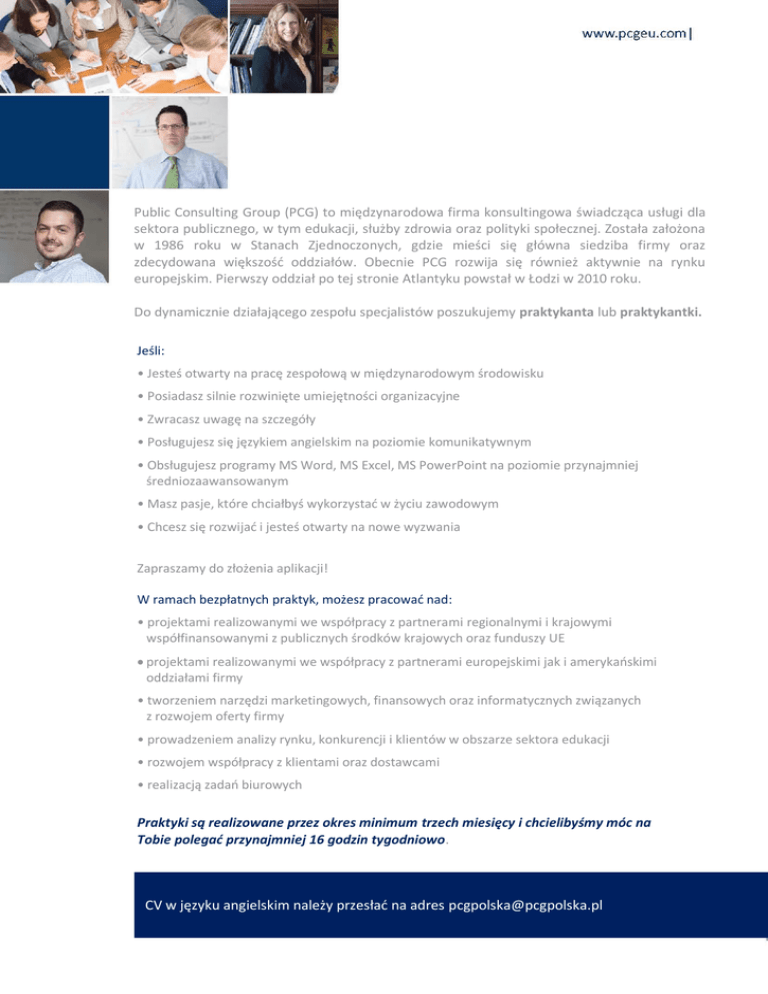 Public Consulting Group (PCG) to międzynarodowa firma konsultingowa świadcząca usługi dla sektora publicznego, w tym edukacji, służby zdrowia oraz polityki społecznej. Została założona w 1986 roku w Stanach Zjednoczonych, gdzie mieści się główna siedziba firmy oraz zdecydowana większość oddziałów. Obecnie PCG rozwija się również aktywnie na rynku europejskim. Pierwszy oddział po tej stronie Atlantyku powstał w Łodzi w 2010 roku. Do dynamicznie działającego zespołu specjalistów poszukujemy praktykanta lub praktykantki. Jeśli: • Jesteś otwarty na pracę zespołową w międzynarodowym środowisku • Posiadasz silnie rozwinięte umiejętności organizacyjne • Zwracasz uwagę na szczegóły • Posługujesz się językiem angielskim na poziomie komunikatywnym • Obsługujesz programy MS Word, MS Excel, MS PowerPoint na poziomie przynajmniej średniozaawansowanym • Masz pasje, które chciałbyś wykorzystać w życiu zawodowym • Chcesz się rozwijać i jesteś otwarty na nowe wyzwania Zapraszamy do złożenia aplikacji! W ramach bezpłatnych praktyk, możesz pracować nad: • projektami realizowanymi we współpracy z partnerami regionalnymi i krajowymi współfinansowanymi z publicznych środków krajowych oraz funduszy UE projektami realizowanymi we współpracy z partnerami europejskimi jak i amerykańskimi oddziałami firmy • tworzeniem narzędzi marketingowych, finansowych oraz informatycznych związanych z rozwojem oferty firmy • prowadzeniem analizy rynku, konkurencji i klientów w obszarze sektora edukacji • rozwojem współpracy z klientami oraz dostawcami • realizacją zadań biurowych Praktyki są realizowane przez okres minimum trzech miesięcy i chcielibyśmy móc na Tobie polegać przynajmniej 16 godzin tygodniowo. CV w języku angielskim należy przesłać na adres [email protected]