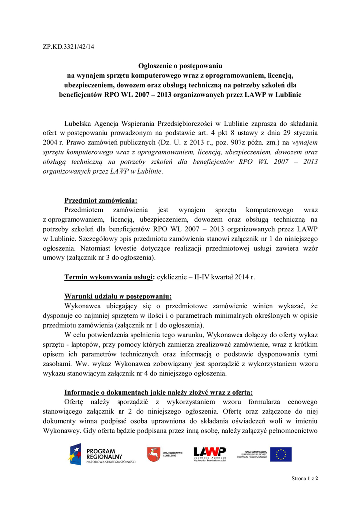ZP.KD.3321/42/14 Ogłoszenie o postępowaniu na wynajem sprzętu komputerowego wraz z oprogramowaniem, licencją, ubezpieczeniem, dowozem oraz obsługą techniczną na potrzeby szkoleń dla beneficjentów RPO WL 2007 – 2013 organizowanych przez LAWP w Lublinie Lubelska Agencja Wspierania Przedsiębiorczości w Lublinie zaprasza do składania ofert w postępowaniu prowadzonym na podstawie art. 4 pkt 8 ustawy z dnia 29 stycznia 2004 r. Prawo zamówień publicznych (Dz. U. z 2013 r., poz. 907z późn. zm.) na wynajem sprzętu komputerowego wraz z oprogramowaniem, licencją, ubezpieczeniem, dowozem oraz obsługą techniczną na potrzeby szkoleń dla beneficjentów RPO WL 2007 – 2013 organizowanych przez LAWP w Lublinie. Przedmiot zamówienia: Przedmiotem zamówienia jest wynajem sprzętu komputerowego wraz z oprogramowaniem, licencją, ubezpieczeniem, dowozem oraz obsługą techniczną na potrzeby szkoleń dla beneficjentów RPO WL 2007 – 2013 organizowanych przez LAWP w Lublinie. Szczegółowy opis przedmiotu zamówienia stanowi załącznik nr 1 do niniejszego ogłoszenia. Natomiast kwestie dotyczące realizacji przedmiotowej usługi zawiera wzór umowy (załącznik nr 3 do ogłoszenia). Termin wykonywania usługi: cyklicznie – II-IV kwartał 2014 r. Warunki udziału w postępowaniu: Wykonawca ubiegający się o przedmiotowe zamówienie winien wykazać, że dysponuje co najmniej sprzętem w ilości i o parametrach minimalnych określonych w opisie przedmiotu zamówienia (załącznik nr 1 do ogłoszenia). W celu potwierdzenia spełnienia tego warunku, Wykonawca dołączy do oferty wykaz sprzętu - laptopów, przy pomocy których zamierza zrealizować zamówienie, wraz z krótkim opisem ich parametrów technicznych oraz informacją o podstawie dysponowania tymi zasobami. Ww. wykaz Wykonawca zobowiązany jest sporządzić z wykorzystaniem wzoru wykazu stanowiącym załącznik nr 4 do niniejszego ogłoszenia. Informacje o dokumentach jakie należy złożyć wraz z ofertą: Ofertę należy sporządzić z wykorzystaniem wzoru formularza cenowego stanowiącego załącznik nr 2 do niniejszego ogłoszenia. Ofertę oraz załączone do niej dokumenty winna podpisać osoba uprawniona do składania oświadczeń woli w imieniu Wykonawcy. Gdy oferta będzie podpisana przez inną osobę, należy załączyć pełnomocnictwo Strona 1 z 2 upoważniające tą osobę do reprezentowania Wykonawcy i składania w jej imieniu oświadczeń woli. Wraz z ofertą należy złożyć wykaz sprzętu komputerowego przy pomocy którego Wykonawca zamierza zrealizować niniejsze zamówienie (sporządzone zgodnie z wzorem wykazu stanowiącego załącznik nr 4 do niniejszego ogłoszenia). Kryteria wyboru oferty: Zamawiający wybierze ofertę najkorzystniejszą spośród ofert Wykonawców, którzy wykażą się spełnianiem warunku udziału w niniejszym postępowaniu. Przy wyborze oferty zostanie zastosowane kryterium 100% cena oferty. Termin oraz sposób złożenia oferty: 1) ofertę należy złożyć do dnia 2 kwietnia 2014 r. do godz. 1530 (oferty złożone po tym terminie nie będą rozpatrywane); 2) ofertę można złożyć według wyboru: a) za pośrednictwem poczty elektronicznej (e-mail: [email protected]), b) pocztą (adres: Lubelska Agencja Wspierania Przedsiębiorczości w Lublinie, ul. Wojciechowska 9a, 20-704 Lublin), c) osobiście w Kancelarii Ogólnej LAWP w Lublinie (adres jw.) 3) w przypadku składania oferty w sposób określony w pkt 2 lit. b lub lit. c, ofertę należy złożyć w kopercie (lub inny sposób uniemożliwiający zdekompletowanie składanych dokumentów), którą należy opisać: (nazwa i adres Wykonawcy) „Oferta w postępowaniu prowadzonym na podstawie art. 4 pkt 8 ustawy z dnia 29 stycznia 2004 r. Prawo zamówień publicznych na „wynajem sprzętu komputerowego wraz z oprogramowaniem, licencją, ubezpieczeniem, dowozem oraz obsługą techniczną na potrzeby szkoleń dla beneficjentów RPO WL 2007 – 2013 organizowanych przez LAWP w Lublinie”. Dostarczyć do 2 kwietnia 2014 r. do godz. 15.30, do Kancelarii Ogólnej LAWP w Lublinie, ul. Wojciechowska 9a, 20-704 Lublin”. Informacja o wyborze oferty: O wyborze najkorzystniejszej oferty, Zamawiający poinformuje Wykonawców, którzy złożyli oferty za pomocą poczty elektronicznej e-mail (na adres wskazany w ofercie). 1) 2) 3) 4) Załączniki: opis przedmiotu zamówienia – załącznik nr 1 do ogłoszenia; wzór formularza cenowego – załącznik nr 2 do ogłoszenia; wzór umowy – załącznik nr 3 do ogłoszenia; wzór wykazu sprzętu – załącznik nr 4 do ogłoszenia. Osoba do kontaktu: Pani Katarzyna Czyż – Brzuszkiewicz (tel. 81 46 23 811). Strona 2 z 2