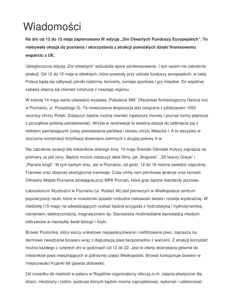 Wiadomości Na dni od 12 do 15 maja zaplanowano III edycję „Dni Otwartych Funduszy Europejskich”. To niebywała okazja do poznania i skorzystania z atrakcji powstałych dzięki finansowemu wsparciu z UE. Ubiegłoroczna edycja „Dni otwartych” wzbudziła spore zainteresowanie. I tym razem nie zabraknie atrakcji. Od 12 do 15 maja w obiektach, które powstały przy udziale funduszy europejskich, w całej Polsce będą się odbywać pikniki rodzinne, koncerty, turnieje sportowe i gry miejskie. Do wspólnej zabawy włączą się również instytucje z naszego regionu. W sobotę 14 maja warto odwiedzić wystawę „Pokolenie 966” (Rezerwat Archeologiczny Genius loci w Poznaniu, ul. Posadzego 3). Ta nowoczesna ekspozycja jest związana z jubileuszem 1050. rocznicy chrztu Polski. Zobaczyć będzie można również najstarsze monety i poznać formy płatnicze z początków polskiej państwowości. Wizyta w rezerwacje to świetna okazja do zetknięcia się z reliktami pamiętającymi czasy powstawania państwa i okresu chrztu Mieszka I. A to wszystko w otoczeniu konstrukcji fortyfikacji drewniano-ziemnych z drugiej połowy X w. Nie zabraknie atrakcji dla miłośników dobrego kina. 14 maja Śremski Ośrodek Kultury zaprasza na premiery za pół ceny. Będzie można zobaczyć takie filmy, jak „Bogowie”, „50 twarzy Greya” i „Planeta singli”. W tym samym dniu, ale w Poznaniu, od godz. 12 do 16 można zwiedzić zajezdnię Franowo oraz obejrzeć ekologicznie tramwaje. Czas umilą nam piknikowe atrakcje oraz koncert Orkiestry Miasta Poznania działającej przy MPK Poznań, która grać będzie standardy jazzowe. Laboratorium Wyobraźni w Poznaniu (ul. Rubież 46) jest pierwszym w Wielkopolsce centrum popularyzacji nauki, które w nowatorski sposób rozbudza ciekawość świata i rozwija wyobraźnię. W niedzielę (15 maja) na odwiedzających czekać będzie przygoda z hydrostatyką i hydrodynamiką, ciśnieniem, elektrycznością, magnetyzmem itp. Stanowiska multimedialne wprowadzą młodych odkrywców w niezwykły świat biologii i fizyki. Browar Poziomka, który warzy unikatowe niepasteryzowane i niefiltrowane piwo, zaprasza na darmowe zwiedzanie browaru wraz z degustacją piwa bezpośrednio z warzelni. Z atrakcji korzystać można każdego z czterech dni w godzinach od 12 do 22. Jest to oferta skierowana głównie do miłośników piwa mieszkających w północnej części Wielkopolski. Browar funkcjonuje bowiem w miejscowości Kujanki 66 (powiat złotowski). Od czwartku do niedzieli w pałacu w Rogalinie organizatorzy oferują m.in. zajęcia plastyczne dla dzieci, młodzieży i rodzin, podczas których będzie można zaprojektować, wykonać i udekorować maskę, wykorzystaną również na balu w pałacu. Wśród propozycji są też warsztaty dawnych tańców, zajęcia malarskie i rysunkowe. Ponadto 14 i 15 maja w Prusimiu poznać będzie można kulturę Olendrów. To świetna okazja, by zwiedzić 60-letni wiatrak, skansen miniatur i odpocząć na łonie natury. Przygotowanych atrakcji w Wielkopolsce będzie znacznie więcej! Szczegółowy program wydarzeń odbywających się w Wielkopolsce można znaleźć na stronie: http://www.dniotwarte.eu.