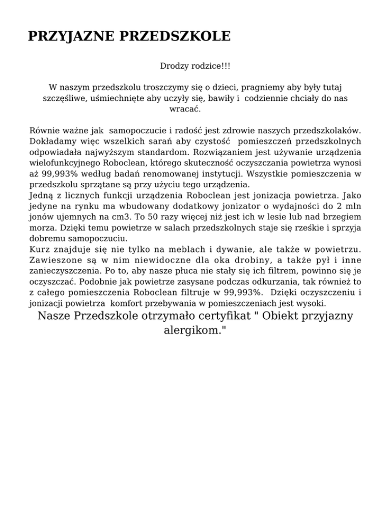 PRZYJAZNE PRZEDSZKOLE Drodzy rodzice!!! W naszym przedszkolu troszczymy się o dzieci, pragniemy aby były tutaj szczęśliwe, uśmiechnięte aby uczyły się, bawiły i codziennie chciały do nas wracać. Równie ważne jak samopoczucie i radość jest zdrowie naszych przedszkolaków. Dokładamy więc wszelkich sarań aby czystość pomieszczeń przedszkolnych odpowiadała najwyższym standardom. Rozwiązaniem jest używanie urządzenia wielofunkcyjnego Roboclean, którego skuteczność oczyszczania powietrza wynosi aż 99,993% według badań renomowanej instytucji. Wszystkie pomieszczenia w przedszkolu sprzątane są przy użyciu tego urządzenia. Jedną z licznych funkcji urządzenia Roboclean jest jonizacja powietrza. Jako jedyne na rynku ma wbudowany dodatkowy jonizator o wydajności do 2 mln jonów ujemnych na cm3. To 50 razy więcej niż jest ich w lesie lub nad brzegiem morza. Dzięki temu powietrze w salach przedszkolnych staje się rześkie i sprzyja dobremu samopoczuciu. Kurz znajduje się nie tylko na meblach i dywanie, ale także w powietrzu. Zawieszone są w nim niewidoczne dla oka drobiny, a także pył i inne zanieczyszczenia. Po to, aby nasze płuca nie stały się ich filtrem, powinno się je oczyszczać. Podobnie jak powietrze zasysane podczas odkurzania, tak również to z całego pomieszczenia Roboclean filtruje w 99,993%. Dzięki oczyszczeniu i jonizacji powietrza komfort przebywania w pomieszczeniach jest wysoki. Nasze Przedszkole otrzymało certyfikat " Obiekt przyjazny alergikom."