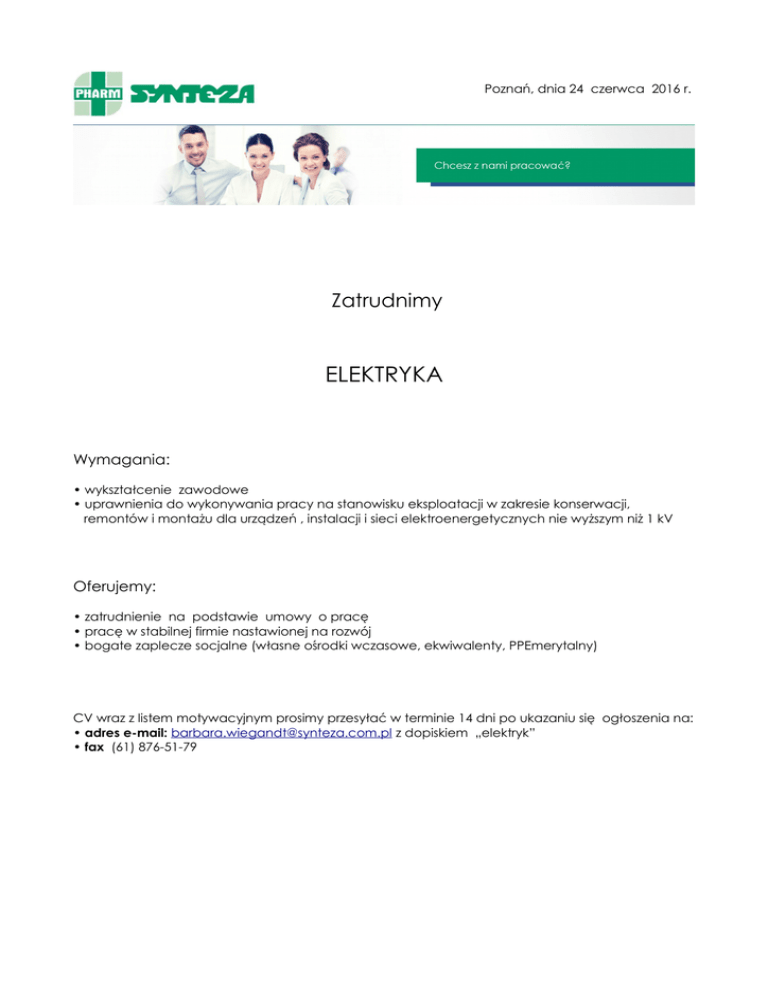 Poznań, dnia 24 czerwca 2016 r. Zatrudnimy ELEKTRYKA Wymagania: • wykształcenie zawodowe • uprawnienia do wykonywania pracy na stanowisku eksploatacji w zakresie konserwacji, remontów i montażu dla urządzeń , instalacji i sieci elektroenergetycznych nie wyższym niż 1 kV Oferujemy: • zatrudnienie na podstawie umowy o pracę • pracę w stabilnej firmie nastawionej na rozwój • bogate zaplecze socjalne (własne ośrodki wczasowe, ekwiwalenty, PPEmerytalny) CV wraz z listem motywacyjnym prosimy przesyłać w terminie 14 dni po ukazaniu się ogłoszenia na: • adres e-mail: [email protected] z dopiskiem „elektryk” • fax (61) 876-51-79