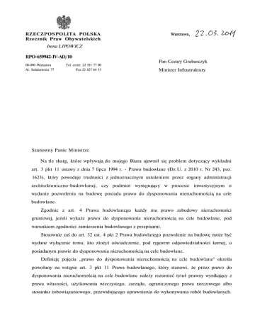 RZECZPOSPOLITA POLSKA Rzecznik Praw Obywatelskich Irena LIPOWICZ RPO-659942-IV-AD/10 00-090 Warszawa Al. Solidarności 77 Tel. centr. 22 551 77 00 Fax 22 827 64 53 Pan Cezary Grabarczyk Minister Infrastruktury Szanowny Panie Ministrze Na tle skarg, które wpływają do mojego Biura ujawnił się problem dotyczący wykładni art. 3 pkt 11 ustawy z dnia 7 lipca 1994 r. - Prawo budowlane (Dz.U. z 2010 r. Nr 243, poz. 1623), który powoduje trudności z jednoznacznym ustaleniem przez organy administracji architektoniczno-budowłanej, czy podmiot występujący w procesie inwestycyjnym o wydanie pozwolenia na budowę posiada prawo do dysponowania nieruchomością na cele budowlane. Zgodnie z art. 4 Prawa budowlanego każdy ma prawo zabudowy nieruchomości gruntowej, jeżeli wykaże prawo do dysponowania nieruchomością na cele budowlane, pod warunkiem zgodności zamierzenia budowlanego z przepisami. Stosownie zaś do art. 32 ust. 4 pkt 2 Prawa budowlanego pozwolenie na budowę może być wydane wyłącznie temu, kto złożył oświadczenie, pod rygorem odpowiedzialności karnej, o posiadanym prawie do dysponowania nieruchomością na cele budowlane. Definicję pojęcia „prawo do dysponowania nieruchomością na cele budowlane" określa powołany na wstępie art. 3 pkt 11 Prawa budowlanego, który stanowi, że przez prawo do dysponowania nieruchomością na cele budowlane należy rozumieć tytuł prawny wynikający z prawa własności, użytkowania wieczystego, zarządu, ograniczonego prawa rzeczowego albo stosunku zobowiązaniowego, przewidującego uprawnienia do wykonywania robót budowlanych. 2 Przepis ten, wśród tytułów uprawniających do dysponowania nieruchomością na cele budowlane, wymienia zarówno prawa rzeczowe: własność, ograniczone prawa rzeczowe jak też każdy stosunek zobowiązaniowy, który przewiduje uprawnienia do wykonywania robót budowlanych. Na wstępie zwrócić należy uwagę, że już sama gramatyczna wykładnia tego przepisu nasuwa wątpliwości, które mogą przekładać się na wadliwe odczytywanie przez organy administracji architektoniczno-budowlanej definicji zawartej w tym przepisie, a tym samym wpływać na wadliwość decyzji administracyjnych orzekających o pozwoleniu na budowę. W art. 3 pkt 11 Prawa budowlanego ustawodawca kolejno wymienia tytuły prawne uprawniające do dysponowania nieruchomością na cele budowlane tj. własność, użytkowanie wieczyste, zarząd, ograniczone prawo rzeczowe oddzielając je przecinkami, a dalszej części tego zdania po zastosowaniu spójnika „albo" wymienia kolejny tytuł prawny posługując się sformułowaniem: "stosunek zobowiązaniowy, przewidujący uprawnienie do wykonywania robót budowlanych". O ile regulacja zawarta w tym przepisie, w zakresie, w jakim przewiduje, że zarówno własność jak też użytkowanie wieczyste uprawniają do dysponowania nieruchomością na cele budowlane jest odzwierciedleniem treści tych praw, jaką nadano im na gruncie prawa cywilnego, to istotne wątpliwości wzbudza wymienienie zarządu i ograniczonego prawa rzeczowego obok dwóch najsilniejszych i najpełniejszych praw rzeczowych, które z samej swej istoty uprawniają do zabudowy nieruchomości. Aktualna redakcja art. 3 pkt 11 Prawa budowlanego i wykładnia gramatyczna tego przepisu, który zawiera w swej treści spójnik „albo" (alternatywna rozłączna) wskazują że w pierwszej części tego przepisu wymieniono tytuły prawne, które bezwzględnie uprawniają do zabudowy nieruchomości, a w drugiej części zdania, następującej po spójniku „albo" wskazano, że prawo do dysponowania nieruchomością na cele budowlane może wynikać również z umowy, będącej źródłem stosunku zobowiązaniowego, jeżeli w treści umowy uprawnienie do zabudowy nieruchomości zostało przewidziane. Treść art. 3 pkt 11 Prawa budowlanego wzbudza także istotne zastrzeżenia w kontekście zmian legislacyjnych, jakie nastąpiły z chwilą wejścia w życie ustawy z dnia 21 sierpnia 1997 r. o gospodarce nieruchomościami (Dz.U. z 2010 r. Nr 102, poz. 651 ze zm.) w zakresie uprawnień jednostek organizacyjnych gminy i Skarbu Państwa do dysponowania nieruchomością na cele budowlane. Jak już wyżej wskazałam art. 3 pkt 11 Prawa budowlanego wśród tytułów uprawniających do dysponowania nieruchomością na cele budowlane wymienia również zarząd. 3 Literalna wykładnia art. 3 pkt 11 Prawa budowlanego może prowadzić do wniosku, że każdy zarząd uprawnia do dysponowania nieruchomością na cele budowlane, jednak takiej wykładni nie można zaakceptować w świetle konstytucyjnej zasady ochrony prawa własności. Celem budowlanym są zwykle takie działania, które wykraczają poza zakres bieżącego utrzymania nieruchomości, a tym samym stanowią czynności przekraczające zakres zwykłego zarządu. Działania te wymagają- co do zasady - pozwolenia na budowę, które uzyskiwane jest po uprzednim złożeniu przez inwestora oświadczenia o dysponowaniu nieruchomością na cele budowlane. Przyjęcie założenia, że zarząd wymieniony w art. 3 pkt 11 Prawa budowlanego obejmuje każdy zarząd, prowadziłoby do sytuacji, w której pozwolenie na budowę, uzyskiwałby każdy zarządca, niezależnie od zakresu uprawnień, jakie mu powierzono w ramach zarządu, a więc także zarządca, którego upoważniono jedynie do podejmowania czynności zwykłego zarządu. Nie ulega zaś wątpliwości, że realizacja celu budowlanego stanowi ingerencję w substancję rzeczy, a więc czynność przekraczającą zakres zwykłego zarządu, do podjęcia której zarządca musi uzyskać od właściciela rzeczy wyraźne umocowanie. Wykładania historyczna art. 3 pkt 11 Prawa budowlanego wskazuje, że celem ustawodawcy nie było przyznanie każdemu zarządcy uprawnień do dysponowania nieruchomością na cele budowlane, a przez to nadanie art. 3 pkt 11 Prawa budowlanego treści niezgodnej z konstytucyjną ochroną prawa własności, tylko uwz