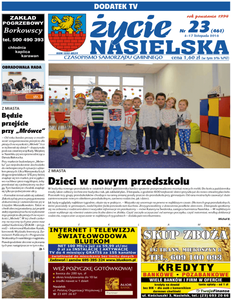 DODATEK TV OBRADOWAŁA RADA str. 3 Z MIASTA Będzie przejście przy „Mrówce” – Od roku bardzo proszę o możliwość zorganizowania przejścia dla pieszych na wysokości „Mrówki”. I co w tej kwestii się dzieje? – dopytywała podczas ostatniej sesji Rady Miejskiej w Nasielsku jej wiceprzewodnicząca Danuta Białorucka. Przy markecie budowlanym „Mrówka” już niejednokrotnie dochodziło do niebezpiecznych sytuacji z udziałem pieszych. Ulica Warszawska (czyli droga wojewódzka nr 571), przy której znajduje się ten market, jest wyjątkowo ruchliwa i piesi mają kłopot, żeby przedostać się z jednej strony na drugą. Tym bardziej że chodnik znajduje się tylko po jednej stronie ulicy. – Formalnie temat udało się załatwić. Zakończył się proces przygotowania dokumentacji i zatwierdzenia jej w Urzędzie Marszałkowskim. Także w chwili obecnej posiadamy już projekt stałej organizacji ruchu na wykonanie tego przejścia dla pieszych na wysokości „Mrówki”. W tej chwili czekamy na wycenę tych prac przez nasz zakład budżetowy (ZGKiM – przyp. red.) – informował Radosław Kasiak, kierownik Wydziału Inwestycji, Zamówień Publicznych i Programów Strukturalnych nasielskiego magistratu. Prawdopodobnie zlecenie wykonania tych prac nastąpi jeszcze w tym roku. jg, i. Z MIASTA Dzieci w nowym przedszkolu W budynku nowego przedszkola w ostatnich dniach października bardzo sprawnie przeprowadzono montaż nowych mebli. Do końca października trwały także odbiory techniczne budynku i tak, jak zakładał plan, 2 listopada, o godzinie 8:00 większość dzieci przyszła już do nowo otwartej placówki. Pozostałe trzy grupy przedszkolaków chodzące na ranną zmianę poszły jeszcze do przedszkola przy gimnazjum. Od rana można było zauważyć duże zainteresowanie nowym obiektem przedszkolnym, zarówno rodziców, jak i dzieci. Jak będą wyglądały najbliższe tygodnie, okaże się w praktyce. – Wszystko się unormuje na pewno w najbliższym czasie. Dla trzech grup przedszkolnych, które pozostały w gimnazjum, nadal będzie funkcjonowała tam kuchnia. Zrezygnowaliśmy z dowożenia posiłków dzieciom. 3 listopada spotkamy się na zebraniu z rodzicami dzieci i wszystkie informacje im przekażemy – mówi Katarzyna Świderska, zastępca burmistrza Nasielska. – W najbliższym czasie wyklaruje się również ostateczna liczba dzieci w żłobku. Część zaczęła uczęszczać od samego początku, część natomiast, według deklaracji rodziców, rozpocznie uczęszczanie w najbliższych tygodniach – dodała pani wiceburmistrz. Michał B. R E K L A M A 2 Z SAMORZĄDU Życie Nasielska nr 23 (461); 4–17.11.2016 Z MIASTA Rów bez odpływu Komisariat Policji, tel. 23 691–23–77, 23 691–22–07 Straż Pożarna Nasielsk 998 Pogotowie Ratunkowe tel. 999 Pogotowie energetyczne 991 lub 24 365 10 10 Pogotowie Gazowe 992 lub 0 608 069 128 Pogotowie Ciepłownicze tel. 23 691–23–46 TAXI. Postój tel. 23 691-27-17 Zarząd Gospodarki Komunalnej i Mieszkaniowej tel. 23 691–23–64 SPZOZ NASIELSK, ul. Sportowa 2 tel. 23 691–25–03 Ośrodek Zdrowia w Starych Pieścirogach, ul. Sikorskiego 1 tel. 23 691–22–20 Ośrodek Zdrowia w Cieksynie, ul. Sportowa 5 tel. 23 693–50–05 NZOZ „Centrum Medyczne” ul. Warszawska 47, tel. 23 691–25–14 NZOZ TERA–MED Stare Pieścirogi, ul. Srebrna 1 tel./fax 23 693 14 26 NZOZ „MEDICA” ul. Kościuszki 40 A, tel./fax 23 693–20–02 SOCPR „CARITAS” ul. Żwirki i Wigury 5, tel. 23 693–14–28 Poradnia Terapii Uzależnień, ul. Warszawska 50 tel. 23 693–02–50 Urząd Miejski w Nasielsku, ul. Elektronowa 3 tel. 23 693–30–00 Urząd Pocztowy w Nasielsku, ul. Warszawska 26 tel./fax 23 691–26–43 Miejski Ośrodek Pomocy Społecznej, ul. Elektronowa 3 tel. 23 693–30–06 Mazowiecki Ośrodek Doradztwa Rolniczego tel. 23 693–30–67 Nasielski Ośrodek Kultury, ul. Kościuszki 12 tel./fax 23 691–23–43 Miejsko–Gminna Biblioteka Publiczna, ul. Piłsudskiego 6 tel. 23 691–25–52 Hala Sportowa, ul. Staszica 1, tel. 23 693–30–865 Stadion Miejski, ul. Sportowa, tel. 23 693–13–32 Parafia Rzymskokatolicka w Nasielsku, tel. 23 691–26–53 Parafia Rzymskokatolicka, w Starych Pieścirogach tel. 23 693–10–25 Parafia Rzymskokatolicka w Cieksynie, tel. 23 693–50–08 Parafia Rzymskokatolicka w Nunie, tel. 601 479 302 Polski Związek Wędkarski koło nr 13 w Nasielsku tel. 504 357 415 lub 517 819 756 fot. M. Stamirowski Z GMINY Uciążliwy remont drogi Mieszkańcy Cieksyna od kilkunastu narzekają na przedłużający się remont drogi powiatowej przebiegającej przez ich miejscowość. Sygnalizują to często zarówno naszej redakcji, jak i radnym z tego terenu. Firma wykonująca roboty drogowe zerwała asfalt, a częste opady deszczu sprawiły, że ogromne dziury wypełniły się wodą i błotem, utrudniając przejazd. Również na wykonanym przed kilkoma tygodniami chodniku nadal zalegają zwały piachu. Prace, które rozpoczęły się jeszcze we wrześniu, według dokumentów przetargowych mogą potrwać do końca listopada. Może jednak warto zadbać o to, by ta bardzo potrzebna inwestycja była mniej uciążliwa dla mieszkańców. Michał B. MOPS ZAPRASZA Bezpłatne szkolenie Miejski Ośrodek Pomocy Społecznej w Nasielsku serdecznie zaprasza osoby niepełnosprawne oraz ich opiekunów na bezpłatne szkolenie, które odbędzie się we wtorek, 29 listopada 2016 r. w godz. 9.00–12.00 w Sali Konferencyjnej Urzędu Miasta w Nasielsku. Podczas szkolenia będą poruszane tematy dotyczące : • praw osób niepełnosprawnych, • ulg dla osób niepełnosprawnych, • środków z PFRON, • świadczeń rentowo-emerytalnych, • świadczeń socjalnych, • zabezpieczenie osób niepełnosprawnych na przyszłość. Po zakończonym szkoleniu uczestnicy będą mogli skorzystać z indywidualnych bezpłatnych porad prawnych. Prowadzący szkolenie – prawnik Grzegorz Jaroszczyk. Osoby chcące wziąć
