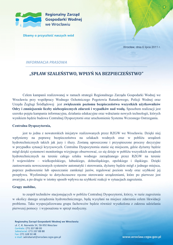 Wrocław, dnia 6 lipca 2011 r. INFORMACJA PRASOWA „SPŁAW SZALEŃSTWO, WPŁYŃ NA BEZPIECZEŃSTWO” Celem kampanii realizowanej w ramach strategii Regionalnego Zarządu Gospodarki Wodnej we Wrocławiu przy współpracy Wodnego Ochotniczego Pogotowia Ratunkowego, Policji Wodnej oraz Urzędu Żeglugi Śródlądowej jest zwiększenie poziomu bezpieczeństwa wszystkich użytkowników Odry i zmniejszenie liczby niebezpiecznych zdarzeń i wypadków nad wodą. Sposobem realizacji jest szeroko pojęta kampania informacyjna, działania edukacyjne oraz wdrażanie nowych technologii, których wynikiem będzie budowa Centralnej Dyspozytorni oraz uruchomienie Systemu Wczesnego Ostrzegania. Centralna Dyspozytornia, jest to jedna z nowatorskich inicjatyw realizowanych przez RZGW we Wrocławiu. Dzięki niej wpłyniemy na poprawę bezpieczeństwa na szlakach wodnych oraz w pobliżu urządzeń hydrotechnicznych takich jak jazy i śluzy. Zostaną uproszczone i przyspieszone procesy decyzyjne w przypadku sytuacji kryzysowych. Centralna Dyspozytornia stanie się miejscem, gdzie dyżurny będzie mógł dzięki systemowi monitoringu wizyjnego obserwować, co się dzieje w pobliżu wszystkich urządzeń hydrotechnicznych na terenie całego szlaku wodnego zarządzanego przez RZGW na terenie 5 województw – wielkopolskiego, lubuskiego, dolnośląskiego, opolskiego i śląskiego. Dzięki zastosowaniu nowoczesnych systemów automatyki i sterowania, dyżurny będzie mógł z jednego miejsca, poprzez podnoszenie lub opuszczanie zamknięć jazów, regulować poziom wody oraz szybkość jej przepływu. Wyeliminuje to dotychczasowe ręczne sterowanie urządzeniami, które po pierwsze jest awaryjne, a po drugie w istotny sposób wpływa na szybkość reakcji w sytuacjach zagrożenia. Grupy mobilne, to zespół techników stacjonujących w pobliżu Centralnej Dyspozytorni, którzy, w razie zagrożenia w okolicy danego urządzenia hydrotechnicznego, będą wysyłani na miejsce zdarzenia celem likwidacji problemu. Taka wyspecjalizowana grupa fachowców będzie również wyszkolona z zakresu udzielania pierwszej pomocy i wyposażona w sprzęt medyczny. Komunikaty i ostrzeżenia Z Centralnej Dyspozytorni będą wysyłane do właścicieli jednostek pływających po Odrze komunikaty i ostrzeżenia dotyczące utrudnień, awarii i sytuacji pogodowej występujących na całej długości rzeki zarządzanej przez RZGW. System Wczesnego Ostrzegania (SWO) System opiera się w głównej mierze na uruchomieniu łączności miedzy Centralną Dyspozytornią, Policją Wodną, Urzędem Żeglugi Śródlądowej i Wodnym Ochotniczym Pogotowiem Ratunkowym. Dzięki SWO będzie możliwa wymiana komunikatów, informacji o zagrożeniach i utrudnieniach. Dyżurni będą się również informować o potencjalnych sytuacjach niebezpiecznych generowanych przez użytkowników Odry, zgłaszać wypadki. W przyszłości SWO zostanie zintegrowane z podmiotami zapewniającymi bezpieczeństwo na rzece, a dzięki temu dyżurni wszystkich służb będą mogli wspólnie korzystać z systemu dobrodziejstw monitoringu. Rozwiązania rodem ze Szwecji W pierwszej kolejności zostanie wprowadzone proste rozwiązanie przywiezione ze Szwecji. W odpowiedniej odległości od danego urządzenia wodnego rozciągnięta zostanie linia z bojami wyznaczająca granice bezpieczeństwa. Przekroczenie tej granicy oznacza wejście w strefę bezpośredniego zagrożenia. Wizja przyszłości W RZGW we Wrocławiu powstają też plany i pomysły wprowadzenia bardziej zaawansowanych systemów bezpieczeństwa. Rozwiązania te będą mogły być wdrażane sukcesywnie. Dzięki stałemu monitoringowi okolic urządzeń hydrotechnicznych dyżurny będzie mógł natychmiast zareagować w przypadku niebezpiecznego zachowania się użytkowników Odry. Widząc zbliżającą się do jazu łódź czy kajak wdroży procedurę alarmową. Procedura będzie polegać na włączeniu, w miejscu gdzie następuje zagrożenie, syreny alarmowej, komunikatu dźwiękowego ostrzegającego danego użytkownika przed niebezpieczeństwem zbliżania się do urządzenia hydrotechnicznego lub włączeniu sygnalizacji świetlnej. O niebezpiecznej sytuacji będzie również informowana natychmiast Policja wodna i WOPR, które w razie potrzeby są w stanie szybko dotrzeć na miejsce zdarzenia. Dyżurny w Centralnej Dyspozytorni będzie miał również możliwość obserwowania na monitorach ruchu wszystkich jednostek pływających wyposażonych w GPS. Kolejnym nowatorskim pomysłem RZGW we Wrocławiu są tzw. „bariery elektroniczne”. Jest to system, który będzie w jeszcze większym stopniu niwelował sytuacje niebezpieczne. Na początek w pobliżu Jazu Opatowickiego, który może być niejako prototypem nowoczesnych rozwiązań, zostałyby zamontowane czujniki zbliżeniowe. Przepłyniecie łodzi czy kajaka przez wiązkę lasera, przecinającą w poprzek rzekę, spowodowałoby automatyczne uruchomienie Systemu Wczesnego Ostrzegania w postaci sygnałów dźwiękowych i świetlnych. Nowy znak na szlaku wodnym Wynikiem współpracy miedzy RZGW we Wrocławiu, UŻŚ, WOPR i Policji Wodnej jest opracowanie nowego znaku ostrzegawczego, który będzie montowany w pobliżu niebezpiecznych miejsc. Na znaku widnieje przewrócona żaglówka oraz napis NIEBEZPIECZNE MIEJSCE, ZAKAZ PŁYWANIA. W obrębie Wrocławskiego Węzła Wodnego taki znak został zawieszony najpierw przy Jazie Opatowickim. Następne pojawią się w innych miejscach, gdzie istnieje duże prawdopodobieństwo wypadku, np. przy Jazie Bartoszowickim i Jazie Rędzińskim. Jeszcze szybciej na miejsce wypadku Wrocławski WOPR został niedawno doposażony w nowoczesną jednostkę do działań ratowniczo poszukiwawczych. Dzięki nowemu sprzętowi ratownicy będą mogli szybciej dotrzeć na miejsce zdarzenia oraz efektywniej prowadzić poszukiwania zaginionych. Szybka łódź dzięki wyposażeniu elektronicznemu może pływać niemal w każdych warunkach pogodowych, 