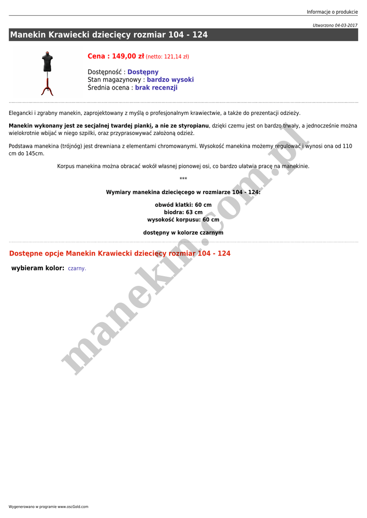 Informacje o produkcie Utworzono 04-03-2017 Manekin Krawiecki dziecięcy rozmiar 104 - 124 Cena : 149,00 zł (netto: 121,14 zł) Dostępność : Dostępny Stan magazynowy : bardzo wysoki Średnia ocena : brak recenzji Elegancki i zgrabny manekin, zaprojektowany z myślą o profesjonalnym krawiectwie, a także do prezentacji odzieży. .p l Manekin wykonany jest ze secjalnej twardej pianki, a nie ze styropianu, dzięki czemu jest on bardzo trwały, a jednocześnie można wielokrotnie wbijać w niego szpilki, oraz przyprasowywać założoną odzież. Podstawa manekina (trójnóg) jest drewniana z elementami chromowanymi. Wysokość manekina możemy regulować i wynosi ona od 110 cm do 145cm. Korpus manekina można obracać wokół własnej pionowej osi, co bardzo ułatwia pracę na manekinie. n. co m *** Wymiary manekina dziecięcego w rozmiarze 104 - 124: obwód klatki: 60 cm biodra: 63 cm wysokość korpusu: 60 cm dostępny w kolorze czarnym m an wybieram kolor: czarny. ek i Dostępne opcje Manekin Krawiecki dziecięcy rozmiar 104 - 124 Wygenerowano w programie www.oscGold.com