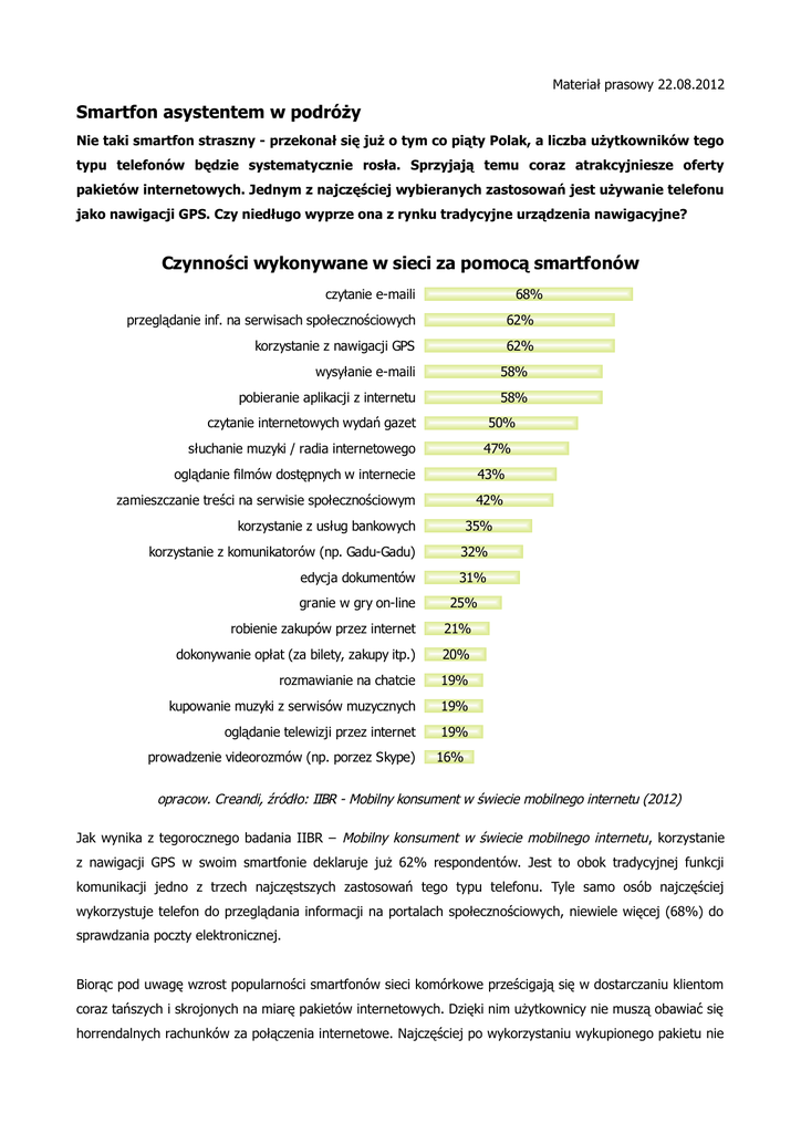 Materiał prasowy 22.08.2012 Smartfon asystentem w podróży Nie taki smartfon straszny - przekonał się już o tym co piąty Polak, a liczba użytkowników tego typu telefonów będzie systematycznie rosła. Sprzyjają temu coraz atrakcyjniesze oferty pakietów internetowych. Jednym z najczęściej wybieranych zastosowań jest używanie telefonu jako nawigacji GPS. Czy niedługo wyprze ona z rynku tradycyjne urządzenia nawigacyjne? Czynności wykonywane w sieci za pomocą smartfonów czytanie e-maili 68% przeglądanie inf. na serwisach społecznościowych 62% korzystanie z nawigacji GPS 62% wysyłanie e-maili 58% pobieranie aplikacji z internetu 58% czytanie internetowych wydań gazet 50% słuchanie muzyki / radia internetowego 47% oglądanie filmów dostępnych w internecie 43% zamieszczanie treści na serwisie społecznościowym 42% korzystanie z usług bankowych 35% korzystanie z komunikatorów (np. Gadu-Gadu) 32% edycja dokumentów 31% granie w gry on-line 25% robienie zakupów przez internet 21% dokonywanie opłat (za bilety, zakupy itp.) 20% rozmawianie na chatcie 19% kupowanie muzyki z serwisów muzycznych 19% oglądanie telewizji przez internet 19% prowadzenie videorozmów (np. porzez Skype) 16% opracow. Creandi, źródło: IIBR - Mobilny konsument w świecie mobilnego internetu (2012) Jak wynika z tegorocznego badania IIBR – Mobilny konsument w świecie mobilnego internetu , korzystanie z nawigacji GPS w swoim smartfonie deklaruje już 62% respondentów. Jest to obok tradycyjnej funkcji komunikacji jedno z trzech najczęstszych zastosowań tego typu telefonu. Tyle samo osób najczęściej wykorzystuje telefon do przeglądania informacji na portalach społecznościowych, niewiele więcej (68%) do sprawdzania poczty elektronicznej. Biorąc pod uwagę wzrost popularności smartfonów sieci komórkowe prześcigają się w dostarczaniu klientom coraz tańszych i skrojonych na miarę pakietów internetowych. Dzięki nim użytkownicy nie muszą obawiać się horrendalnych rachunków za połączenia internetowe. Najczęściej po wykorzystaniu wykupionego pakietu nie płacą już nic więcej, a jedynie spada prędkość transferu danych. Dzięki temu użytkownicy smartfonów mogą do woli korzystać z przeróżnych gier i aplikacji dostępnych w tzw. marketach. Wiele z nich ma praktyczne zastosowanie jak np. wyszukiwarka bankomatów, rozkład jazdy pociągów czy wspomniane wcześniej nawigacje GPS. Korzystanie z nawigacji w telefonie jest bardzo wygodne, bo nie wymaga kupowania osobnego urządzenia – mając smartfona mamy 2w1. A warto zauważyć, że nawigacyjne urządzenia dedykowane są nierzadko drogie, a do tego wymagają wykupienia licencji. Aplikacje na smartfony oferujące nawigację też nie zawsze są bezpłatne, ale ich ceny są bez porównania niższe niż osobnych urządzeń, które można zakupić nawet za parę tysięcy złotych. Abonament za korzystanie z aplikacji kształtuje się w granicach kilku do kilkudziesięciu złotych. Z opcji darmowych coraz popularniejsze są Google Maps oraz Yanosik. Pierwsza z wymienionych aplikacji może pochawlić się trójwymiarowymi budynkami na mapie oraz możliwością wyszukiwania takich miejsc jak np. kina czy restauracje. Yanosik z kolei, poza wyznaczaniem trasy, oferuje też inne możliwości jak pokazywanie trafficu – czyli prędkości z jaką jeżdżą aktualnie kierowcy na danym obszarze, co pozwala na ominięcie korków. Opcja zbawienna szczególnie w miastach, w których panują roboty drogowe. Aplikacja ta pełni też inną ciekawą rolę - legalnego antyradaru. Ostrzega użytkownika przed kontrolą drogówki czy fotoradarem, co w obliczu rozwijania sieci fotoradarów o kolejne 300 sztuk może okazać się pomocne. Jak widać smartfon może z powodzeniem służyć nam kompleksową pomocą w podróży. Nawigacyjne aplikacje na smartfony w niczym nie są gorsze od tych tradycyjnych urządzeń i pomału zaczynają wpływać na spadek ich sprzedaży. Jak wynika z danych zgromadzonych przez portal Ceneo.pl w zeszłym roku nawigacje samochodowe nadal znajdowały się w pierwszej dziesiątce najczęściej wybieranych produktów, jednak w porównaniu z rokiem 2010 ich sprzedaż spadła i można pokusić się o przypuszczenie, że tendencja ta się utrzyma. GfK Polonia przewiduje, iż rynek nawigacji GPS skurczy się w tym roku o ok. 12-14%. Źródło: Creandi.pl