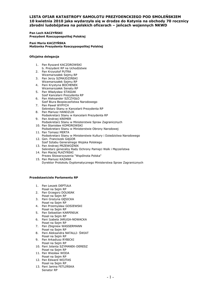 LISTA OFIAR KATASTROFY SAMOLOTU PREZYDENCKIEGO POD SMOLEŃSKIEM 10 kwietnia 2010 jaka wydarzyła się w drodze do Katynia na obchody 70 rocznicy zbrodni ludobójstwa na polskich oficerach – jeńcach wojennych NKWD Pan Lech KACZYŃSKI Prezydent Rzeczypospolitej Polskiej Pani Maria KACZYŃSKA MałŜonka Prezydenta Rzeczypospolitej Polskiej Oficjalna delegacja 1. 2. 3. 4. 5. 6. 7. 8. 9. 10. 11. 12. 13. 14. 15. Pan Ryszard KACZOROWSKI b. Prezydent RP na Uchodźstwie Pan Krzysztof PUTRA Wicemarszałek Sejmu RP Pan Jerzy SZMAJDZIŃSKI Wicemarszałek Sejmu RP Pani Krystyna BOCHENEK Wicemarszałek Senatu RP Pan Władysław STASIAK Szef Kancelarii Prezydenta RP Pan Aleksander SZCZYGŁO Szef Biura Bezpieczeństwa Narodowego Pan Paweł WYPYCH Sekretarz Stanu w Kancelarii Prezydenta RP Pan Mariusz HANDZLIK Podsekretarz Stanu w Kancelarii Prezydenta RP Pan Andrzej KREMER Podsekretarz Stanu w Ministerstwie Spraw Zagranicznych Pan Stanisław KOMOROWSKI Podsekretarz Stanu w Ministerstwie Obrony Narodowej Pan Tomasz MERTA Podsekretarz Stanu w Ministerstwie Kultury i Dziedzictwa Narodowego Gen. Franciszek GĄGOR Szef Sztabu Generalnego Wojska Polskiego Pan Andrzej PRZEWOŹNIK Sekretarz generalny Rady Ochrony Pamięci Walk i Męczeństwa Pan Maciej PŁAśYŃSKI Prezes Stowarzyszenia "Wspólnota Polska" Pan Mariusz KAZANA Dyrektor Protokołu Dyplomatycznego Ministerstwa Spraw Zagranicznych Przedstawiciele Parlamentu RP 1. 2. 3. 4. 5. 6. 7. 8. 9. 10. 11. 12. 13. Pan Leszek DEPTUŁA Poseł na Sejm RP Pan Grzegorz DOLNIAK Poseł na Sejm RP Pani GraŜyna GĘSICKA Poseł na Sejm RP Pan Przemysław GOSIEWSKI Poseł na Sejm RP Pan Sebastian KARPINIUK Poseł na Sejm RP Pani Izabela JARUGA-NOWACKA Poseł na Sejm RP Pan Zbigniew WASSERMANN Poseł na Sejm RP Pani Aleksandra NATALLI- ŚWIAT Poseł na Sejm RP Pan Arkadiusz RYBICKI Poseł na Sejm RP Pani Jolanta SZYMANEK-DERESZ Poseł na Sejm RP Pan Wiesław WODA Poseł na Sejm RP Pan Edward WOJTAS Poseł na Sejm RP Pani Janina FETLIŃSKA Senator RP -1- 14. Pan Stanisław ZAJĄC Senator RP Osoby towarzyszące 1. Pan Janusz KOCHANOWSKI Rzecznik Praw Obywatelskich 2. Pan Sławomir SKRZYPEK Prezes Narodowego Banku Polskiego 3. Pan Janusz KURTYKA Prezes Instytutu Pamięci Narodowej 4. Pan Janusz KRUPSKI Kierownik Urzędu do Spraw Kombatantów i Osób Represjonowanych 5. Ks. Prof. Ryszard RUMIANEK Rektor Uniwersytetu Kardynała Stefana Wyszyńskiego 6. Pan Wojciech LUBIŃSKI Lekarz prezydenta 7. Pani Barbara MAMIŃSKA Dyrektor Biura Kadr i Odznaczeń w Kancelarii Prezydenta RP 8. Pani Janina NATUSIEWICZ-MIRER 9. Pani Izabela TOMASZEWSKA Dyrektor Zespołu Protokolarnego Kancelarii Prezydenta RP 10. Pani Katarzyna DORACZYŃSKA 11. Pan Dariusz JANKOWSKI 12. Pan Aleksander FEDOROWICZ Przedstawiciele Kościołów i wyznań religijnych 1. 2. 3. 4. 5. Ks. Bp gen. dyw. Tadeusz PŁOSKI Ordynariusz Polowy Wojska Polskiego Abp gen. bryg. Miron CHODAKOWSKI Prawosławny Ordynariusz Wojska Polskiego Ks. płk Adam PILCH Ewangelickie Duszpasterstwo Polowe Ks. ppłk Jan OSIŃSKI Ordynariat Polowy Wojska Polskiego Ks. Prałat Roman INDRZEJCZYK Kapelan Prezydenta RP Przedstawiciele Rodzin Katyńskich i innych stowarzyszeń 1. 2. 3. 4. 5. 6. 7. 8. 9. 10. 11. 12. 13. 14. 15. 16. 17. Pan Edward DUCHNOWSKI Sekretarz Generalny Związku Sybiraków Ks. prałat Bronisław GOSTOMSKI Ks. Józef JONIEC Prezes Stowarzyszenia Parafiada Ks. Zdzisław KRÓL Kapelan Warszawskiej Rodziny Katyńskiej 1987-2007 Ks. Andrzej KWAŚNIK Kapelan Federacji Rodzin Katyńskich Pan Tadeusz LUTOBORSKI Pani BoŜena ŁOJEK Prezes Polskiej Fundacji Katyńskiej Pan Stefan MELAK Prezes Komitetu Katyńskiego Pan Stanisław MIKKE Wiceprzewodniczący Rady Ochrony Pamięci Walk i Męczeństwa Pan Czesław CYWIŃSKI Prezes Zarządu Głównego Światowego Związku śołnierzy Armii Krajowej Pani Bronisława ORAWIEC-LOFFLER Pani Katarzyna PISKORSKA Członek Zarządu Warszawskiej Rodziny Katyńskiej Pan Andrzej SARIUSZ-SKĄPSKI Prezes Federacji Rodzin Katyńskich Pan Wojciech SEWERYN Pan Leszek SOLSKI Pani Teresa WALEWSKA-PRZYJAŁKOWSKA Fundacja "Golgota Wschodu" Pani Gabriela ZYCH -2- 18. Pani Ewa BĄKOWSKA wnuczka gen. bryg. Mieczysława Smorawińskiego 19. Pani Maria BOROWSKA 20. Pan Bartosz BOROWSKI 21. Ppłk Zbigniew DĘBSKI Członek Kapituły Orderu Wojennego Virtuti Militari 22. Gen. Stanisław KOMORNICKI Kanclerz Kapituły Orderu Wojennego Virtuti Militari 23. Pani Anna WALENTYNOWICZ Legendarna współzałoŜycielka Wolnych Związków Zawodowych 24. Pan Janusz ZAKRZEŃSKI Aktor 25. Pan Piotr NUROWSKI Prezes Polskiego Komitetu Olimpijskiego 26. Pani Joanna AGACKA-INDECKA Prezes Naczelnej Rady Adwokackiej Przedstawiciele Sił Zbrojnych RP 1. 2. 3. 4. 5. 6. Gen. broni Bronisław KWIATKOWSKI Dowódca Operacyjny Sił Zbrojnych RP Gen. broni pil. Andrzej BŁASIK Dowódca Sił Powietrznych RP Gen. dyw. Tadeusz BUK Dowódca Wojsk Lądowych RP Gen. dyw. Włodzimierz POTASIŃSKI Dowódca Wojsk Specjalnych RP Wiceadmirał Andrzej KARWETA Dowódca Marynarki Wojennej RP Gen. bryg. Kazimierz GILARSKI Dowódca Garnizonu Warszawa Biuro Ochrony Rządu 1. 2. 3. 4. 5. 6. 7. 8. Pan Jarosław FLORCZAK Pan Artur FRANCUZ Pan Paweł JANECZEK Pan Paweł KRAJEWSKI Pan Dariusz MICHAŁOWSKI Pan Piotr NOSEK Pan Jacek SURÓWKA Marek ULERYK Członkowie załogi 1. 2. 3. 4. 5. 6. 7. kpt. Arkadiusz PROTASIUK dowódca załogi mjr Robert GRZYWNA drugi pilot por. Artur ZIĘTEK nawigator chor. Andrzej MICHALAK technik Barbara MACIEJCZYK stewardesa Natalia JANUSZKO stewardesa Justyna MONIUSZKO stewardesa -3-