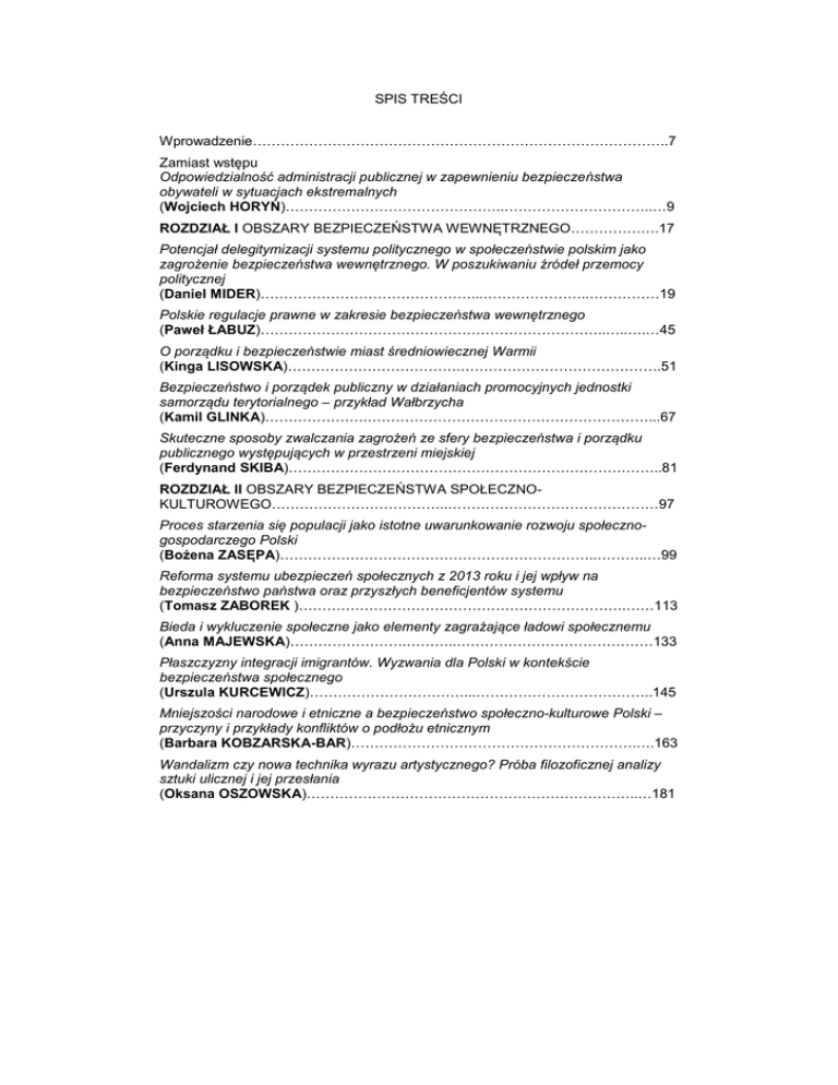 SPIS TREŚCI Wprowadzenie……………………………………………………………………………..7 Zamiast wstępu Odpowiedzialność administracji publicznej w zapewnieniu bezpieczeństwa obywateli w sytuacjach ekstremalnych (Wojciech HORYŃ)………………………………………..…………………………..…9 ROZDZIAŁ I OBSZARY BEZPIECZEŃSTWA WEWNĘTRZNEGO……………….17 Potencjał delegitymizacji systemu politycznego w społeczeństwie polskim jako zagrożenie bezpieczeństwa wewnętrznego. W poszukiwaniu źródeł przemocy politycznej (Daniel MIDER)………………………………………...…………………..……………19 Polskie regulacje prawne w zakresie bezpieczeństwa wewnętrznego (Paweł ŁABUZ)………………………………………………………………..…..….…45 O porządku i bezpieczeństwie miast średniowiecznej Warmii (Kinga LISOWSKA)……………………………….…………………………………….51 Bezpieczeństwo i porządek publiczny w działaniach promocyjnych jednostki samorządu terytorialnego – przykład Wałbrzycha (Kamil GLINKA)………………….……………………………………………………...67 Skuteczne sposoby zwalczania zagrożeń ze sfery bezpieczeństwa i porządku publicznego występujących w przestrzeni miejskiej (Ferdynand SKIBA)……………………………………………………………………..81 ROZDZIAŁ II OBSZARY BEZPIECZEŃSTWA SPOŁECZNOKULTUROWEGO………………………………..………………………………………97 Proces starzenia się populacji jako istotne uwarunkowanie rozwoju społecznogospodarczego Polski (Bożena ZASĘPA)…………………………………………………………..………..…99 Reforma systemu ubezpieczeń społecznych z 2013 roku i jej wpływ na bezpieczeństwo państwa oraz przyszłych beneficjentów systemu (Tomasz ZABOREK )…………………………………………………………….……113 Bieda i wykluczenie społeczne jako elementy zagrażające ładowi społecznemu (Anna MAJEWSKA)…………………….………..……………………………………133 Płaszczyzny integracji imigrantów. Wyzwania dla Polski w kontekście bezpieczeństwa społecznego (Urszula KURCEWICZ)……………………………...………………………………..145 Mniejszości narodowe i etniczne a bezpieczeństwo społeczno-kulturowe Polski – przyczyny i przykłady konfliktów o podłożu etnicznym (Barbara KOBZARSKA-BAR)…………………………………………………….….163 Wandalizm czy nowa technika wyrazu artystycznego? Próba filozoficznej analizy sztuki ulicznej i jej przesłania (Oksana OSZOWSKA)……………………………………………………………..…181 ROZDZIAŁ III OBSZARY BEZPIECZEŃSTWA EKOLOGICZNEGO.…...………199 Bezpieczeństwo ekologiczne w Polsce po transformacji ustrojowej (Christoph BRELA)……………………………………………………………………201 Współpraca gospodarcza a bezpieczeństwo ekologiczne krajów ASEM (Agnieszka DRZYMAŁA)……………………………..………………………………211 Ekologiczne aspekty bezpieczeństwa lokalnego (Waldemar KOZACZYŃSKI)……………………………..…………………..………225 Bezpieczna i przyjazna dla środowiska energia elektryczna wytwarzana z paneli fotowoltaicznych (Paweł MATUSZCZYK, Tomasz POPŁAWSKI, Janusz FLASZA)…..…………241 Bezpieczeństwo ekologiczne w Ustawie Prawo wodne (Beata WALCZAK)………………………………………………….…………………255 Zrównoważona gospodarka wodno-ściekowa jako element poprawy bezpieczeństwa ekologicznego (Danuta LIPIŃSKA)………………………………..…………………..………………265 ROZDZIAŁ IV RÓŻNORODNE ASPEKTY BEZPIECZEŃSTWA…………………279 Bezpieczeństwo energetyczne w relacjach polsko-czeskich (Paulina BŁAŻEJEWSKA)……………………….……………………………..……281 Analiza bezpieczeństwa podczas Pieszej Pielgrzymki Tarnowskiej na Jasną Górę (Edyta SIKORA, Marcin KRAUSE)…………………………………….……...……289 Wpływ kultury Islamu na bezpieczeństwo zdrowotne kobiet. Wybrane zagadnienia (Agnieszka Hanna NAPIERALSKA, Sebastian NIEDZWIECKI)……..…………301 Obowiązki kwalifikowanego pracownika ochrony fizycznej i mienia w procesie i z perspektywy bezpieczeństwa (Justyna SZLACHTA-MISZTAL)…………………………….………………………319 Idea, cele i funkcje środków zabezpieczających (Beata PIOTROWSKA)……………………………………………………..…………327 Charakterystyka wybranych metod analizy ryzyka bezpieczeństwa informacji (Michał PAŁĘGA)………………………………………………………...……………345 W miejsce zakończenia Chrześcijanin a GMO (Mirosław TWARDOWSKI)…………………………………………………...………355 Noty o autorach………………………………………………………………..………367