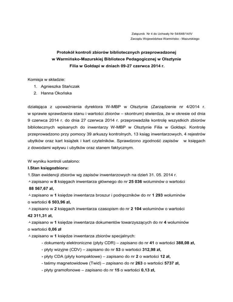 Załącznik Nr 4 do Uchwały Nr 54/648/14/IV Zarządu Województwa Warmińsko - Mazurskiego Protokół kontroli zbiorów bibliotecznych przeprowadzonej w Warmińsko-Mazurskiej Bibliotece Pedagogicznej w Olsztynie Filia w Gołdapi w dniach 09-27 czerwca 2014 r. Komisja w składzie: 1. Agnieszka Stańczak 2. Hanna Okońska działająca z upoważnienia dyrektora W-MBP w Olsztynie (Zarządzenie nr 4/2014 r. w sprawie sprawdzenia stanu i wartości zbiorów – skontrum) stwierdza, że w okresie od dnia 9 czerwca 2014 r. do dnia 27 czerwca 2014 r. przeprowadziła kontrolę wszystkich zbiorów bibliotecznych wpisanych do inwentarzy W-MBP w Olsztynie Filia w Gołdapi. Kontrolę przeprowadzono przy pomocy 39 arkuszy kontrolnych, 13 ksiąg inwentarzowych, 4 rejestrów ubytków oraz kart książek i kart czytelników. Sprawdzono zgodność zapisów w księgach z dowodami wpływu i ubytków oraz stanem faktycznym. W wyniku kontroli ustalono: I.Stan księgozbioru: 1.Stan ewidencji zbiorów wg zapisów inwentarzowych na dzień 31. 05. 2014 r. zapisano w 8 księgach inwentarza głównego do nr 25 036 woluminów o wartości 88 567,67 zł, zapisano w 1 księdze inwentarza broszur i podręczników do nr 1 293 woluminów o wartości 6 503,96 zł, zapisano w 2 księgach inwentarza czasopism do nr 2 104 woluminów o wartości 42 311,31 zł, zapisano w 1 księdze inwentarza dokumentów towarzyszących do nr 4 woluminów o wartości 0,06 zł zapisano w 1 księdze inwentarza zbiorów specjalnych: - dokumenty elektroniczne (płyty CDR) – zapisano do nr 41 o wartości 388,08 zł, - płyty wizyjne (CDV) – zapisano do nr 53 o wartości 312,98 zł, - płyty CDA (płyty kompaktowe) – zapisano do nr 2 o wartości 12 zł, - taśmy magnetowidowe (Twid) – zapisano do nr 263 o wartości 5737 zł, - płyty gramofonowe – zapisano do nr 15 o wartości 0,13 zł, - taśmy magnetofonowe – zapisano do nr 52 o wartości 8,10 zł. - mapy – zapisano do nr 3 o wartości 21 zł • zapisano w rejestrze ubytków książek do nr 7 610 woluminów o wartości 3 190,34 zł, • zapisano w rejestrze ubytków broszur i podręczników do nr 240 woluminów o wartości 320,45 zł, • zapisano w rejestrze ubytków czasopism do nr 126 woluminów o wartości 5,60 zł, • zapisano w rejestrze ubytków zbiorów specjalnych i dokumentów towarzyszących: - dokumenty towarzyszące zapisano do nr 4 o wartości 0,06 zł, - płyty gramofonowe zapisano do nr 15 o wartości 0,13 zł, - taśmy magnetofonowe zapisano do nr 52 o wartości 8,10 zł, - mapy zapisano do nr 3 o wartości 21 zł. 2. Stan zbiorów w dniu kontroli: książek…………………….. ogólnej wartości 85 377,33 zł broszur i podręczników…… ogólnej wartości 6 183,51 zł czasopism…………………. ogólnej wartości 42 305,71 zł zbiorów specjalnych ……… ogólnej wartości 6 450,05 zł II. Stan faktyczny zbiorów: 1. Stan faktyczny książek: Na półkach - 16 113 woluminów Wypożyczone przez czytelników - 1 313 woluminów Razem - 17 426 woluminów o wartości 85 377,33 zł Braków bezwzględnych oraz względnych nie stwierdzono. 2. Stan faktyczny broszur i podręczników: Na półkach - 1 030 woluminów Wypożyczone przez czytelników - 23 woluminy Razem – 1 053 woluminy o wartości 6 183,51 zł Braków bezwzględnych oraz względnych nie stwierdzono. 3. Stan faktyczny czasopism: Na półkach - 1 976 woluminów Wypożyczone przez czytelników - 2 woluminy Razem – 1 978 woluminów o wartości 42 305,71 zł Braków bezwzględnych oraz względnych nie stwierdzono. 4. Stan faktyczny dokumentów towarzyszących – 0 5. Stan faktyczny zbiorów specjalnych – 359 j. inw. o wartości 6 450, 06 zł W tym: • Dokumenty elektroniczne (płyty CDR): Na półkach - 39 j. inw. Wypożyczone przez czytelników - 2 j. inw. Razem – 41 j. inw. o wartości 388,08 zł Braków bezwzględnych oraz względnych nie stwierdzono. • Płyty wizyjne (CDV): Na półkach - 53 j.inw. Wypożyczone przez czytelników – 0 Razem – 53 j.inw. o wartości 312,98 zł Braków bezwzględnych oraz względnych nie stwierdzono. • Płyty CDA (kompaktowe): Na półkach - 2 j.inw. Wypożyczone przez czytelników – 0 Razem – 2 j.inw. o wartości 12 zł Braków bezwzględnych oraz względnych nie stwierdzono. • Taśmy magnetowidowe (Twid): Na półkach - 247 j.inw. Wypożyczone przez czytelników – 16 j.inw. Razem – 263 j.inw. o wartości 5 737 zł Braków bezwzględnych oraz względnych nie stwierdzono. • Płyty gramofonowe – 0 • Taśmy magnetofonowe – 0 • Mapy - 0 III. Ogólny stan zbiorów bibliotecznych (książek, broszur, podręczników, czasopism) na dzień 31 maja 2014 r. wynosi 20 454 woluminy o wartości 133 866,55 zł. Ogólny stan zbiorów specjalnych wynosi 359 j. inw. o wartości 6 450,06 zł.