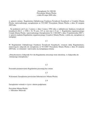 Zarządzenie Nr 1902/08 Prezydenta Miasta Płocka z dnia 08 maja 2008 roku w sprawie zmiany Regulaminu Zakładowego Funduszu Świadczeń Socjalnych w Urzędzie Miasta Płocka wprowadzonego zarządzeniem nr 915/2007 Prezydenta Miasta Płocka z dnia 20 sierpnia 2007roku Na podstawie art.8 ust. 2 ustawy z dnia 4 marca 1994 roku o zakładowym funduszu świadczeń socjalnych (Dz.U. z 1996 r. Nr 70, poz. 335 ze zm) oraz § 8 ust. 1 Regulaminu organizacyjnego Urzędu Miasta Płocka wprowadzonego Zarządzeniem Nr 1140/2007 z dnia 19 października 2007 r. w sprawie nadania Regulaminu organizacyjnego Urzędowi Miasta Płocka z późn.zm, zarządzam co następuje: §1 W Regulaminie Zakładowego Funduszu Świadczeń Socjalnych, zwanym dalej Regulaminem, stanowiącym załącznik do zarządzenia nr 915/2007 Prezydenta Miasta Płocka z dnia 20 sierpnia 2007roku ze zmianami wprowadza się następującą zmianę: „Dotychczasowy Załącznik Nr 4 do Regulaminu otrzymuje treść określoną w Załączniku do niniejszego Zarządzenia.” §2 Pozostałe postanowienia Regulaminu pozostają bez zmian. §3 Wykonanie Zarządzenia powierzam Sekretarzowi Miasta Płocka. §4 Zarządzenie wchodzi w życie z dniem podpisania. Prezydent Miasta Płocka /-/ Mirosław Milewski Załącznik do Zarządzenia Nr 1902/08 Prezydenta Miasta Płocka z dnia 08 maja 2008r. Załącznik nr 4 ................................................................................. do Regulaminu Zakładowego Funduszu Świadczeń Socjalnych ( Nazwisko i imię pracownika/emeryta/rencisty lub innej uprawnionej osoby) ........................................................................................... (stanowisko i nr telefonu) *........................................................... (komórka organizacyjna UM Płocka, gminna jednostka organizacyjna) Wniosek o przyznanie dofinansowania do imprez rekreacyjnych i integracyjnych organizowanych przez Pracodawcę oraz biletu wstępu do: Teatru, Kina, Muzeum, Galerii, Amfiteatru, Orkiestry Symfonicznej oraz imprez sportowych Proszę o przyznanie dofinansowania do ..........(szt.) biletu/ów wstępu do kina, teatru, muzeum, galerii, amfiteatru, orkiestry symfonicznej, imprez rekreacyjnych, integracyjnych dla mnie i uprawnionych członków rodziny: małżonka i dzieci............................................................................. ................................................................................................................................................................ (podać imiona i nazwiska dzieci, małżonka) Oświadczam, że: 1. Miesięczny dochód rodziny przypadający na członka rodziny z ostatnich 3 miesięcy (przypadających przed miesiącem złożenia wniosku) wynosi ........................zł i mieści się w przedziale: 1) do 1000 zł , 2) od 1001- 2000 zł, 3) powyżej 2000zł. 2. Cena jednego biletu wynosi .......................zł. 3. Powyższe dane składam świadomy(a), za podanie nieprawdy lub zatajenia prawdy grozi odpowiedzialność. 4. Przyjmuję do wiadomości, iż w przypadku stwierdzenia złożenia nierzetelnych danych w oświadczeniu lub wykorzystania środków niezgodnie z ich przeznaczeniem, świadczenie będzie podlegało zwrotowi wraz z należnymi ustawowymi odsetkami, poczynając od dnia otrzymania świadczenia oraz nastąpi utrata prawa do korzystania z Funduszu przez kolejne dwa okresy, w których można otrzymać dofinansowanie. 5. W przypadku wystąpienia sytuacji, o której mowa w pkt 4, oświadczam, że wyrażam zgodę na potrącanie z mojego wynagrodzenia kwoty dofinansowania wraz odsetkami zgodnie z przepisami kodeksu pracy.* *- dotyczy pracownika .................................................. (data i podpis wnioskodawcy) Decyzja Pracodawcy o przyznaniu świadczeniu 6. Przyznano dofinansowanie: (z wyjątkiem ust. 7) - 70 %ceny biletu.....................x...........(szt.) =................ - w przedziale dochodowym do 1000 zł - 50 %ceny biletu ....................x...........(szt.) =.................- w przedziale dochodowym od 1001-2000 zł - 25 % ceny biletu ...................x...........(szt.)=..................- w przedziale dochodowym powyżej 2000 zł – nie przyznano dofinansowania. 7. Wysokość dopłaty do imprez rekreacyjnych i integracyjnych będzie uzależniona od aktualnie posiadanych środków ZFŚS, uzgodniona z przedstawicielem Załogi z uwzględnieniem dochodu pracownika, o którym mowa w ust. 1 ......................................................... (data i podpis pracodawcy) ** Miesięczny dochód wylicza się dzieląc dochody w rodzinie z ostatnich trzech miesięcy (przypadających przed miesiącem złożenia wniosku) przez trzy, następnie uzyskany wynik dzieli się przez ilość osób w rodzinie uprawnionych do korzystania ze świadczeń socjalnych (do wyliczenia dochodu wlicza się dzieci do 24 lat, będące na utrzymaniu pracownika). Za dochód (przychody – po odliczeniu kosztów uzyskania, składek na ubezpieczenie społeczne i zdrowotne oraz podatku dochodowego, bez wypłat jednorazowych) w rodzinie uważa się dochody pracownika i małżonka, alimenty, renty na rzecz dzieci oraz dochody z tytułu posiadania gospodarstwa rolnego. Nie należy pomniejszać dochodu o potracenia jakimi są (m.in. spłaty pożyczek z ZFŚS, Kasy Zapomogowo-Pożyczkowe oraz inne potracenia np. opłaty za ubezpieczenie zdrowotne - PZU, opiekę lekarska z MWOMP) uwzględnione w comiesięcznym zestawieniu dotyczącym wynagrodzenia pracownika. *** dotyczy pracownika
