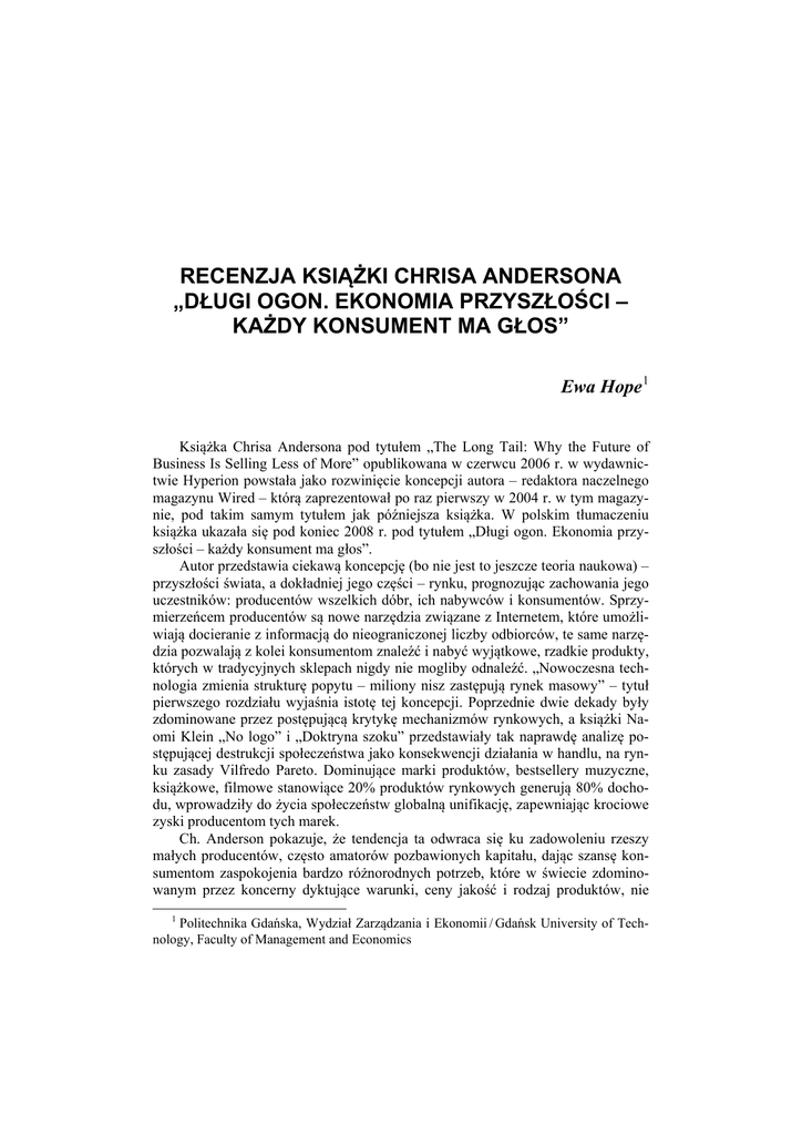 RECENZJA KSIĄŻKI CHRISA ANDERSONA „DŁUGI OGON. EKONOMIA PRZYSZŁOŚCI – KAŻDY KONSUMENT MA GŁOS” Ewa Hope 1 Książka Chrisa Andersona pod tytułem „The Long Tail: Why the Future of Business Is Selling Less of More” opublikowana w czerwcu 2006 r. w wydawnictwie Hyperion powstała jako rozwinięcie koncepcji autora – redaktora naczelnego magazynu Wired – którą zaprezentował po raz pierwszy w 2004 r. w tym magazynie, pod takim samym tytułem jak późniejsza książka. W polskim tłumaczeniu książka ukazała się pod koniec 2008 r. pod tytułem „Długi ogon. Ekonomia przyszłości – każdy konsument ma głos”. Autor przedstawia ciekawą koncepcję (bo nie jest to jeszcze teoria naukowa) – przyszłości świata, a dokładniej jego części – rynku, prognozując zachowania jego uczestników: producentów wszelkich dóbr, ich nabywców i konsumentów. Sprzymierzeńcem producentów są nowe narzędzia związane z Internetem, które umożliwiają docieranie z informacją do nieograniczonej liczby odbiorców, te same narzędzia pozwalają z kolei konsumentom znaleźć i nabyć wyjątkowe, rzadkie produkty, których w tradycyjnych sklepach nigdy nie mogliby odnaleźć. „Nowoczesna technologia zmienia strukturę popytu – miliony nisz zastępują rynek masowy” – tytuł pierwszego rozdziału wyjaśnia istotę tej koncepcji. Poprzednie dwie dekady były zdominowane przez postępującą krytykę mechanizmów rynkowych, a książki Naomi Klein „No logo” i „Doktryna szoku” przedstawiały tak naprawdę analizę postępującej destrukcji społeczeństwa jako konsekwencji działania w handlu, na rynku zasady Vilfredo Pareto. Dominujące marki produktów, bestsellery muzyczne, książkowe, filmowe stanowiące 20% produktów rynkowych generują 80% dochodu, wprowadziły do życia społeczeństw globalną unifikację, zapewniając krociowe zyski producentom tych marek. Ch. Anderson pokazuje, że tendencja ta odwraca się ku zadowoleniu rzeszy małych producentów, często amatorów pozbawionych kapitału, dając szansę konsumentom zaspokojenia bardzo różnorodnych potrzeb, które w świecie zdominowanym przez koncerny dyktujące warunki, ceny jakość i rodzaj produktów, nie 1 Politechnika Gdańska, Wydział Zarządzania i Ekonomii / Gdańsk University of Technology, Faculty of Management and Economics 56 Ewa Hope miałyby szans na realizację, tak jak choćby twórcy i odbiorcy muzyki alternatywnej, którzy zresztą jako pierwsi zaistnieli w długim ogonie zmian rynkowych… Nazwa koncepcji „długi ogon” pochodzi od kształtu wykresu w układzie współrzędnych XY, na którym początkowo wartość funkcji gwałtownie spada (oś pionowa Y) a następnie bardzo powoli maleje (oś X) zbliżając się do zera, ale nigdy go nie osiągając. Ten długi ogon zmierzający do zera może być bardzo gruby, mieszczący rzeszę oferentów–producentów i wcale nie musi – zgodnie z zasadą V. Pareto – stanowić tylko 20% udziału w rynku. Tak się dzieje, ponieważ jak zaobserwował Ch. Anderson, mamy do czynienia z nowymi zjawiskami jak przekształcanie się konsumentów w prosumentów, „zamazanie granicy między światem tworzącym a światem konsumującym twórczość”, narastanie więc „odnowy struktury uczestnictwa” [s. 123, 124], jak choćby poprzez uczestnictwo w crowdfundingu. Długi ogon to koncepcja, która wpisuje się w trendy odchodzenia od produktów markowych, globalnych, a tym samym unifikujących, które zdominowały w ostatnich 100 latach nie tylko rynek, ale i nasze umysły, na rzecz unikatowości, niepowtarzalności produktów i usług, swoistych nisz, w których każdy może zaoferować to, co produkuje i znaleźć to, czego poszukuje. Określenie „długi ogon” weszło na stałe do języka opisującego zjawiska rynkowe z punktu widzenia ekonomii, marketingu i zarządzania, ale trudno uznać koncepcję Andersona za pełną, koherentną teorię ekonomiczną, choć w jej badaniach brali udział naukowcy z MIT, Harvardu i Stanford Business School – jak pisze we wstępie do swojej książki. Autor w ciekawy sposób pokazuje nowe mechanizmy rynkowe, rewolucyjną rolę Internetu we wszystkich sferach życia społecznego, opisuje fenomen firm nowej generacji, jak Amazon, Microsoft i pokazuje zmieniającą się rolę public relations. Niestety, jak pokazały ostatnie lata, już po wydaniu książki handel internetowy producentów unikatowych produktów i ich użytkowników – poszukiwaczy takich unikatów, został zdeformowany przez wielkie koncerny, które dzięki ogromnym budżetom reklamowym wydawanym na opłacanie w wyszukiwarkach internetowych linków, ogólnych słów kluczy, w zakresie których mieszczą się też pojęcia, dotyczące tych niszowych produktów, kierują potencjalnych nabywców na swoje strony internetowe, oferujące markowe, „ometkowane” produkty. W efekcie, poszukujący produktów niszowych kierowani się na strony gigantów rynkowych – tych z zasady Paretto, a nie do producentów z długiego ogona... Na szczęście to tylko utrudnia, lecz nie uniemożliwia nabywania tych dóbr. A książka Ch. Andersona stała się bestsellerem, nie literaturą niszową…
