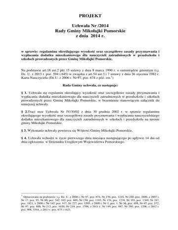 PROJEKT Uchwała Nr /2014 Rady Gminy Mikołajki Pomorskie z dnia 2014 r. w sprawie: regulaminu określającego wysokość oraz szczegółowe zasady przyznawania i wypłacania dodatku mieszkaniowego dla nauczycieli zatrudnionych w przedszkolu i szkołach prowadzonych przez Gminę Mikołajki Pomorskie. Na podstawie art.18 ust.2 pkt 15 ustawy z dnia 8 marca 1990 r. o samorządzie gminnym (t.j. Dz. U. z 2013 r. poz. 594 i 645) w związku z art.54 ust.3 i 7 ustawy z dnia 26 stycznia 1982 r. Karta Nauczyciela (Dz.U. z 2006 r. Nr 97, poz. 674 z póź. zm.1) Rada Gminy uchwala, co następuje: § 1. Uchwala się regulamin określający wysokość oraz szczegółowe zasady przyznawania i wypłacania dodatku mieszkaniowego dla nauczycieli zatrudnionych w przedszkolu i szkołach prowadzonych przez Gminę Mikołajki Pomorskie, w brzemieniu stanowiącym załącznik do niniejszej uchwały. § 2.Traci moc Uchwała Nr IV/30/02 z dnia 30 grudnia 2002 r. w sprawie regulaminu określającego wysokość oraz szczegółowe zasady przyznawania i wypłacania nauczycielskiego dodatku mieszkaniowego dla nauczycieli zatrudnionych w szkołach i przedszkolu na terenie gminy Mikołajki Pomorskie. § 3. Wykonanie uchwały powierza się Wójtowi Gminy Mikołajki Pomorskie. § 4. Uchwała wchodzi w życie pierwszego dnia miesiąca następującego po upływie 14 dni od dnia ogłoszenia w Dzienniku Urzędowym Województwa Pomorskiego. 1 Opracowano na podstawie: t.j. Dz. U. z 2006 r. Nr 97, poz. 674, Nr 170, poz. 1218, Nr 220, poz. 1600, z 2007 r. Nr 17, poz. 95, Nr 80, poz. 542, 102, poz. 689, Nr 158, poz. 1103, Nr 176, poz. 1238, Nr 191, poz. 1369, Nr 247, poz. 1821, z 2008 r. Nr 145, poz. 917, Nr 227, poz. 1505, z 2009 r. Nr 1, poz. 1, Nr 56, poz. 458, Nr 67, poz. 572, Nr 97, poz. 800, Nr 213, poz. 1650, Nr 219, poz. 1706, z 2011 r. Nr 149, poz. 887, Nr 205, poz. 1206, z 2012 r. poz. 908, 1544, z 2013 r. poz. 675 i 1421. Załącznik do Uchwały Nr /2014 Rady Gminy Mikołajki Pomorskie z dnia 2014 r. Regulamin określający wysokość oraz szczegółowe zasady przyznawania i wypłacania dodatku mieszkaniowego dla nauczycieli zatrudnionych w przedszkolu i szkołach prowadzonych przez Gminę Mikołajki Pomorskie. § 1. 1. Nauczycielowi, zatrudnionemu w wymiarze nie niższym niż połowa tygodniowego obowiązkowego wymiaru godzin w przedszkolu i szkołach prowadzonych przez Gminę Mikołajki Pomorskie i posiadającemu kwalifikacje wymagane do zajmowanego stanowiska nauczyciela, przysługuje nauczycielski dodatek mieszkaniowy uzależniony od liczby osób wspólnie z nim zamieszkujących i pozostających na jego wyłącznym utrzymaniu. 2. Wysokość nauczycielskiego dodatku mieszkaniowego, w zależności od liczby osób w rodzinie uprawnionego nauczyciela, wynosi miesięcznie: 1) przy jednej osobie – 10,00 zł; 2) przy dwóch osobach i więcej – 20,00 zł; 3. Do członków rodziny, o których mowa w ust. 2, zalicza się nauczyciela oraz wspólnie z nim zamieszkujących: 1) współmałżonka, pozostającego na wyłącznym utrzymaniu nauczyciela, 2) rodziców nauczyciela pozostających na wyłącznym utrzymaniu nauczyciela, 3) pozostające na utrzymaniu nauczyciela lub nauczyciela i jego małżonka dzieci do ukończenia 18 roku życia lub do czasu ukończenia przez nie szkoły ponadpodstawowej albo ponadgimnazjalnej, nie dłużej jednak niż do ukończenia 20 roku życia, 4) pozostające na utrzymaniu nauczyciela lub nauczyciela i jego małżonka niepracujące dzieci będące studentami, do czasu ukończenia studiów wyższych, nie dłużej jednak niż do ukończenia 25 roku życia, 5) dzieci niepełnosprawne nieposiadające własnego źródła dochodów. 4. O zaistniałej zmianie liczby członków rodziny, o których mowa w ust. 3, nauczyciel otrzymujący dodatek jest obowiązany niezwłocznie powiadomić dyrektora szkoły, a dyrektor otrzymujący dodatek – Wójta Gminy. W przypadku niepowiadomienia o zmianie liczby członków, nienależnie pobrane przez nauczyciela świadczenie podlega zwrotowi. 5. Nauczycielowi i jego współmałżonkowi zamieszkującemu z nim stale, będącemu także nauczycielem, przysługuje tylko jeden dodatek mieszkaniowy, w wysokości określonej w ust. 2. Małżonkowie wspólnie określają pracodawcę, który będzie im wypłacał ten dodatek. 6. Nauczycielowi zatrudnionemu w kilku szkołach (placówkach), dla których organem prowadzącym jest Gmina Mikołajki Pomorskie, przysługuje tylko jeden dodatek, wypłacany przez pracodawcę wskazanego przez nauczyciela. § 2. 1. Nauczycielski dodatek mieszkaniowy przyznaje się na wniosek nauczyciela, a przypadku nauczycieli, o których mowa w ust.6, na ich wspólny wniosek. Nauczycielowi dodatek przyznaje dyrektor, a dyrektorowi – Wójt Gminy. Wzór wniosku stanowi załącznik do regulaminu. 1. Nauczycielski dodatek mieszkaniowy przysługuje nauczycielowi: 1) niezależnie od tytułu prawnego do zajmowanego przez niego lokalu mieszkalnego, 2) od pierwszego dnia miesiąca następującego po miesiącu, w którym złożono wniosek o jego przyznanie. 2. W razie rozwiązania stosunku pracy z nauczycielem, nauczycielski dodatek mieszkaniowy przysługuje do końca miesiąca, który był ostatnim miesiącem pracy nauczyciela. § 3. 1. Nauczycielski dodatek mieszkaniowy przysługuje w okresie wykonywania pracy, a także w okresach: 1) nie świadczenia pracy, za które przysługuje wynagrodzenie, 2) pobierania zasiłku z ubezpieczenia społecznego, 3) odbywania zasadniczej służby wojskowej, przeszkolenia wojskowego, okresowej służby wojskowej: w przypadku jednak, gdy z nauczycielem powołanym do służby zawarta była umowa o pracę na czas określony, dodatek wypłaca się nie dłużej niż do końca okresu, na który umowa ta była zawarta, 4) korzystania z urlopu wychowawczego. § 4.1. Wypłata nauczycielskiego dodatku mieszkaniowego następuje przelewem na indywidualne konto bankowe pracownika. 2. Nauczycielski dodatek mieszkaniowy wypłaca się miesi