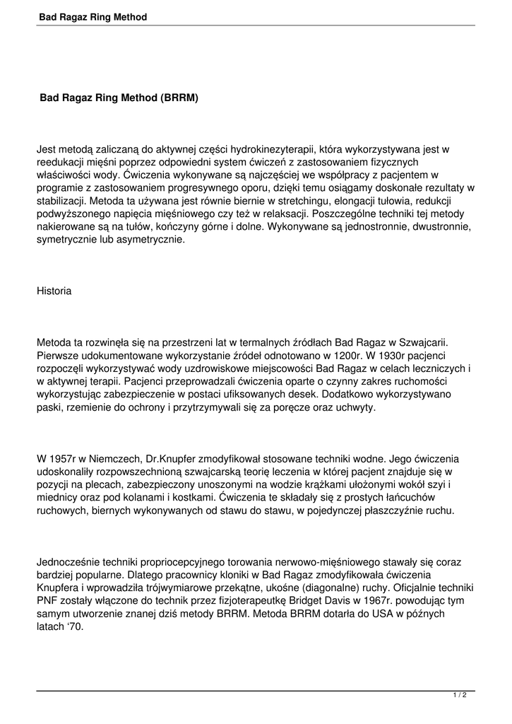 Bad Ragaz Ring Method Bad Ragaz Ring Method (BRRM) Jest metodą zaliczaną do aktywnej części hydrokinezyterapii, która wykorzystywana jest w reedukacji mięśni poprzez odpowiedni system ćwiczeń z zastosowaniem fizycznych właściwości wody. Ćwiczenia wykonywane są najczęściej we współpracy z pacjentem w programie z zastosowaniem progresywnego oporu, dzięki temu osiągamy doskonałe rezultaty w stabilizacji. Metoda ta używana jest równie biernie w stretchingu, elongacji tułowia, redukcji podwyższonego napięcia mięśniowego czy też w relaksacji. Poszczególne techniki tej metody nakierowane są na tułów, kończyny górne i dolne. Wykonywane są jednostronnie, dwustronnie, symetrycznie lub asymetrycznie. Historia Metoda ta rozwinęła się na przestrzeni lat w termalnych źródłach Bad Ragaz w Szwajcarii. Pierwsze udokumentowane wykorzystanie źródeł odnotowano w 1200r. W 1930r pacjenci rozpoczęli wykorzystywać wody uzdrowiskowe miejscowości Bad Ragaz w celach leczniczych i w aktywnej terapii. Pacjenci przeprowadzali ćwiczenia oparte o czynny zakres ruchomości wykorzystując zabezpieczenie w postaci ufiksowanych desek. Dodatkowo wykorzystywano paski, rzemienie do ochrony i przytrzymywali się za poręcze oraz uchwyty. W 1957r w Niemczech, Dr.Knupfer zmodyfikował stosowane techniki wodne. Jego ćwiczenia udoskonaliły rozpowszechnioną szwajcarską teorię leczenia w której pacjent znajduje się w pozycji na plecach, zabezpieczony unoszonymi na wodzie krążkami ułożonymi wokół szyi i miednicy oraz pod kolanami i kostkami. Ćwiczenia te składały się z prostych łańcuchów ruchowych, biernych wykonywanych od stawu do stawu, w pojedynczej płaszczyźnie ruchu. Jednocześnie techniki propriocepcyjnego torowania nerwowo-mięśniowego stawały się coraz bardziej popularne. Dlatego pracownicy kloniki w Bad Ragaz zmodyfikowała ćwiczenia Knupfera i wprowadziła trójwymiarowe przekątne, ukośne (diagonalne) ruchy. Oficjalnie techniki PNF zostały włączone do technik przez fizjoterapeutkę Bridget Davis w 1967r. powodując tym samym utworzenie znanej dziś metody BRRM. Metoda BRRM dotarła do USA w późnych latach ‘70. 1/2 Bad Ragaz Ring Method BRRM w Polsce. Metoda ta została wprowadzona przez Annę Banaś (Radom) i Tomasza Zagórskiego (Kraków) w 2011 roku, którzy jako pierwsi ukończyli specjalistyczne szkolenie BRRM w Klinice w Valens, położonej tuż nad Bad Ragaz. Szkolenie prowadzone było przez Ursa Gampera i Johana Lambecka. 2/2