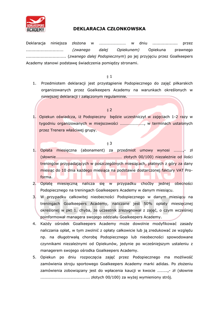 DEKLARACJA CZŁONKOWSKA Deklaracja niniejsza ............................ złożona w (zwanego ……………………… dalej w dniu Opiekunem) ................... Opiekuna przez prawnego .............................. (zwanego dalej Podopiecznym) po jej przyjęciu przez Goalkeepers Academy stanowi podstawę świadczenia pomiędzy stronami. §1 1. Przedmiotem deklaracji jest przystąpienie Podopiecznego do zajęć piłkarskich organizowanych przez Goalkeepers Academy na warunkach określonych w niniejszej deklaracji i załączonym regulaminie. §2 1. Opiekun oświadcza, iż Podopieczny będzie uczestniczył w zajęciach 1-2 razy w tygodniu organizowanych w miejscowości ……………………, w terminach ustalonych przez Trenera właściwej grupy. §3 1. Opłata miesięczna (abonament) za przedmiot umowy wynosi ………,- zł (słownie………………………………………………………… złotych 00/100) niezależnie od ilości treningów przypadających w poszczególnych miesiącach, płatnych z góry za dany miesiąc do 10 dnia każdego miesiąca na podstawie dostarczonej faktury VAT Proforma. 2. Opłatę miesięczną nalicza się w przypadku choćby jednej obecności Podopiecznego na treningach Goalkeepers Academy w danym miesiącu. 3. W przypadku całkowitej nieobecności Podopiecznego w danym miesiącu na treningach Goalkeepers Academy, naliczane jest 50% opłaty miesięcznej określonej w pkt 1. chyba, że uczestnik zrezygnował z zajęć, o czym wcześniej poinformował managera swojego oddziału Goalkeepers Academy. 4. Każdy ośrodek Goalkeepers Academy może dowolnie modyfikować zasady naliczania opłat, w tym zwolnić z opłaty całkowicie lub ją zredukować ze względu np. na długotrwałą chorobę Podopiecznego lub nieobecności spowodowane czynnikami niezależnymi od Opiekunów, jedynie po wcześniejszym ustaleniu z managerem swojego ośrodka Goalkeepers Academy. 5. Opiekun po dniu rozpoczęcia zajęć przez Podopiecznego ma możliwość zamówienia stroju sportowego Goalkeepers Academy marki adidas. Po złożeniu zamówienia zobowiązany jest do wpłacenia kaucji w kwocie ……….,- zł (słownie …………………………………………. złotych 00/100) za wyżej wymieniony strój. 6. Kaucja, o której mowa w punkcie 2 zostanie zwrócona Opiekunowi w przypadku, rezygnacji z uczestnictwa w zajęciach swojego Podopiecznego do końca miesiąca kalendarzowego, w którym strój zamówił, jeśli stroju nie otrzymał. 7. W chwili otrzymania stroju przez Opiekuna przechodzi on na własność Opiekuna, a wniesiona kaucja zostaje zaliczona jako cena należna Goalkeepers Academy. §4 1. Opiekun potwierdza, że zapoznał się z regulaminem Goalkeepers Academy, który stanowi integralną część niniejszej deklaracji, akceptując go bez zastrzeżeń. Goalkeepers Academy zobowiązuje się powiadomić Opiekuna o wszelkich zmianach regulaminu na piśmie. 2. Formularz zgłoszeniowy wypełniony przez Opiekuna stanowi integralną część niniejszej deklaracji. Opiekun zobowiązuje się powiadomić Goalkeepers Academy o każdej zmianie informacji zawartych w formularzu. §5 Opiekun oświadcza, iż Podopieczny został poddany stosownym badaniom oraz, że stan zdrowia Podopiecznego jest dobry i umożliwia mu udział w treningach, a nadto oświadcza, iż nie są mu znane jakiekolwiek przeciwwskazania do udziału Podopiecznego w treningach Goalkeepers Academy. §6 1. Opiekun wyraża zgodę na wykorzystywanie wizerunku podopiecznego w zakresie promocji marki Goalkeepers Academy oraz podmiotów współpracujących, produktów oferowanych przez Goalkeepers Academy i podmioty współpracujące. 2. Podmiotami współpracującymi w rozumieniu niniejszej deklaracji są: adidas Poland sp. z o.o., North Coast (przedstawiciel marki Isostar w Polsce), Learning Systems Poland (właściciel marki empik school), Playarena sp. z o.o. oraz pozostali wymienienii na stronie internetowej www.gkacademy.pl §7 1. W sprawach nieuregulowanych niniejszą deklaracją zastosowanie mają właściwe przepisy. §8 1. Niniejsza deklaracja została sporządzona w dwóch jednobrzmiących egzemplarzach po jednym dla Opiekuna i Goalkeepers Academy. ................................... Data i podpis Opiekuna