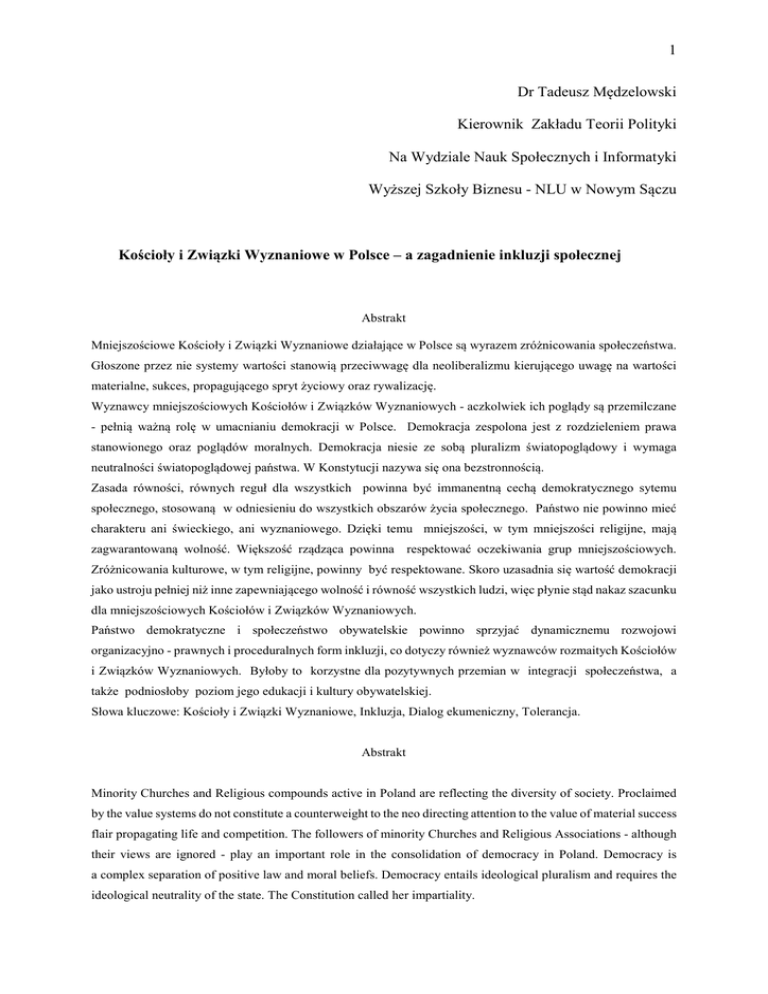 1 Dr Tadeusz Mędzelowski Kierownik Zakładu Teorii Polityki Na Wydziale Nauk Społecznych i Informatyki Wyższej Szkoły Biznesu - NLU w Nowym Sączu Kościoły i Związki Wyznaniowe w Polsce – a zagadnienie inkluzji społecznej Abstrakt Mniejszościowe Kościoły i Związki Wyznaniowe działające w Polsce są wyrazem zróżnicowania społeczeństwa. Głoszone przez nie systemy wartości stanowią przeciwwagę dla neoliberalizmu kierującego uwagę na wartości materialne, sukces, propagującego spryt życiowy oraz rywalizację. Wyznawcy mniejszościowych Kościołów i Związków Wyznaniowych - aczkolwiek ich poglądy są przemilczane - pełnią ważną rolę w umacnianiu demokracji w Polsce. Demokracja zespolona jest z rozdzieleniem prawa stanowionego oraz poglądów moralnych. Demokracja niesie ze sobą pluralizm światopoglądowy i wymaga neutralności światopoglądowej państwa. W Konstytucji nazywa się ona bezstronnością. Zasada równości, równych reguł dla wszystkich powinna być immanentną cechą demokratycznego sytemu społecznego, stosowaną w odniesieniu do wszystkich obszarów życia społecznego. Państwo nie powinno mieć charakteru ani świeckiego, ani wyznaniowego. Dzięki temu mniejszości, w tym mniejszości religijne, mają zagwarantowaną wolność. Większość rządząca powinna respektować oczekiwania grup mniejszościowych. Zróżnicowania kulturowe, w tym religijne, powinny być respektowane. Skoro uzasadnia się wartość demokracji jako ustroju pełniej niż inne zapewniającego wolność i równość wszystkich ludzi, więc płynie stąd nakaz szacunku dla mniejszościowych Kościołów i Związków Wyznaniowych. Państwo demokratyczne i społeczeństwo obywatelskie powinno sprzyjać dynamicznemu rozwojowi organizacyjno - prawnych i proceduralnych form inkluzji, co dotyczy również wyznawców rozmaitych Kościołów i Związków Wyznaniowych. Byłoby to korzystne dla pozytywnych przemian w integracji społeczeństwa, a także podniosłoby poziom jego edukacji i kultury obywatelskiej. Słowa kluczowe: Kościoły i Związki Wyznaniowe, Inkluzja, Dialog ekumeniczny, Tolerancja. Abstrakt Minority Churches and Religious compounds active in Poland are reflecting the diversity of society. Proclaimed by the value systems do not constitute a counterweight to the neo directing attention to the value of material success flair propagating life and competition. The followers of minority Churches and Religious Associations - although their views are ignored - play an important role in the consolidation of democracy in Poland. Democracy is a complex separation of positive law and moral beliefs. Democracy entails ideological pluralism and requires the ideological neutrality of the state. The Constitution called her impartiality. 2 The principle of equality, equal rules for all should be an inherent feature of democratic social system, applicable to all areas of social life. You should not have a character or a secular or religious. Thanks to minorities, including religious minorities are guaranteed freedom. The majority ruling should respect the expectations of minority groups. Cultural diversity, including religious, should be respected. If justified by the value of democracy as a political system more fully than others providing freedom and equality of all people, so fluid hence warrant respect for minority Churches and Religious Associations. The democratic state and civil society should promote the dynamic development of organizational, legal and procedural forms inclusions which also applies to believers of various Churches and Religious Associations. It would be beneficial to positive changes in social integration, as well as improve the level of his education and civic culture. Keywords: Churches and Religious compounds, Inclusion, ecumenical dialogue, tolerance. Tekst Mniejszości religijne w Polsce są znane jedynie fragmentarycznie. Panuje potoczny pogląd, że żyją w Polsce wyznawcy zaledwie kilku wyznań. Powodów takiego stanu rzeczy jest wiele. Media nie informują ani o wielości wyznań, ani też nie propagują tolerancji wobec nich, co jest niepokojące. Ponadto nie ma wątpliwości, że w niedalekiej przyszłości nasilą się procesy migracyjne, co spowoduje znacznie większą niż obecnie różnorodność wyznań religijnych w Polsce. Do rejestru Kościołów i Związków Wyznaniowych w Polsce wpisane jest obecnie 159 różnorodnych wyznań chrześcijańskich i niechrześcijańskich. W 2013 roku zostały wpisane do rejestru dwa Związki Wyznaniowe: Wyznawcy Słońca i Staroprawosławna Cerkiew Staroobrzędowców. Poza wieloma odmianami religii chrześcijańskiej funkcjonują w Polsce przedstawiciele wyznań niechrześcijańskich i pojawiły się też Związki Wyznaniowe odradzające wierzenia słowiańskie, czyli pogańskie. Należy też pamiętać, że żyją w Polsce osoby bezwyznaniowe, agnostycy oraz ateiści. Wspomniana rejestracja nie jest konieczna, jeżeli chodzi o swobodę odbywania praktyk religijnych. Obowiązujące prawo zapewnia wolność wyznania, głoszenia 3 i sprawowania kultu religijnego niezależnie od tego czy wyznanie jest formalnie zarejestrowane. Rejestry nie dają pełnego obrazu wszystkich związków wyznaniowych, bowiem niektóre wyznania zrzeszone są we wspólnotach. Wspólnota Kościołów Chrystusowych wpisana do rejestru 01.02.1990 roku skupia 30 zborów i 14 stacji misyjnych. Podstawową jednostką organizacyjno - prawną Związku Wyznaniowego jest zbór. Zbory są autonomiczne, posiadają osobowość prawną i samodzielnie dysponują swoim majątkiem. Wspólnota liczy około 6 tysięcy wiernych. Stowarzyszenie Zborów Chrześcijan wpisane do rejestru Kościołów i Związków Wyznaniowych pod obecną nazwą 11.01.1990 roku /wcześniej jako Zbór Chrześcijan bez Osobliwego Wyznania/, ma charakter porozumienia niezależnych od siebie zborów. Liczy około 15 zborów. Kościół Chrześcijan Wiary Ewangeliczne